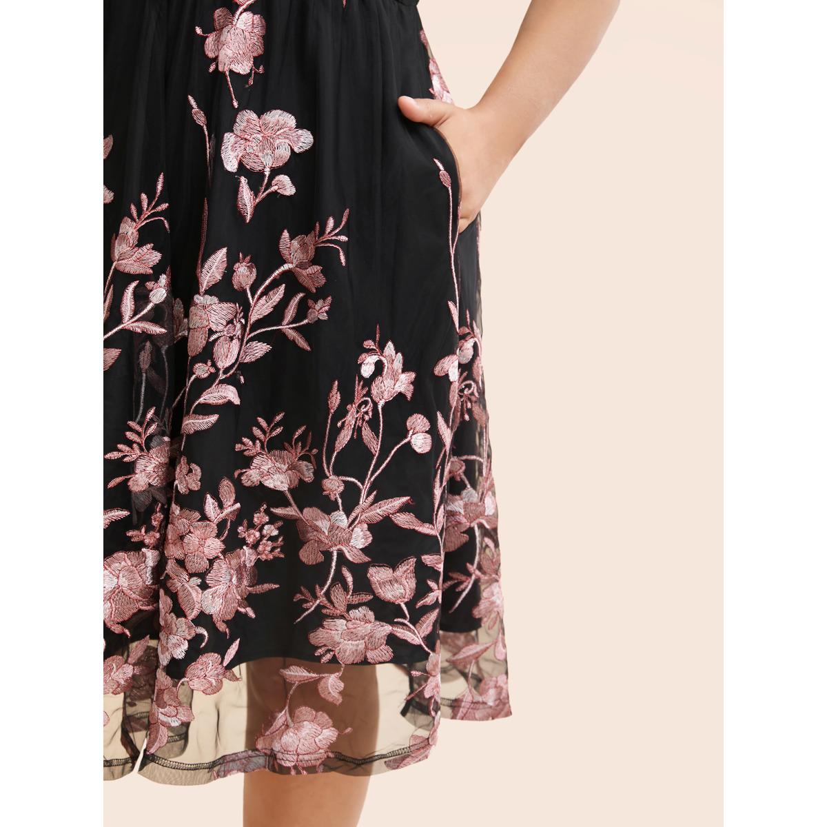 Plus Size Floral Embroidery Belted Midi Dress Black Women Formal Embroidered V-neck Sleeveless Curvy BloomChic 30/6X