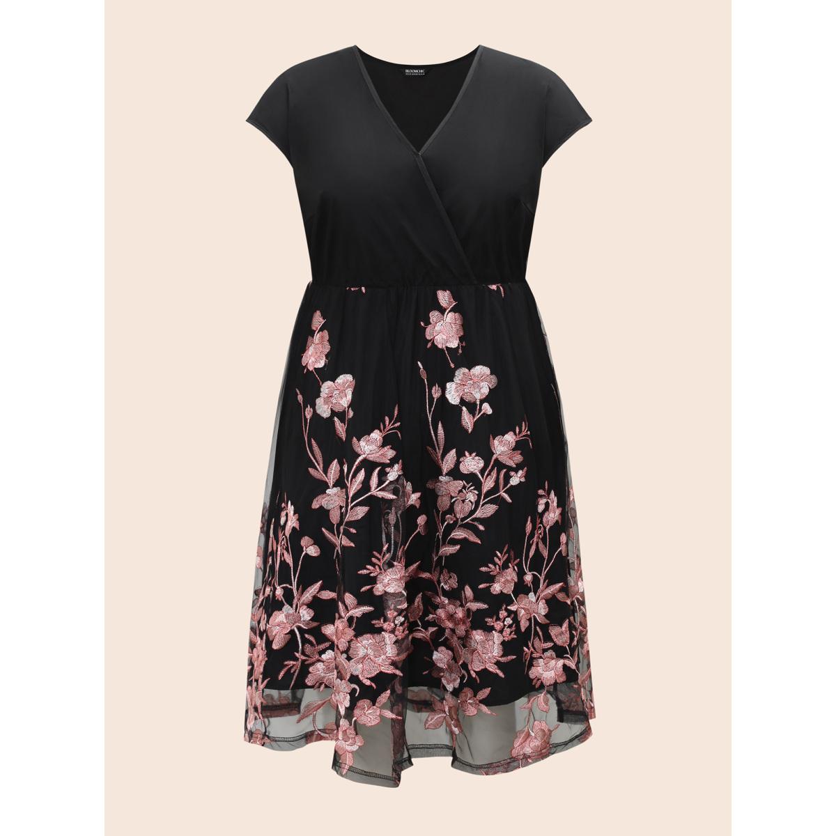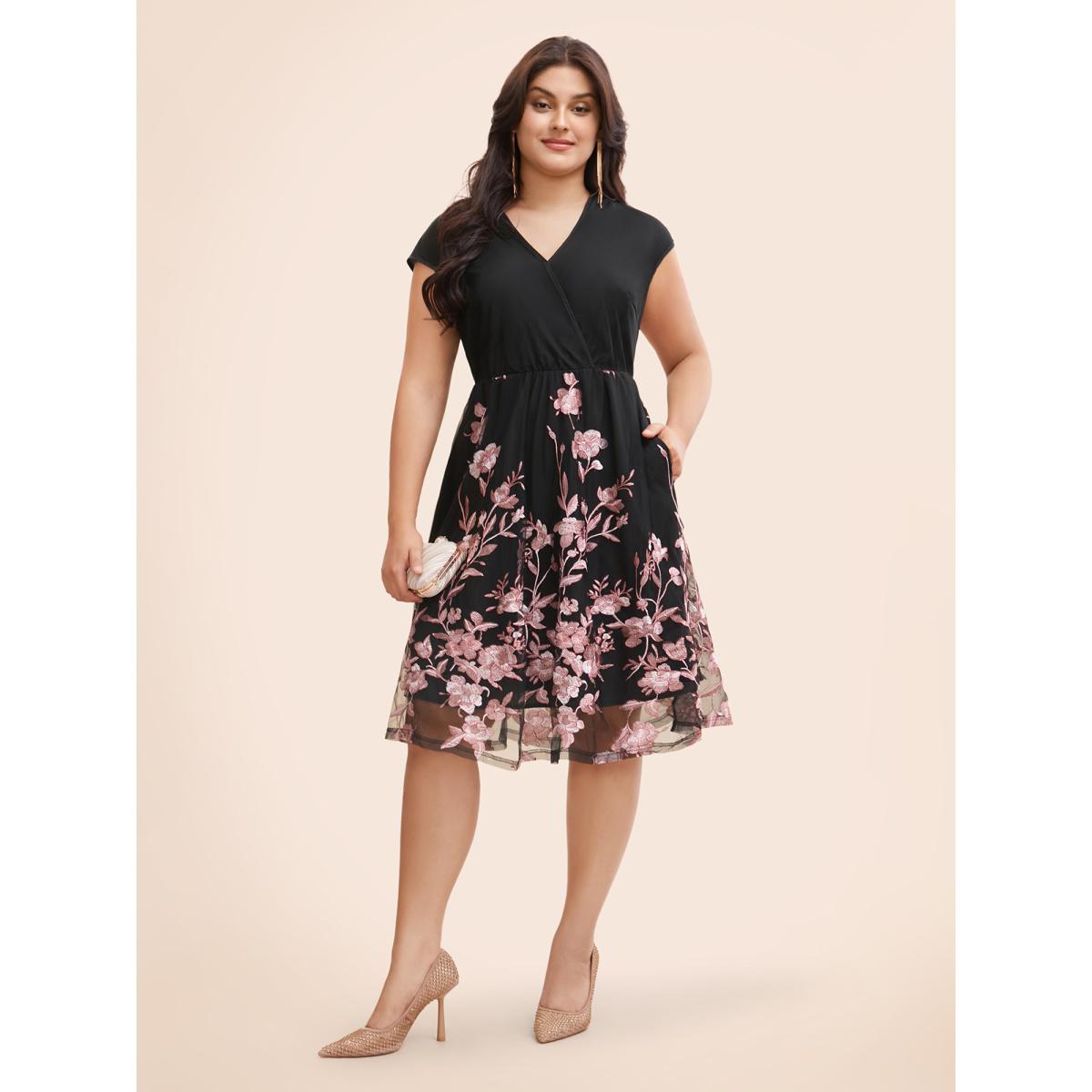 Plus Size Floral Embroidered Wrap Cap Sleeve Dress Black Women Cocktail Texture Overlap Collar Cap Sleeve Curvy BloomChic 30/6X