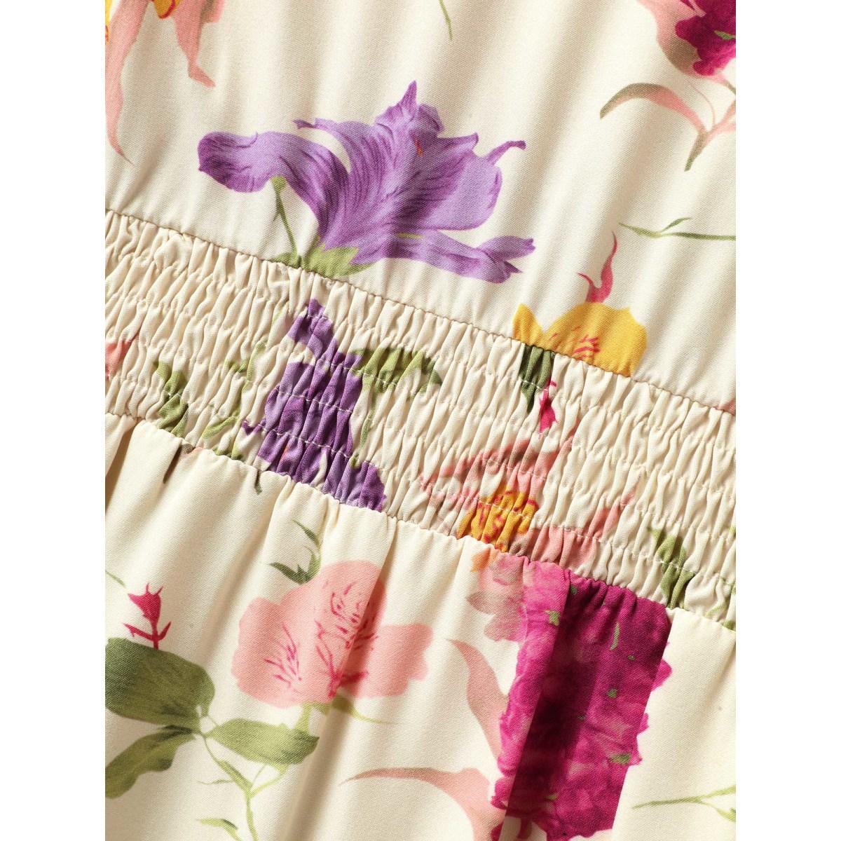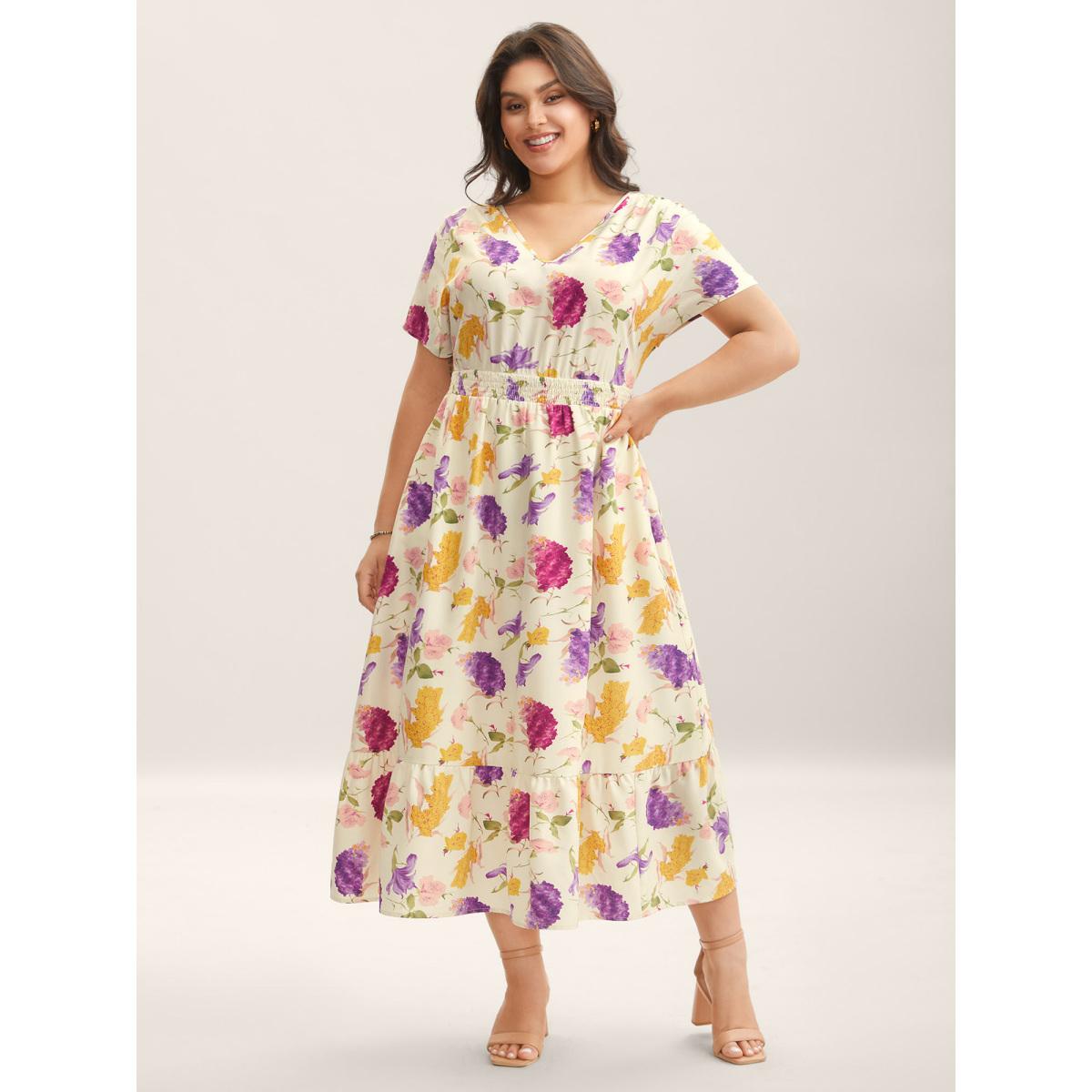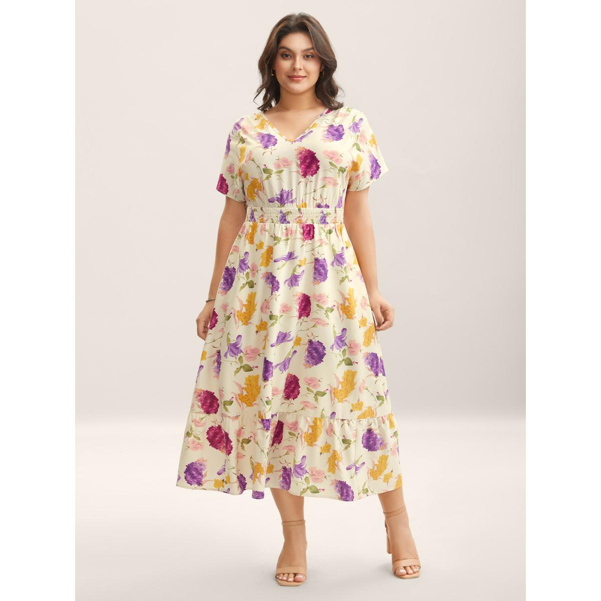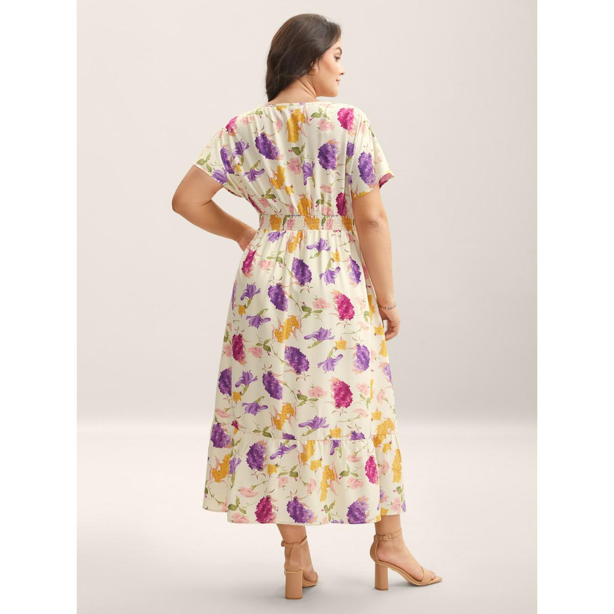 Plus Size Floral Fantasy Shirred Tiered Maxi Dress Beige Women V-neck Cap Sleeve Curvy BloomChic 26/4X