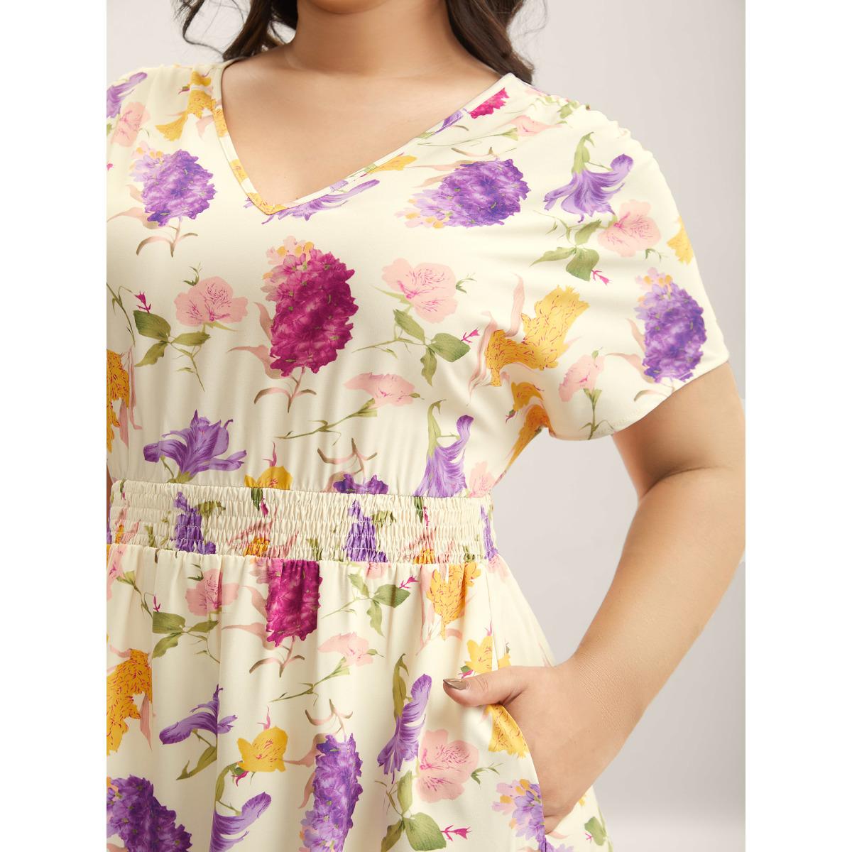 Plus Size Floral Fantasy Shirred Tiered Maxi Dress Beige Women V-neck Cap Sleeve Curvy BloomChic 26/4X Product Image