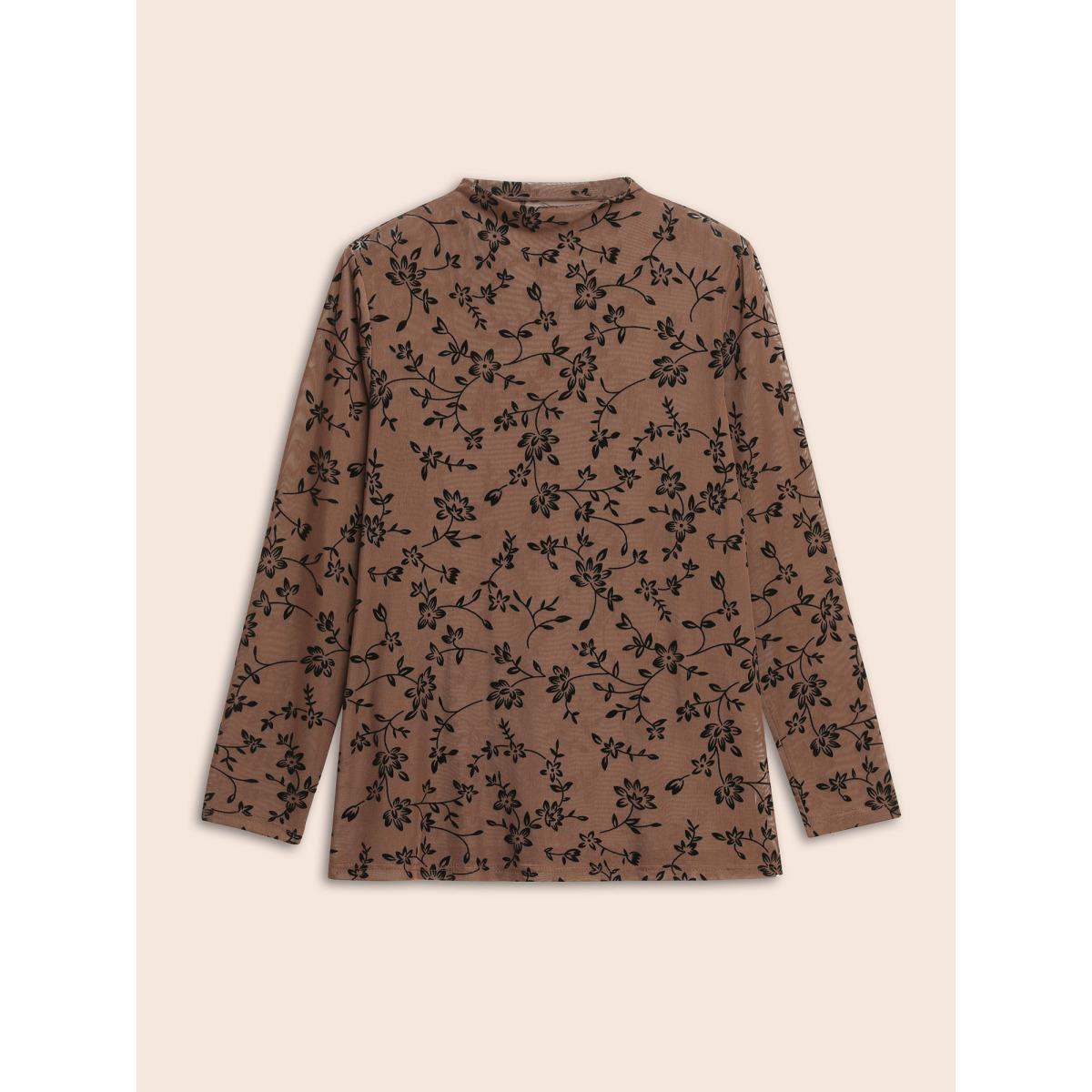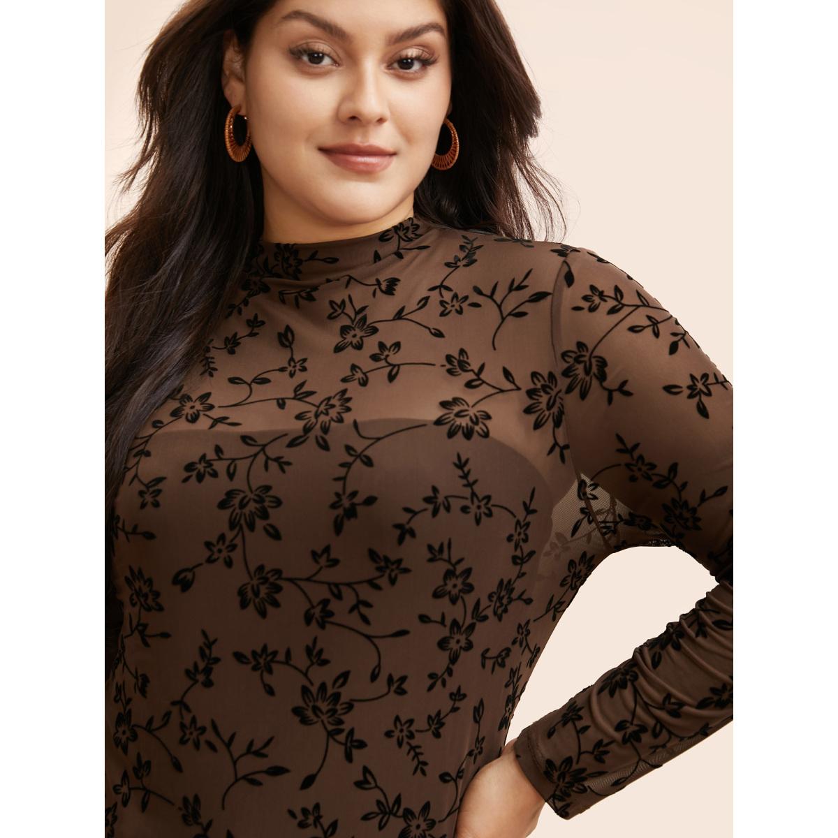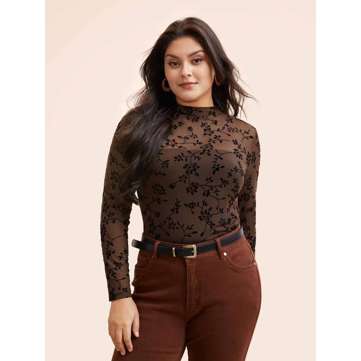 Plus Size Floral Flocking Mesh Mock Neck T-shirt DarkBrown Women Elegant See through Stand-up collar Skinny Everyday T-shirts BloomChic 26/4X