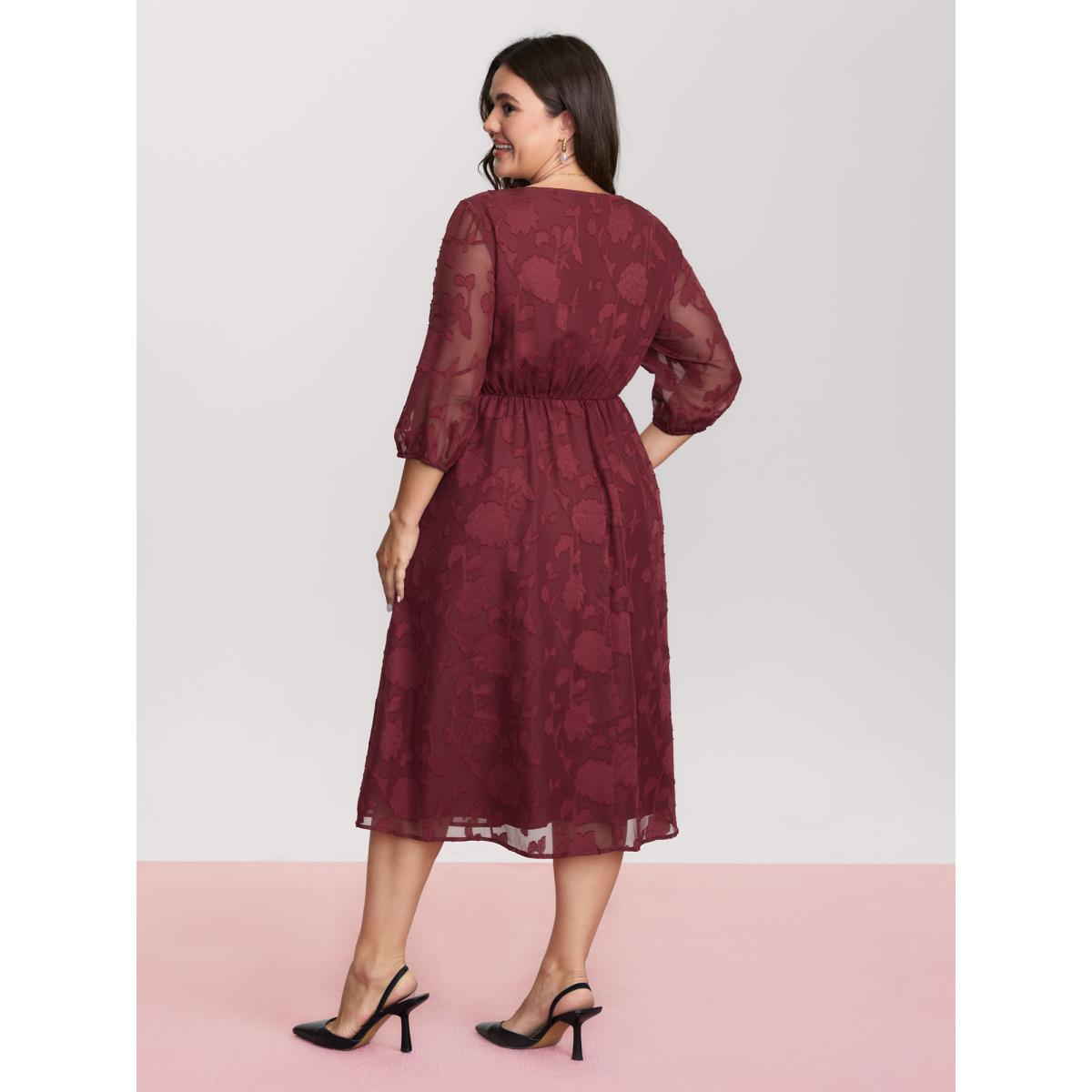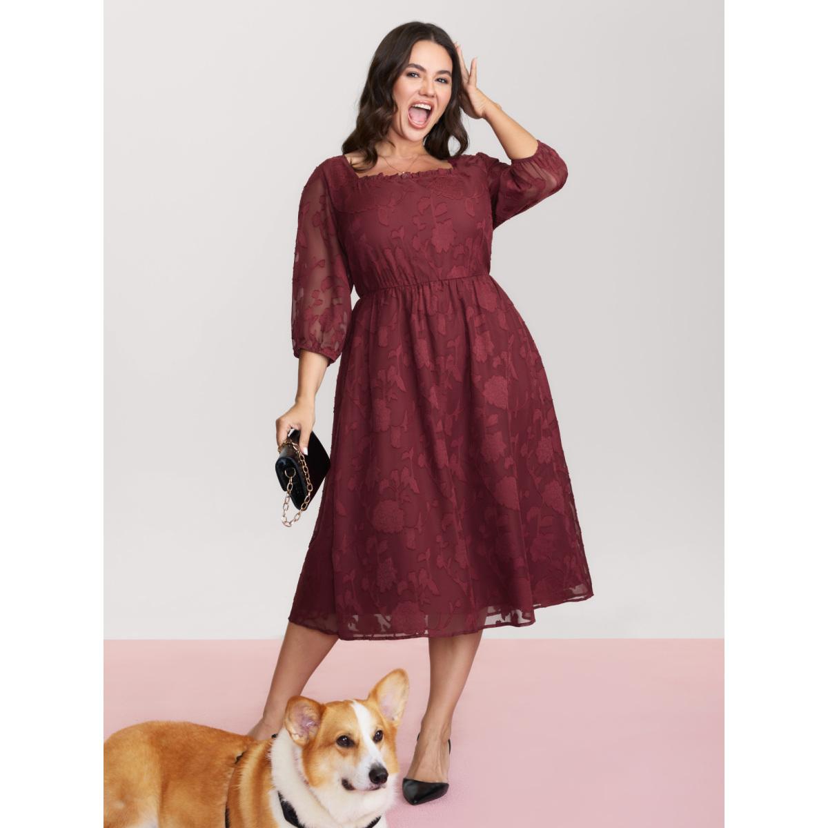 Plus Size Floral Frill Trim Stretchy-Waist Sheer Midi Dress Burgundy Women Elegant Texture Square Neck Elbow-length sleeve Curvy BloomChic 10/M