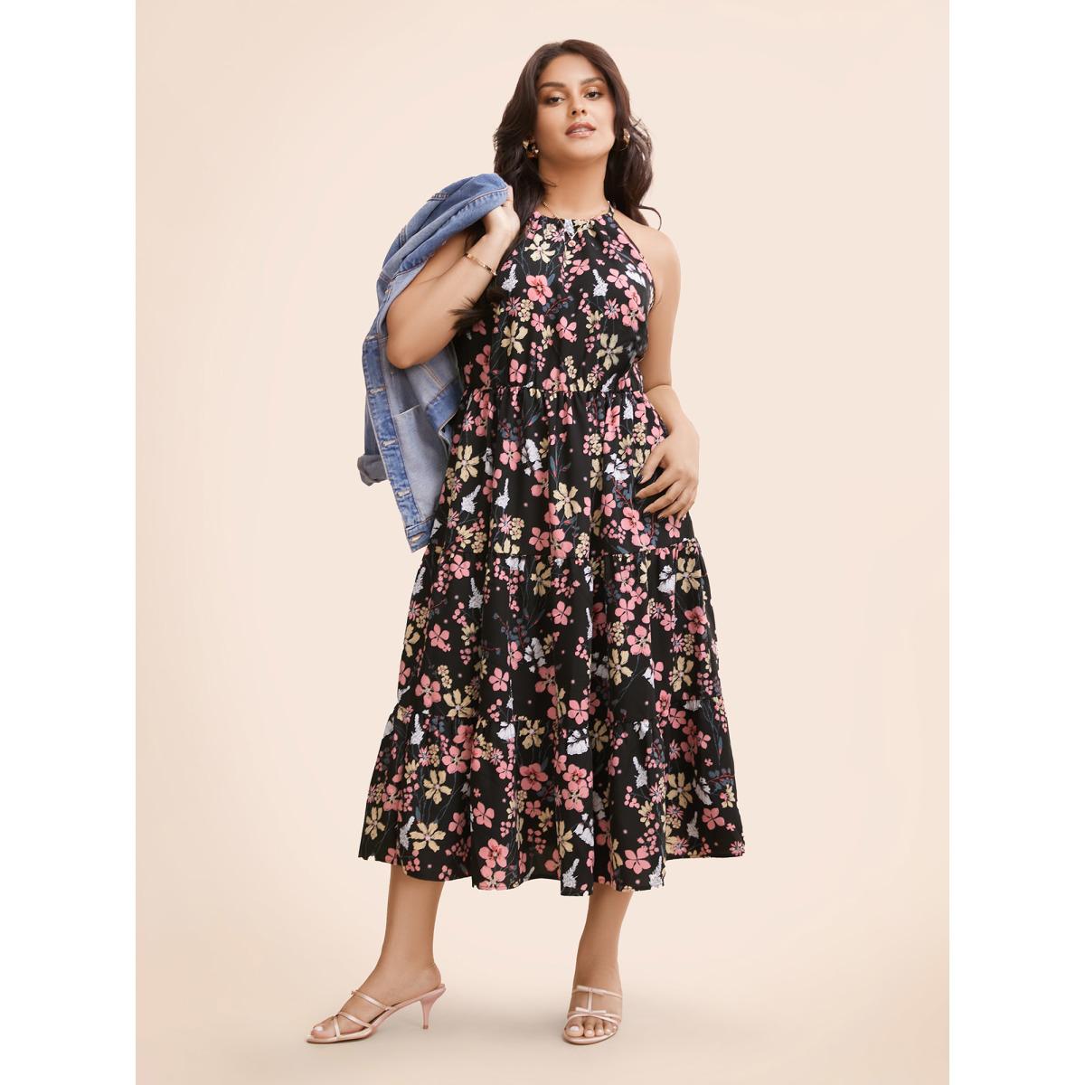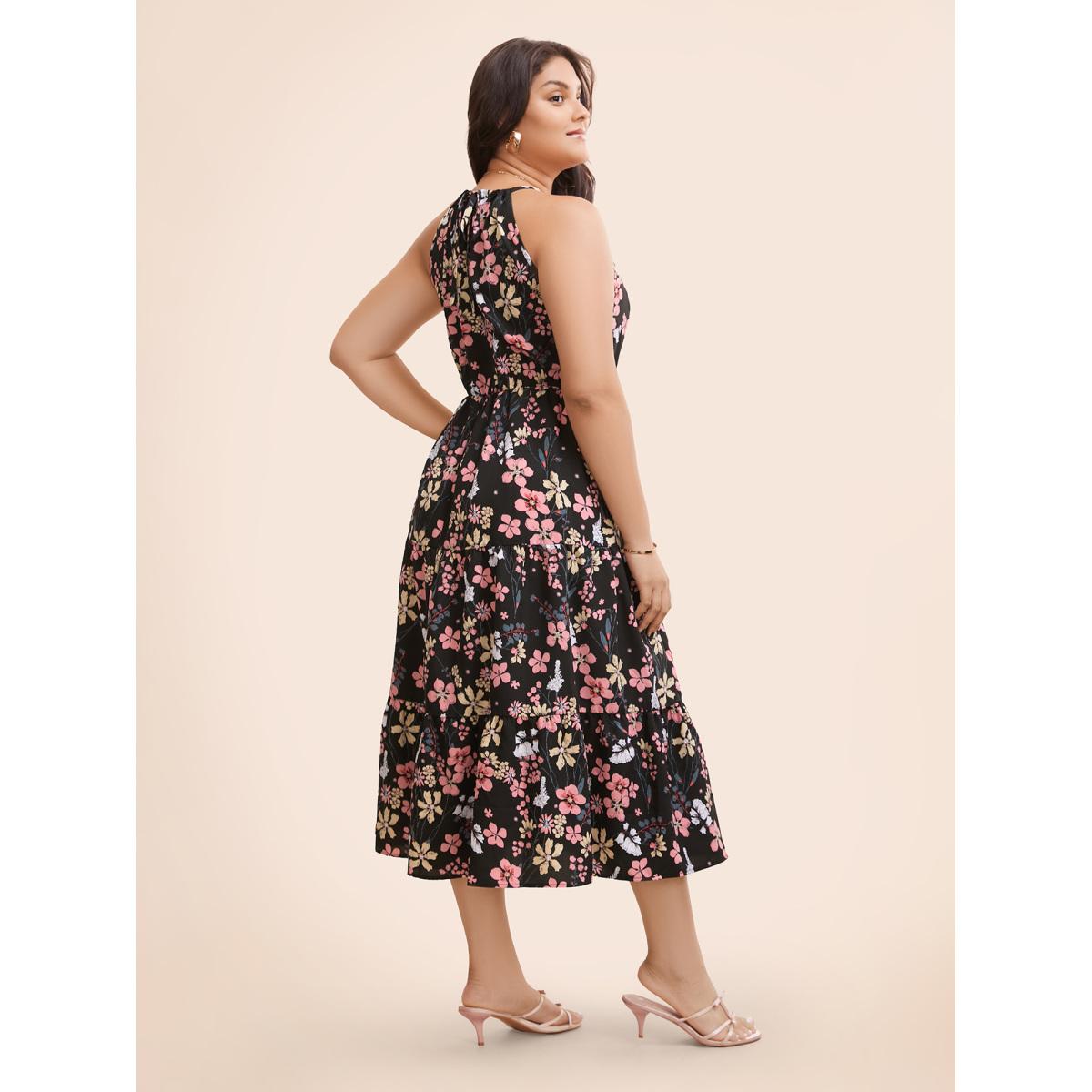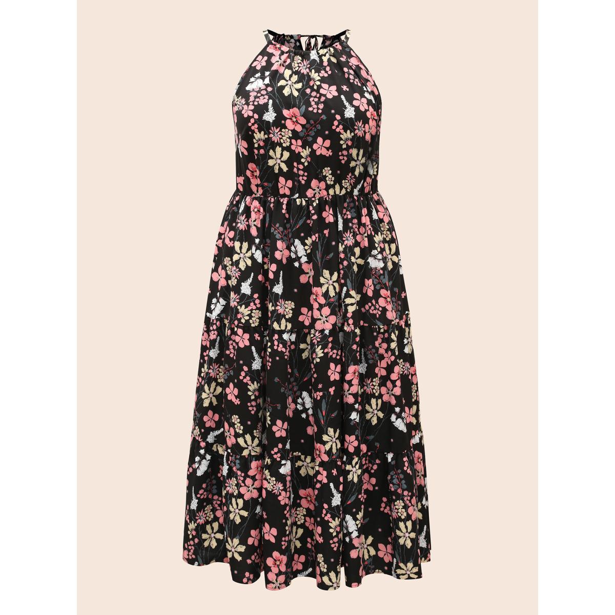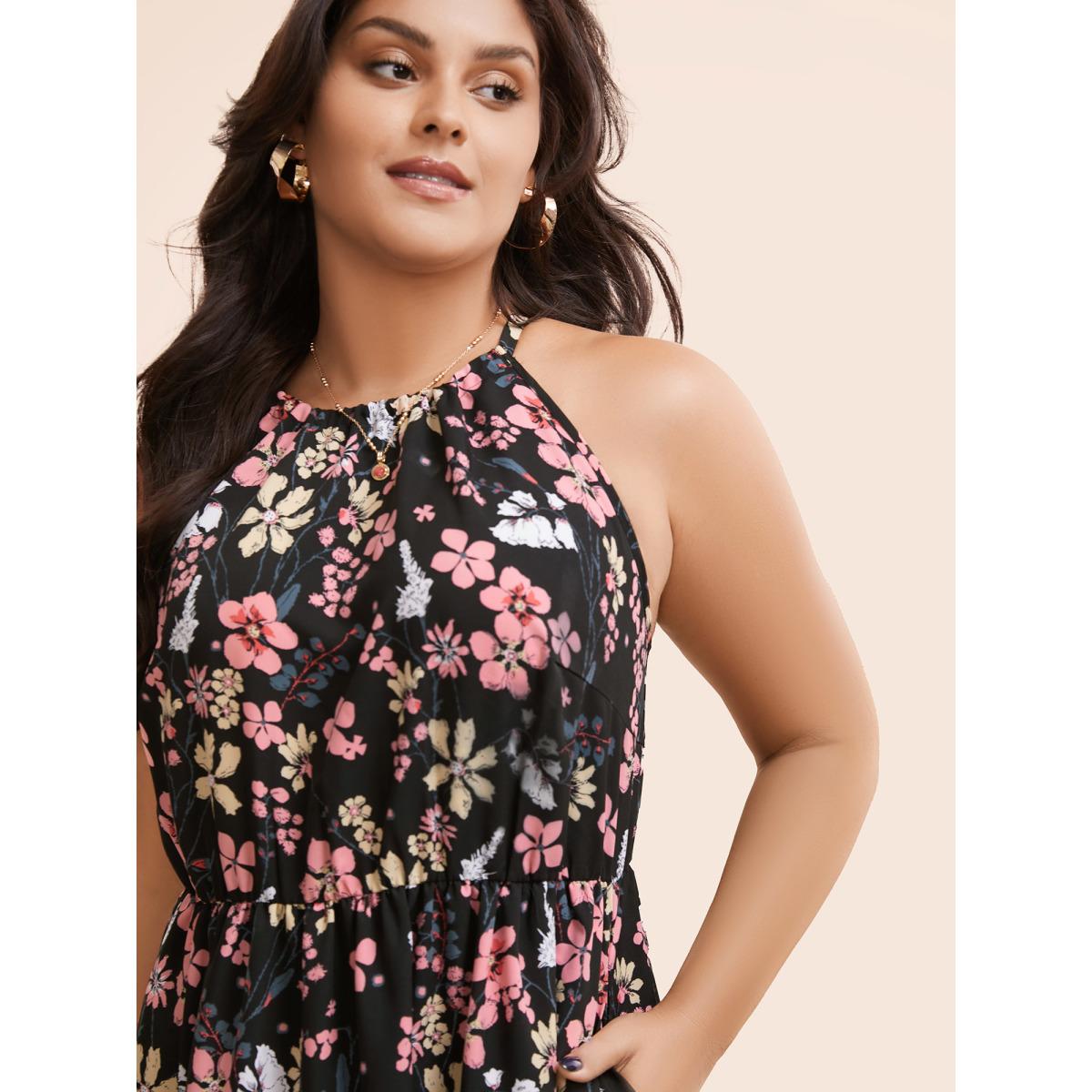 Plus Size Floral Halter Neck Ruffle Hem Dress Black Women Elegant Gathered Halter neck Sleeveless Curvy BloomChic 30/6X
