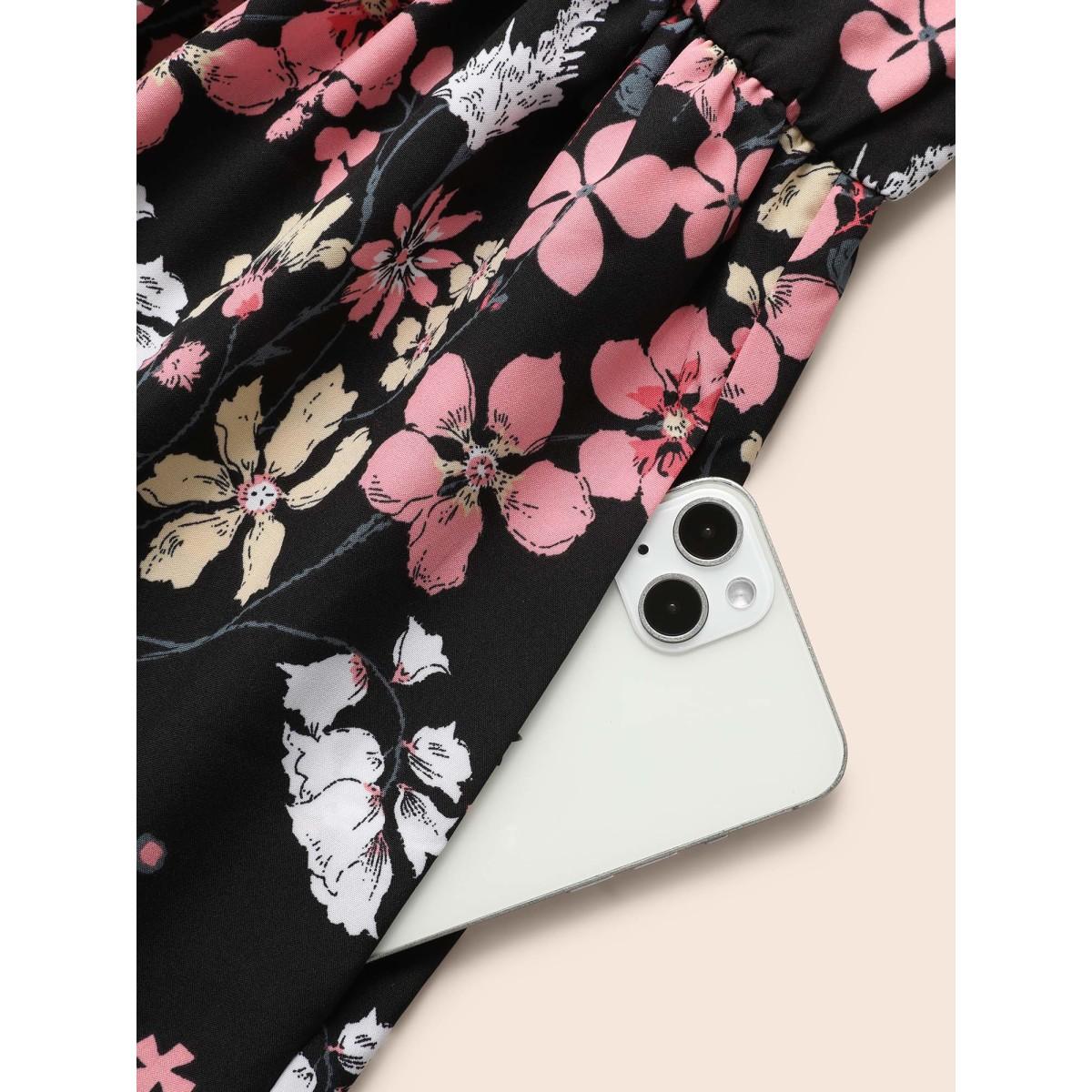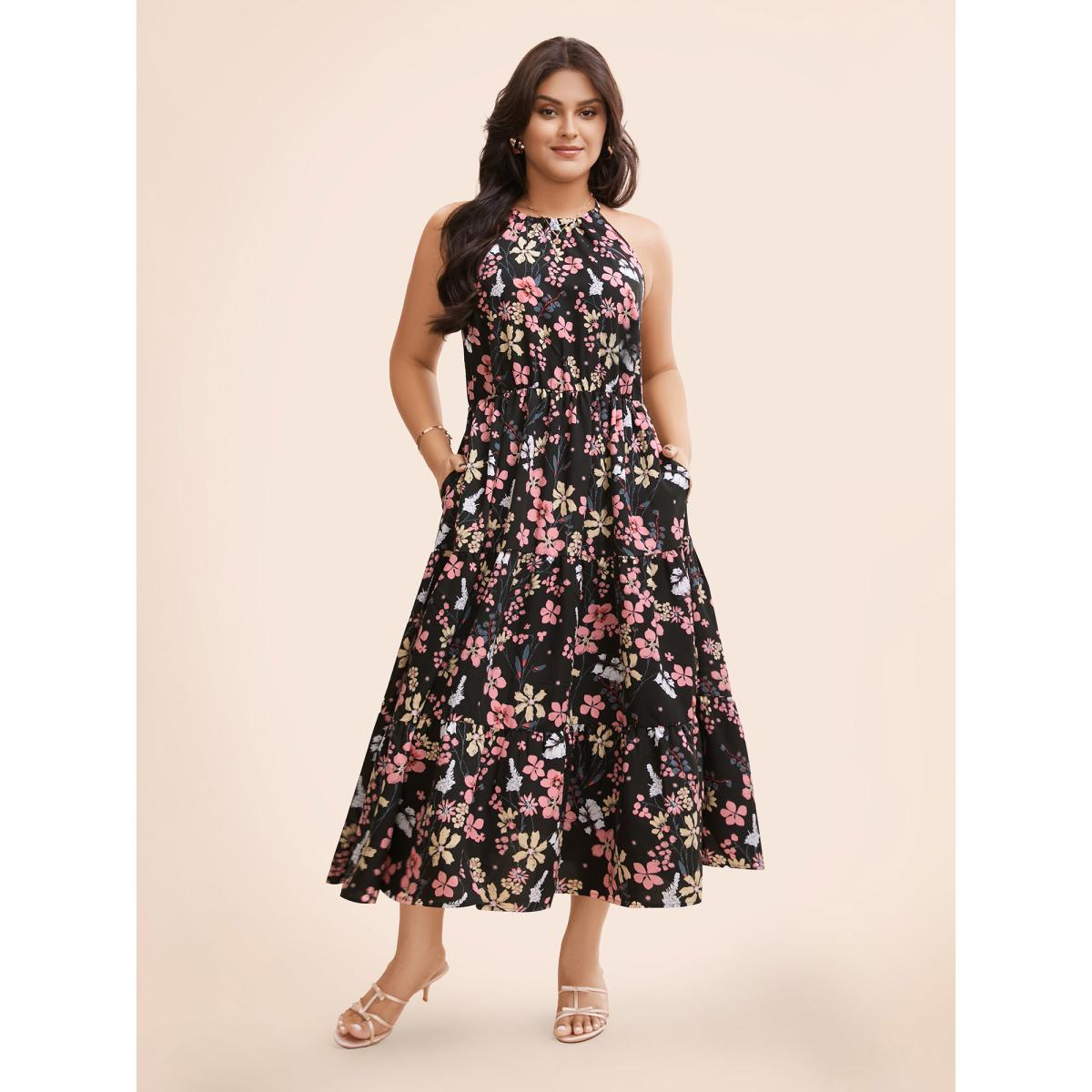 Plus Size Floral Print Halter Shirred Pocket Ruffle Hem Dress BlackFlower Women Elegant Knotted Cold Shoulder Sleeveless Curvy Knee Dress BloomChic 10/M