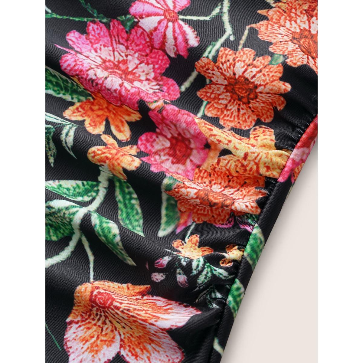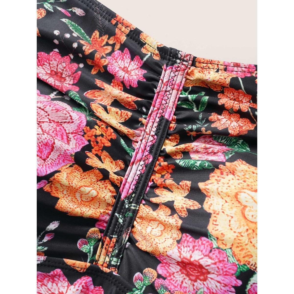 Plus Size Floral Heart Neckline Tucked Seam Ruched One Piece Swimsuit Women's Swimwear Black Beach Tucked seam Curve Bathing Suits High stretch One Pieces BloomChic 22-24/3X