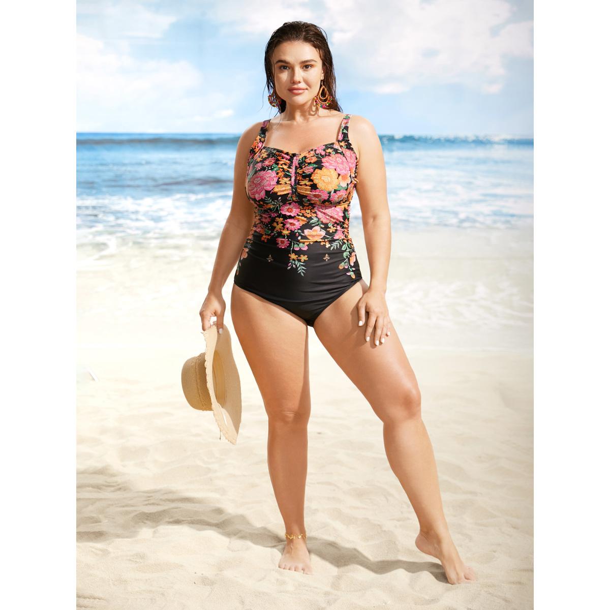 Plus Size Floral Heart Neckline Tucked Seam Ruched One Piece Swimsuit Women's Swimwear Black Beach Tucked seam Curve Bathing Suits High stretch One Pieces BloomChic 22-24/3X Product Image