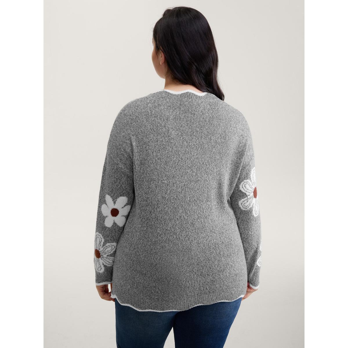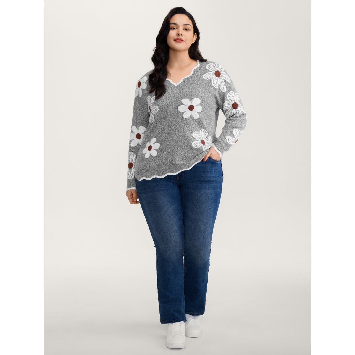 Plus Size Floral Jacquard Wavy Edge Pullover DarkGray Women Playful Loose Long Sleeve V-neck Casual Pullovers BloomChic 10/M