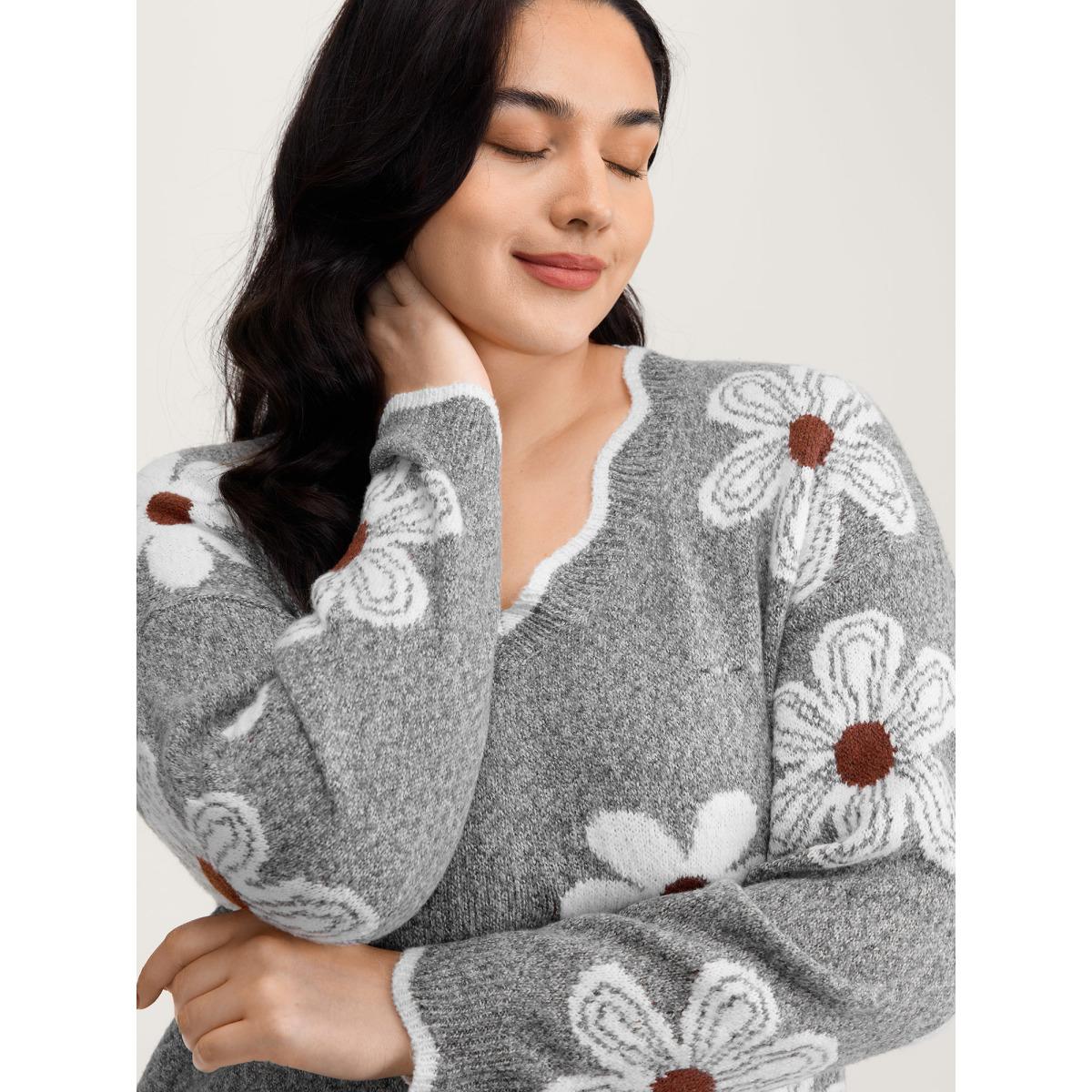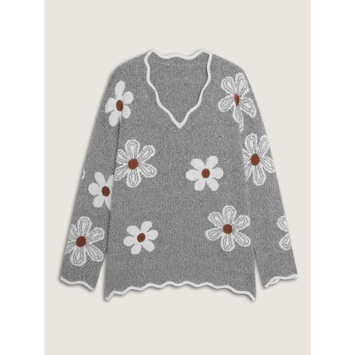 Plus Size Floral Jacquard Wavy Edge Pullover DarkGray Women Playful Loose Long Sleeve V-neck Casual Pullovers BloomChic 10/M Product Image