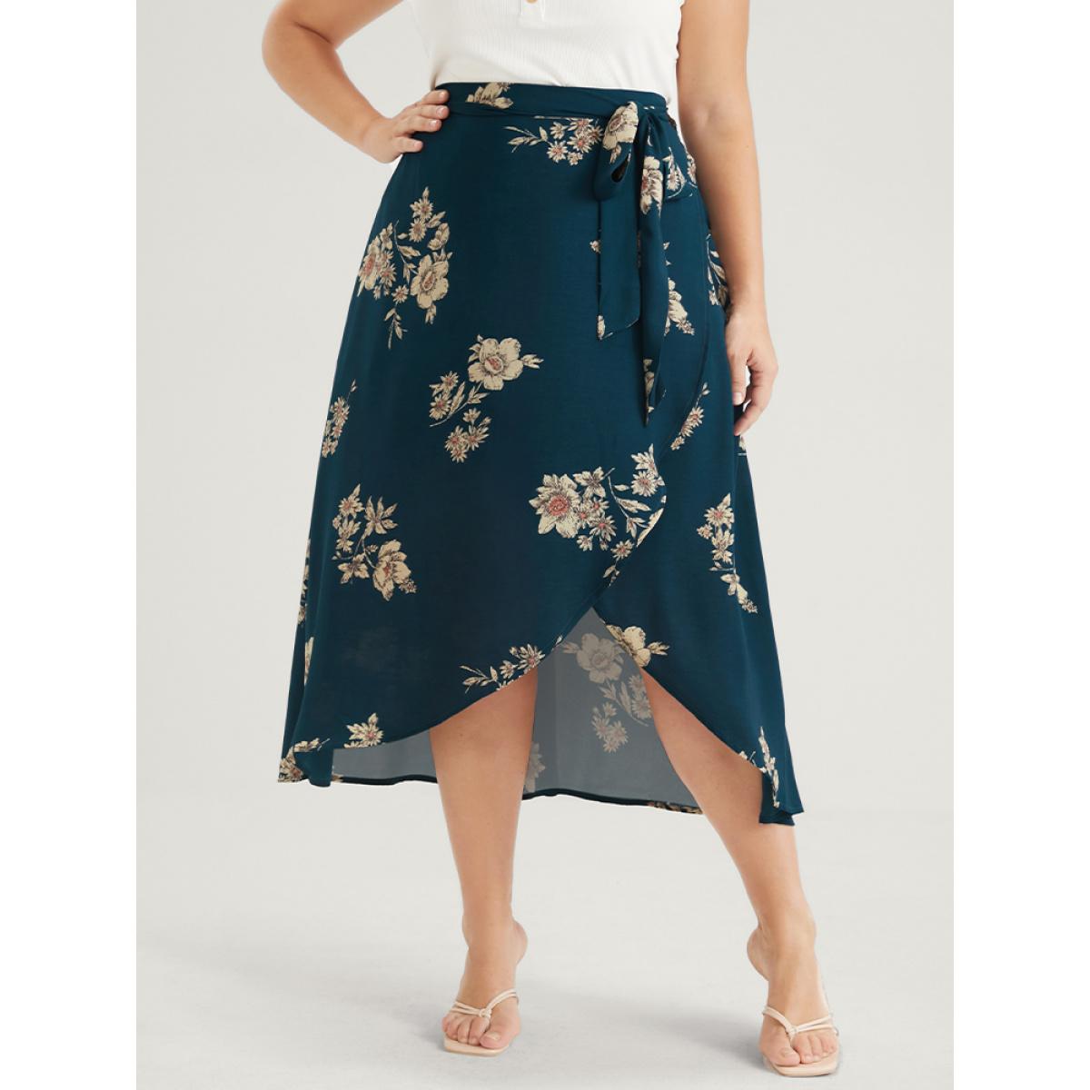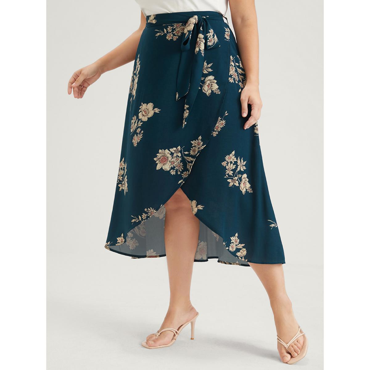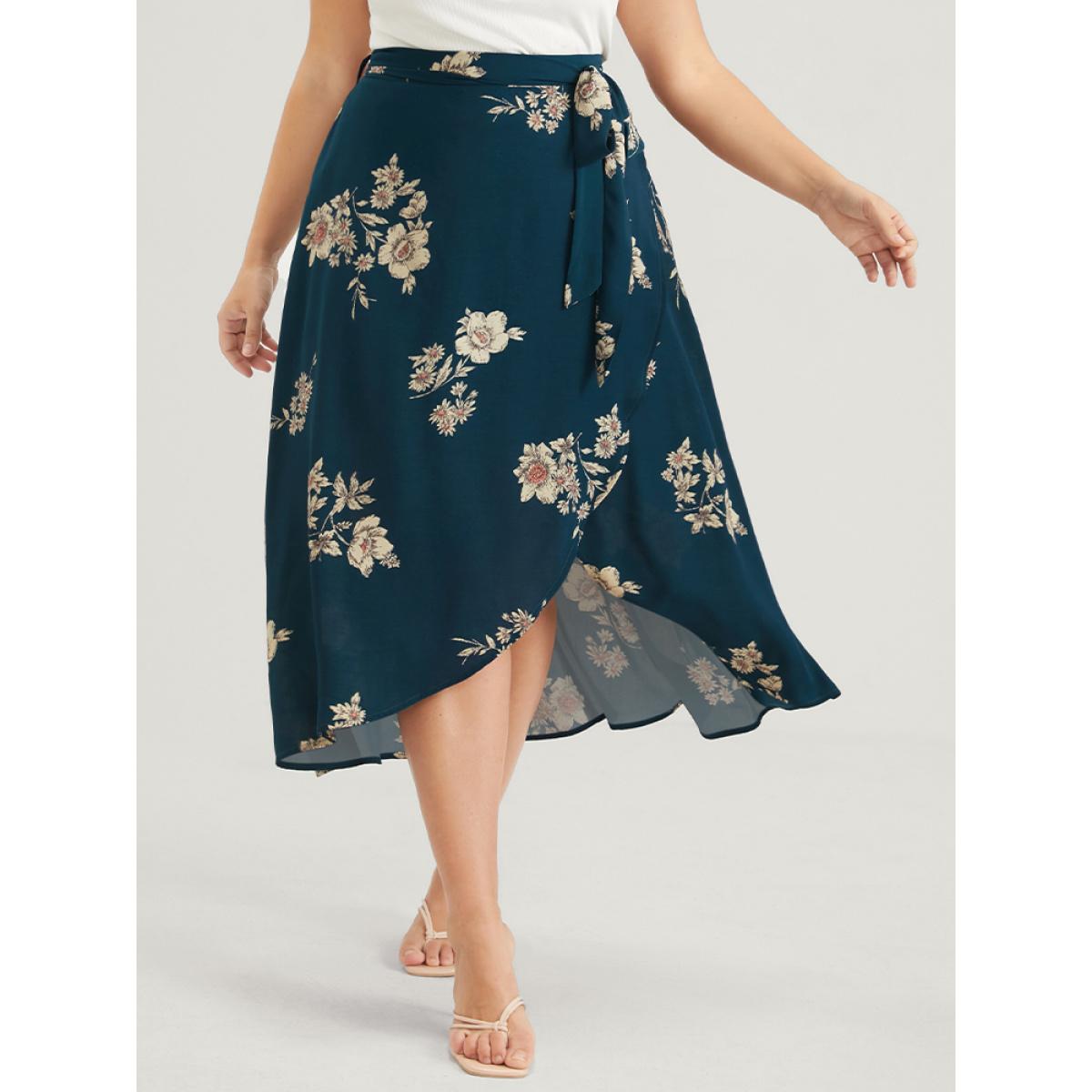 Plus Size Floral Knotted Elastic Waist Wrap Split Skirt Women Aegean Elegant Printed No stretch Belt Dailywear Skirts BloomChic 28/5X