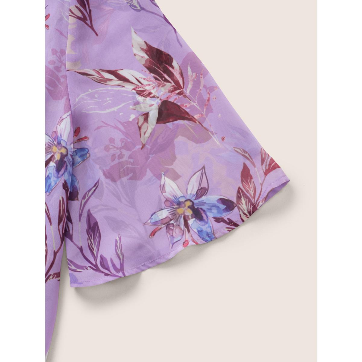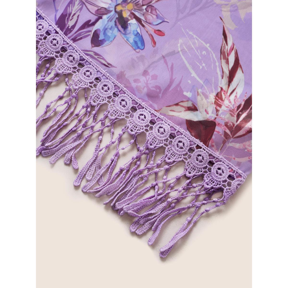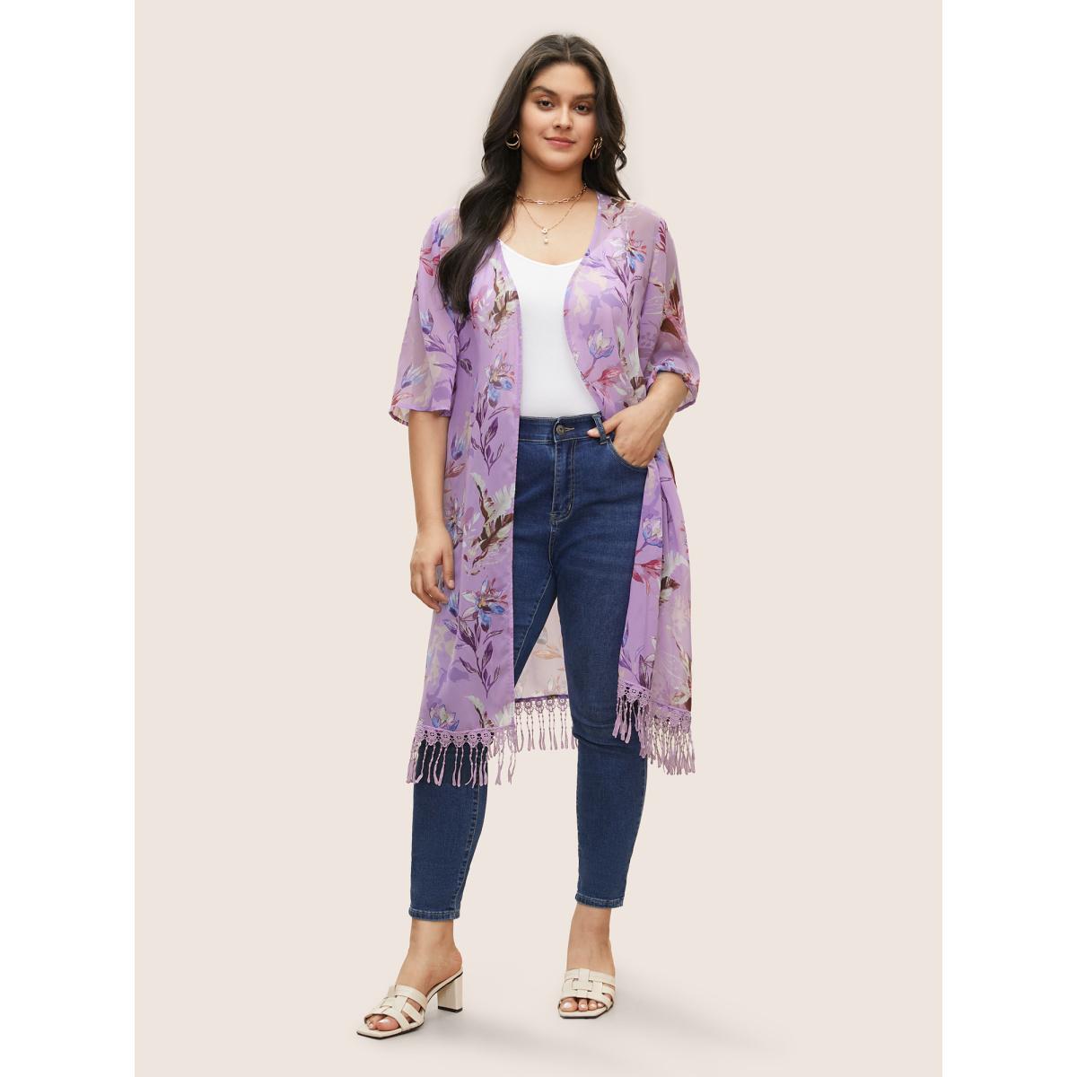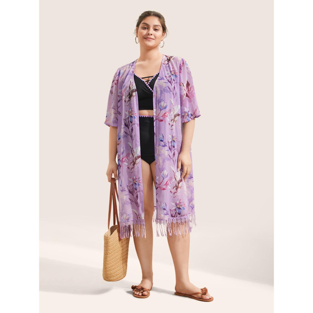 Plus Size Floral Lace Patchwork Mesh Tassels Trim Kimono Women Lilac Resort Woven ribbon&lace trim Vacation Kimonos BloomChic 22-24/3X