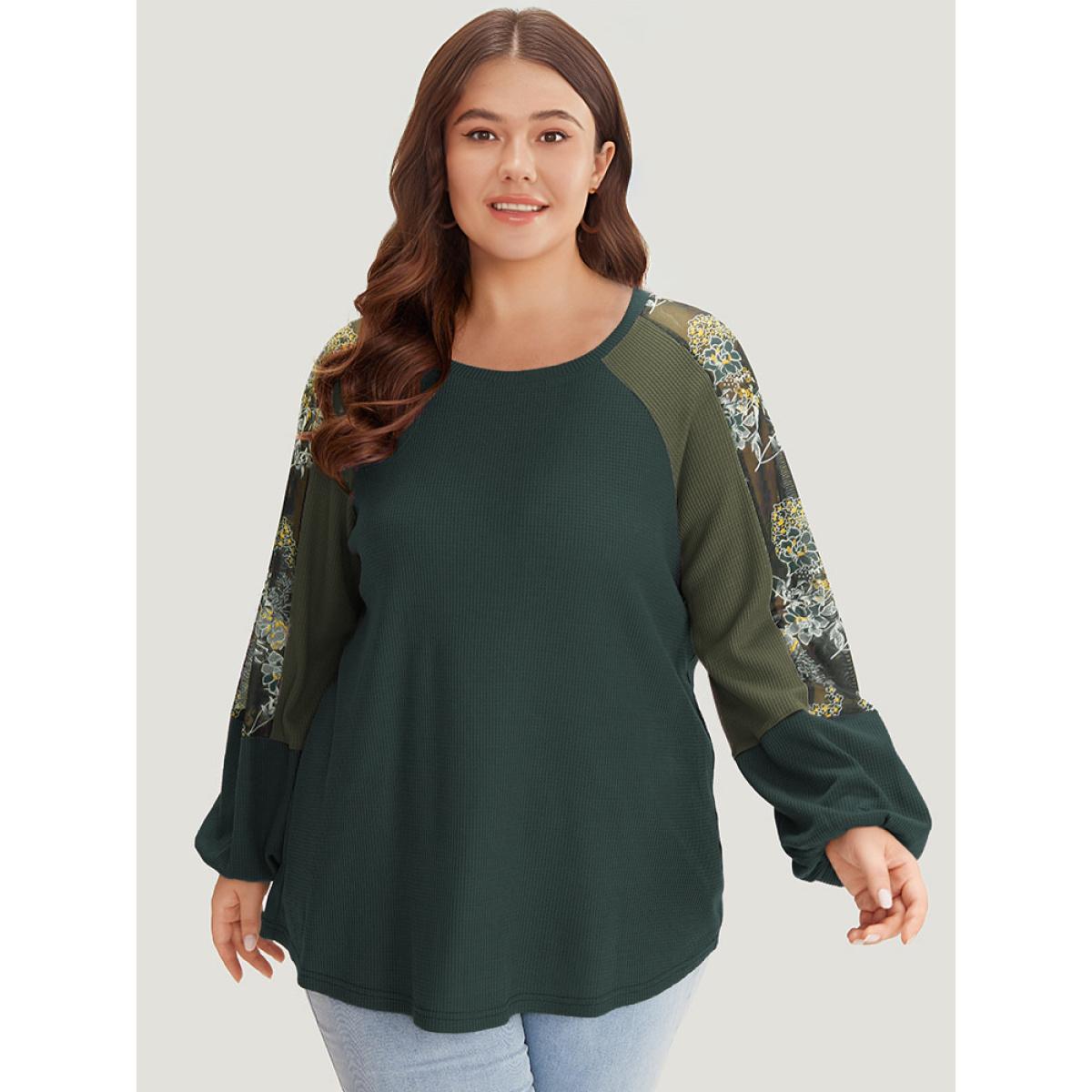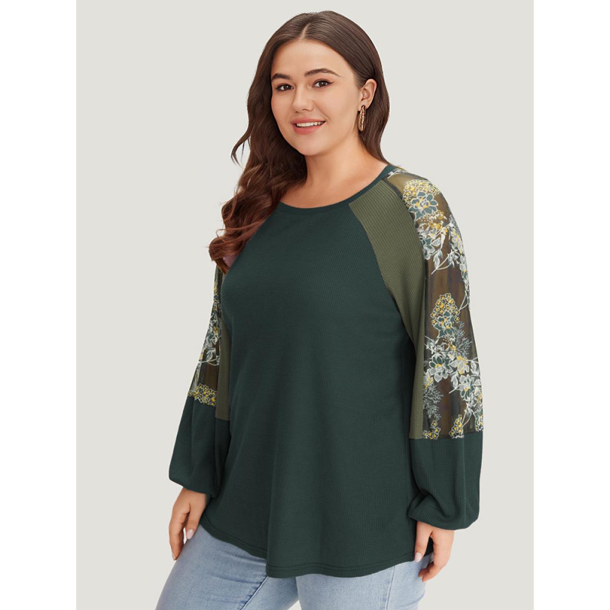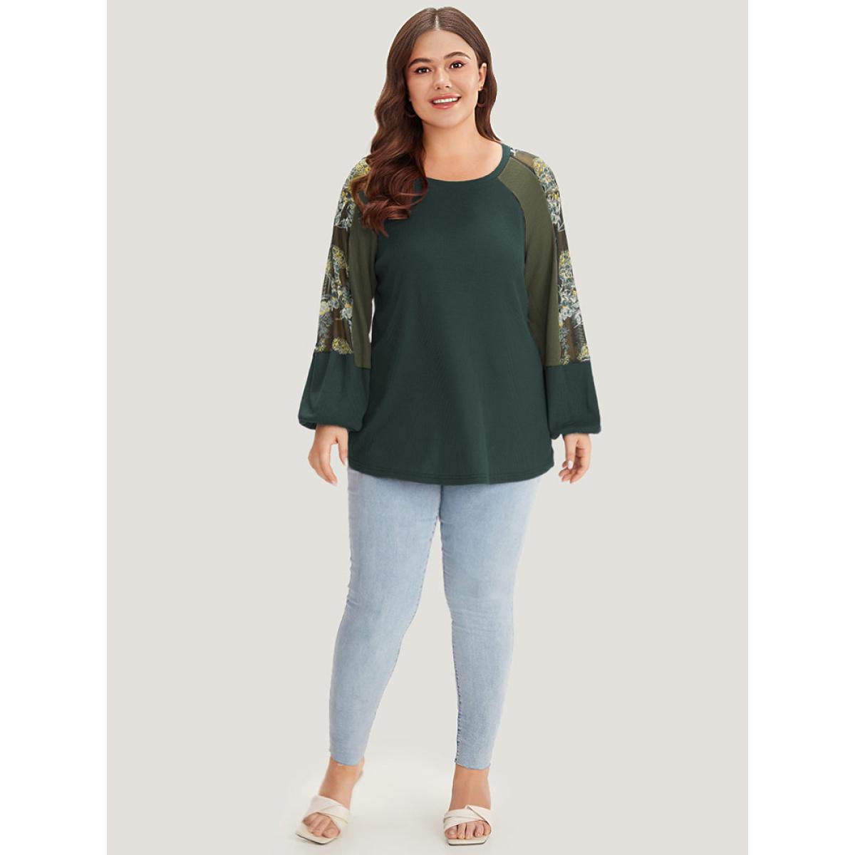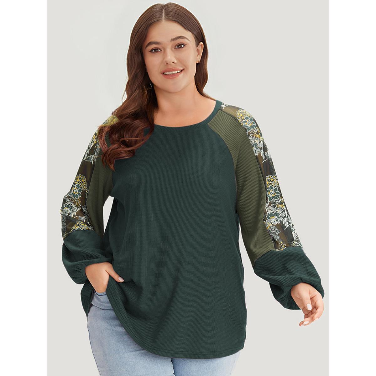 Plus Size Floral Mesh Patchwork Lantern Sleeve Sweatshirt Women Emerald Elegant Patchwork Round Neck Dailywear Sweatshirts BloomChic 14-16/1X