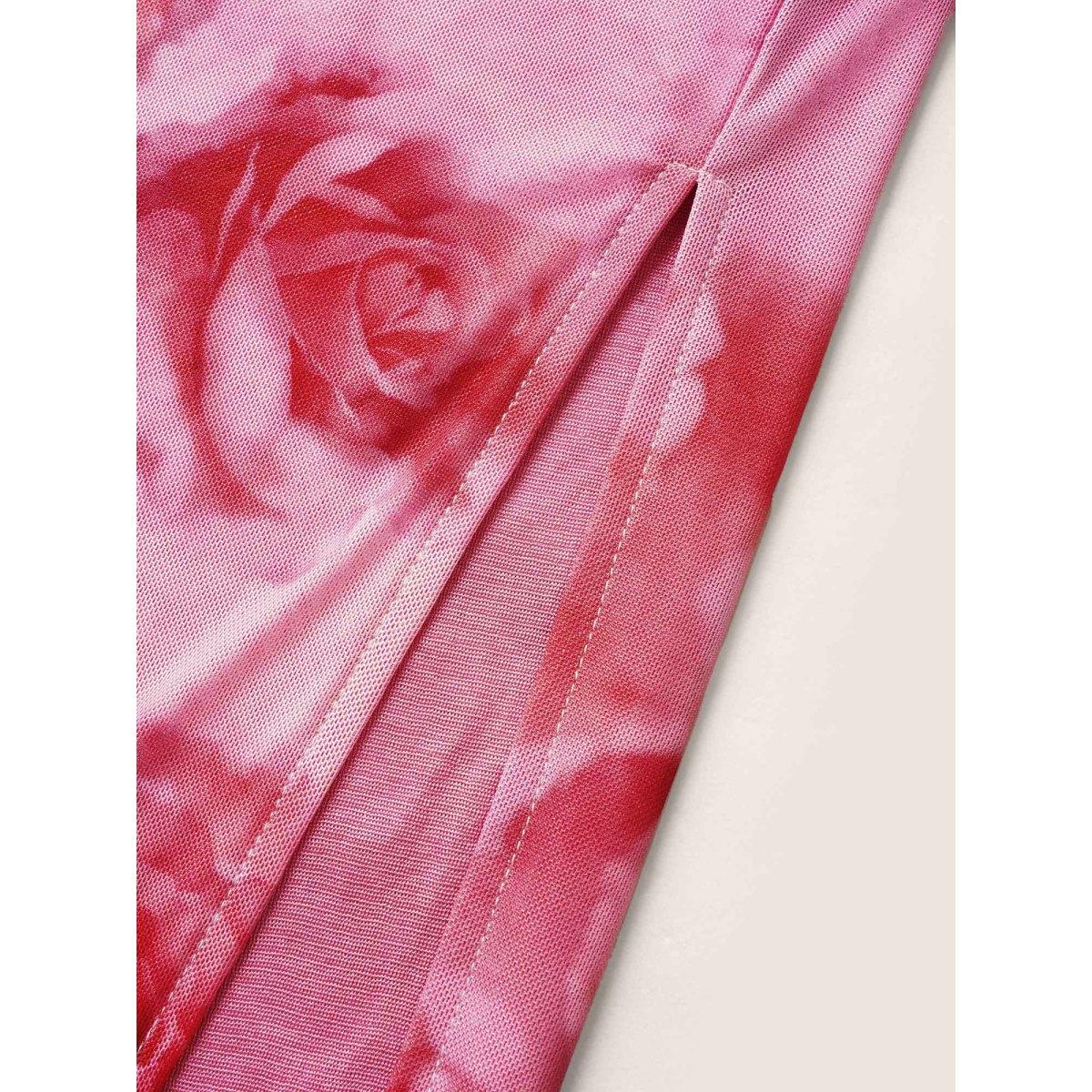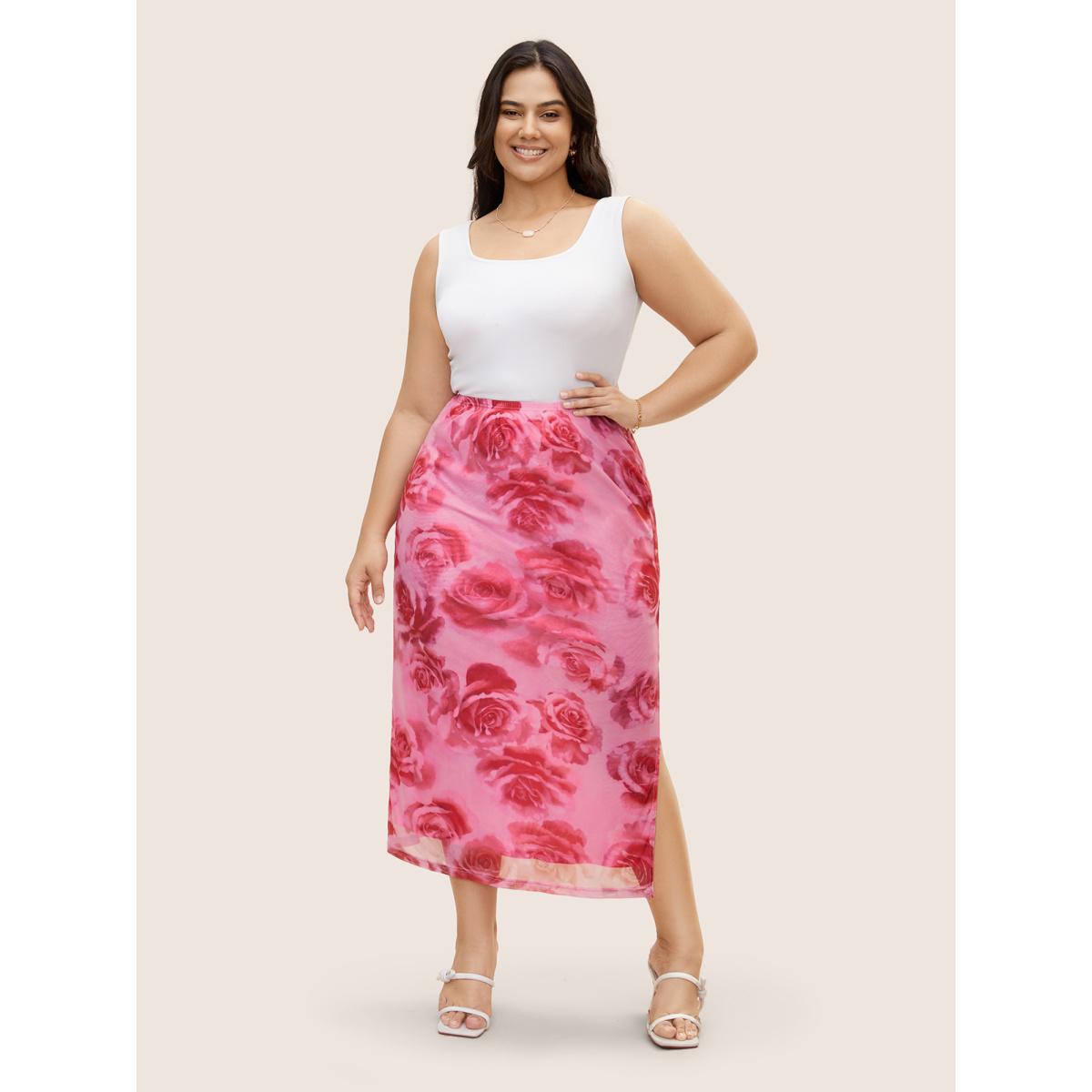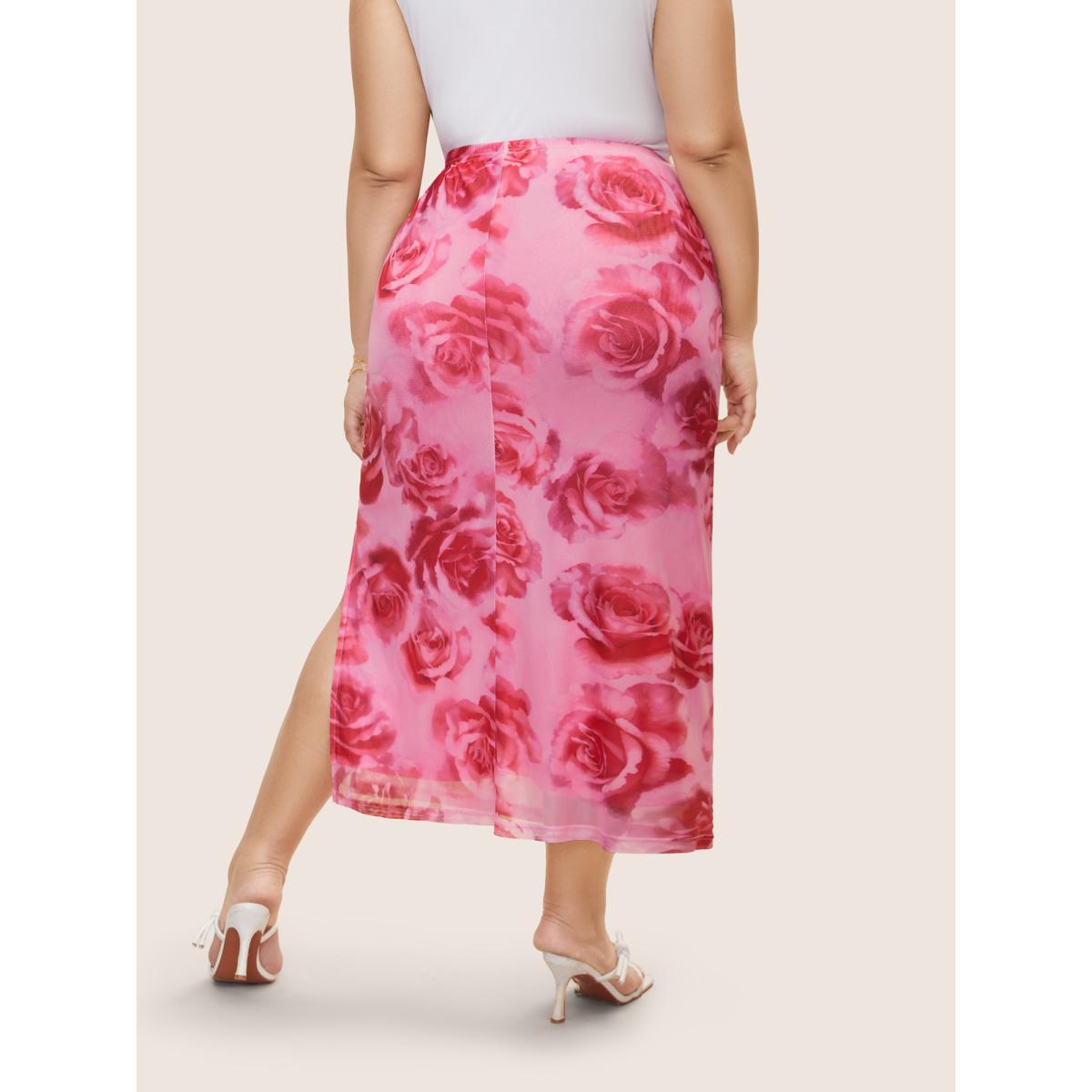 Plus Size Floral Mesh Split Side Cropped Skirt Women Watermelon Elegant Non Low stretch Everyday Skirts BloomChic 22-24/3X