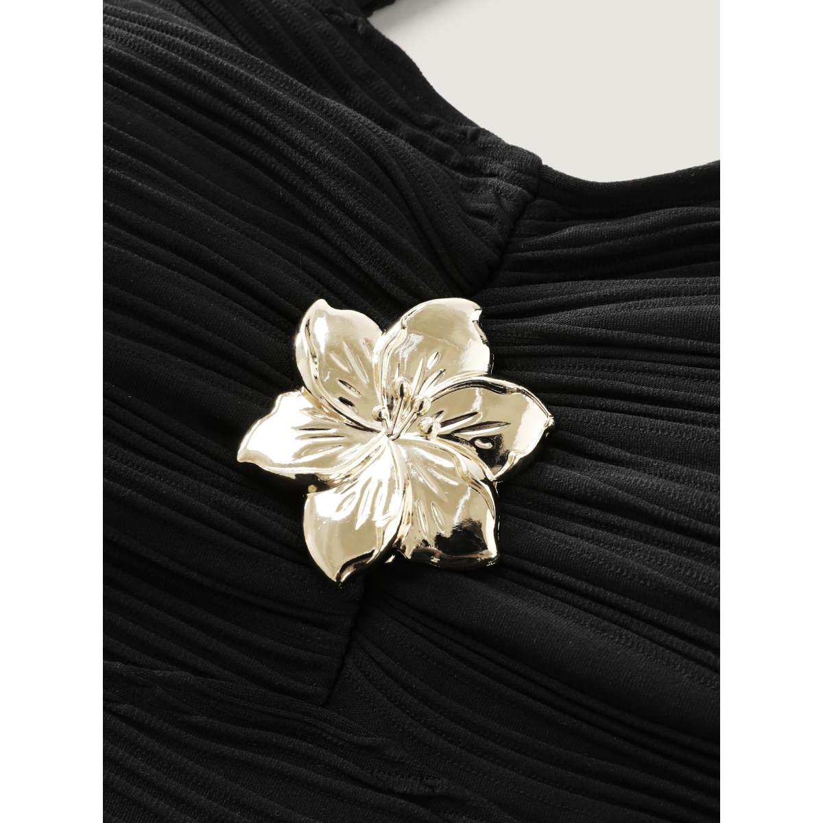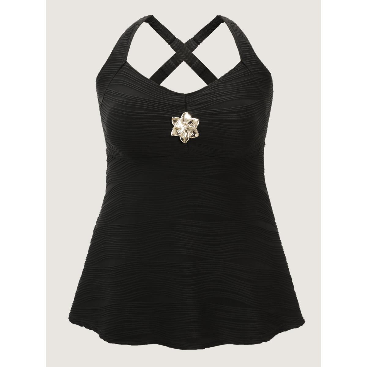 Plus Size Floral Metallic Button Textured Swim Top Women's Swimwear Black Resort Texture High stretch Bodycon Heart neckline Curve Swim Tops BloomChic 14-16/1X