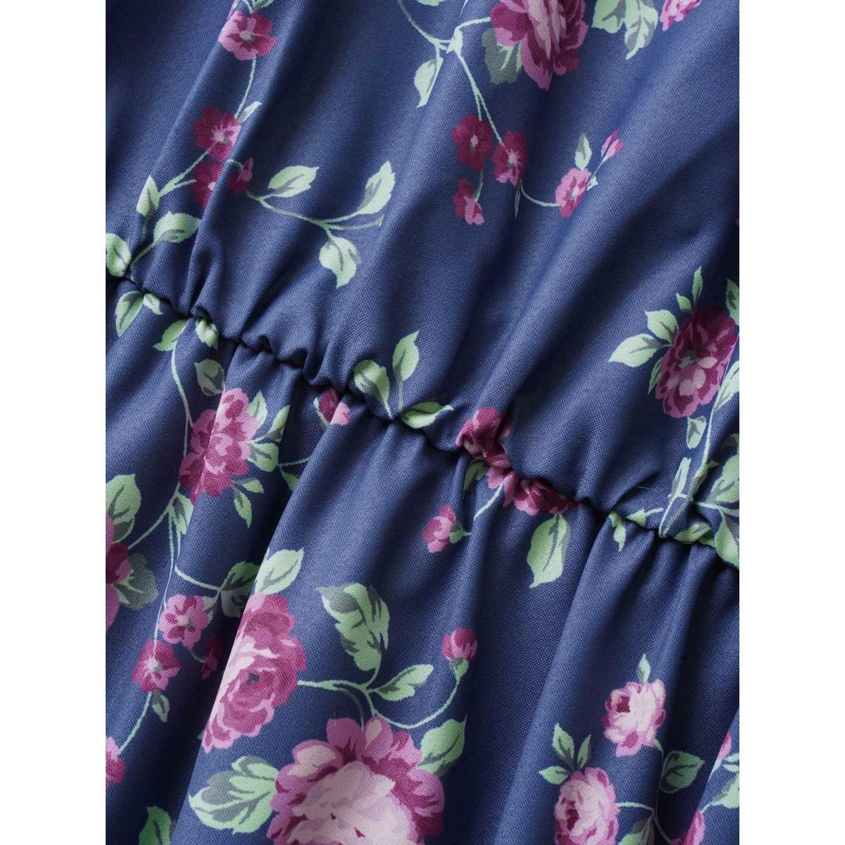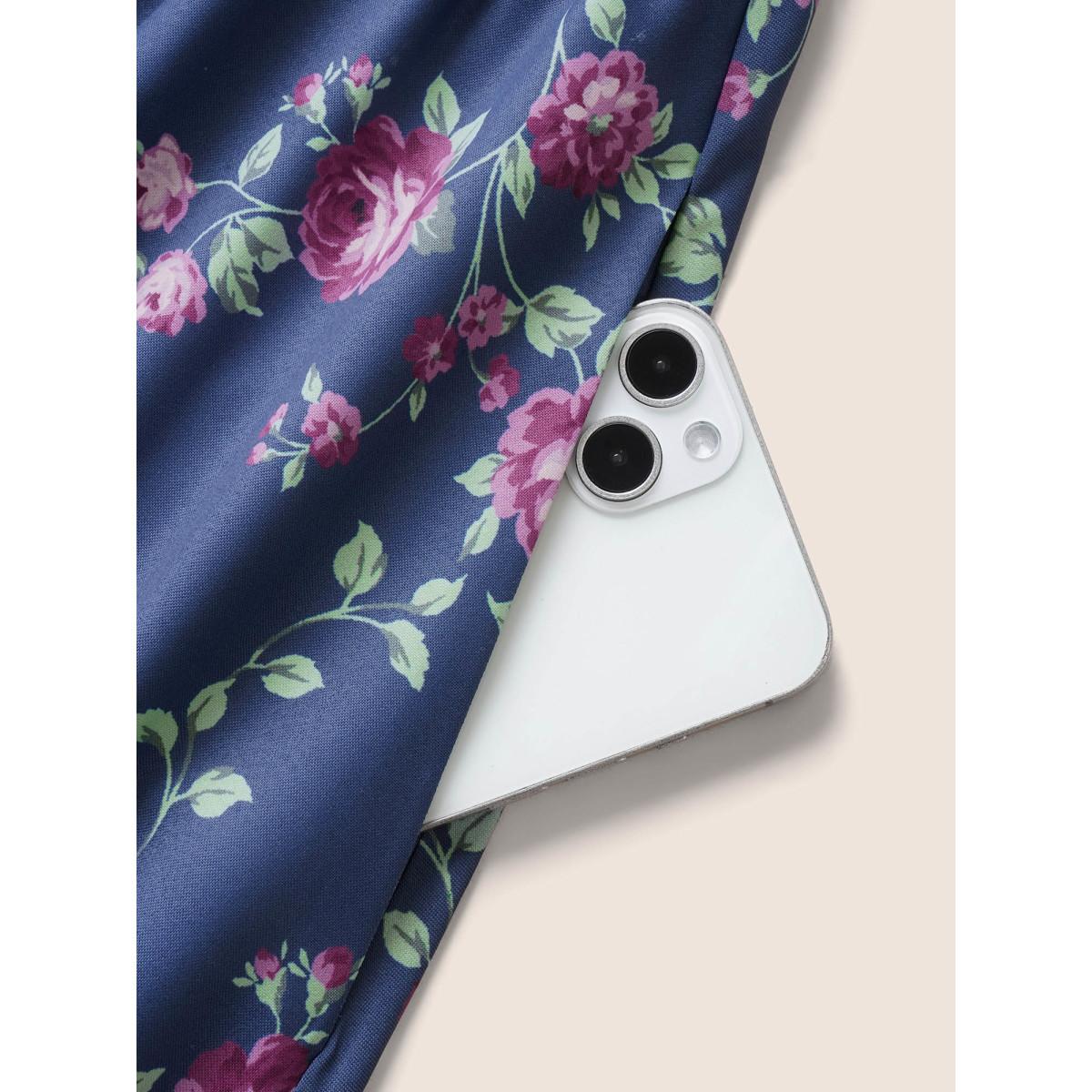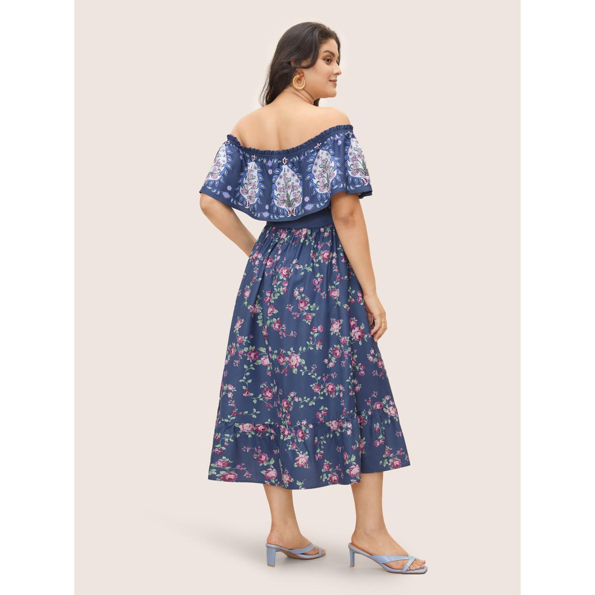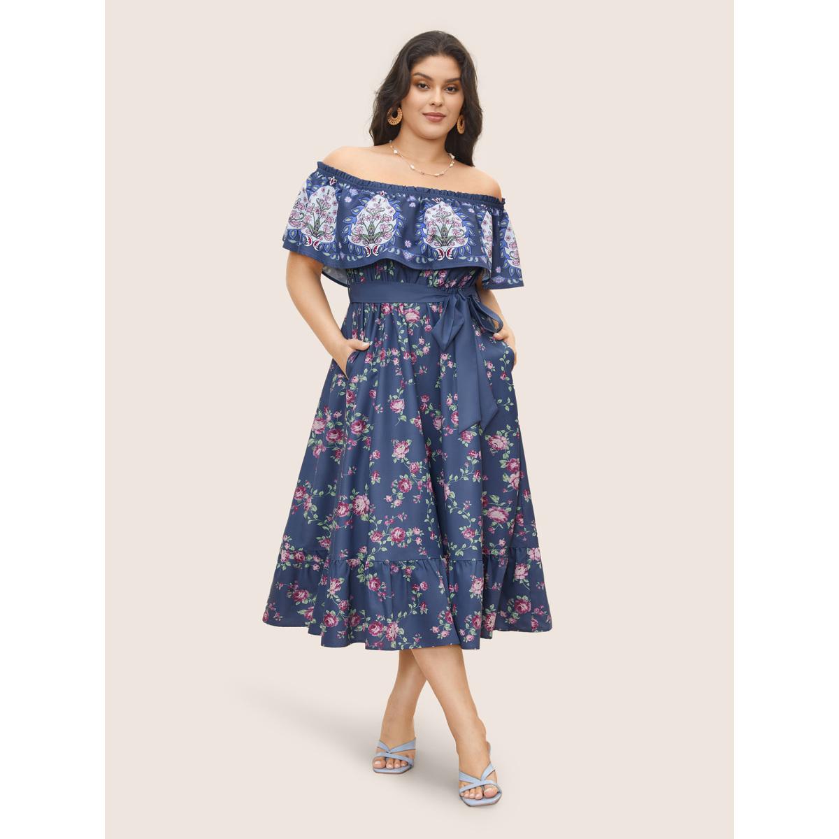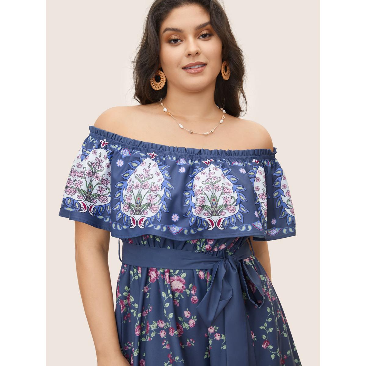 Plus Size Floral Off Shoulder Belted Frill Trim Dress SlateGray Women Resort Gathered One-shoulder neck Short sleeve Curvy Midi Dress BloomChic 14-16/1X