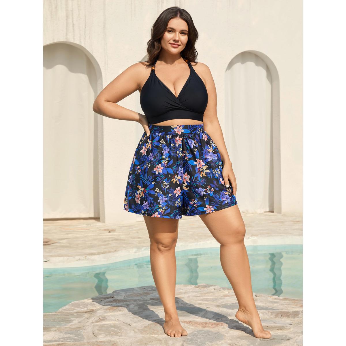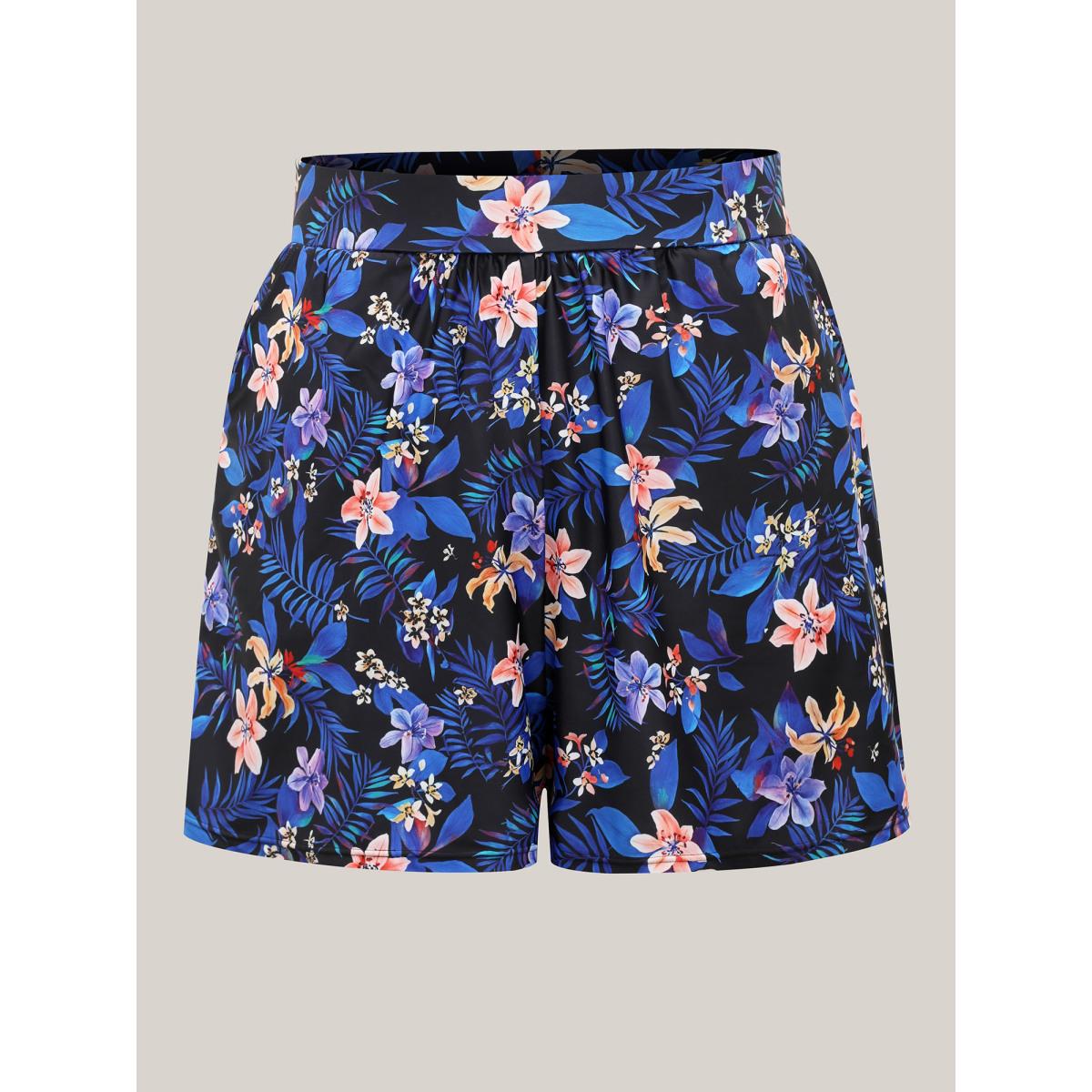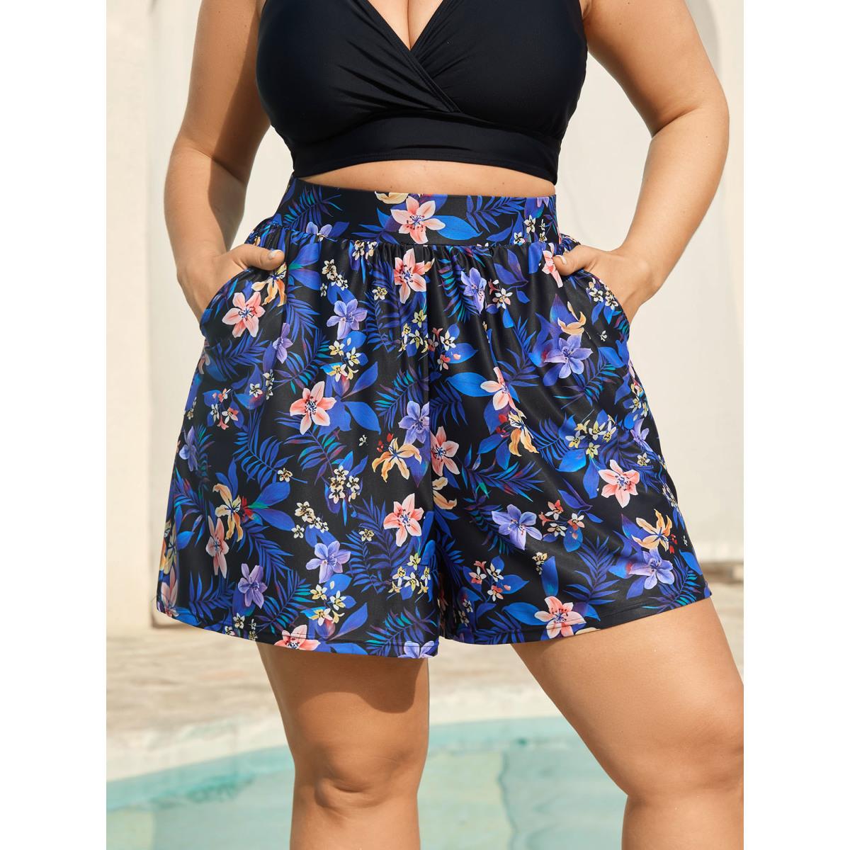 Plus Size Floral Paradise Pockets Swim Shorts Women's Swimwear Black Resort High stretch Skinny High Rise Side seam pocket Curve Swim Bottoms BloomChic 10/M