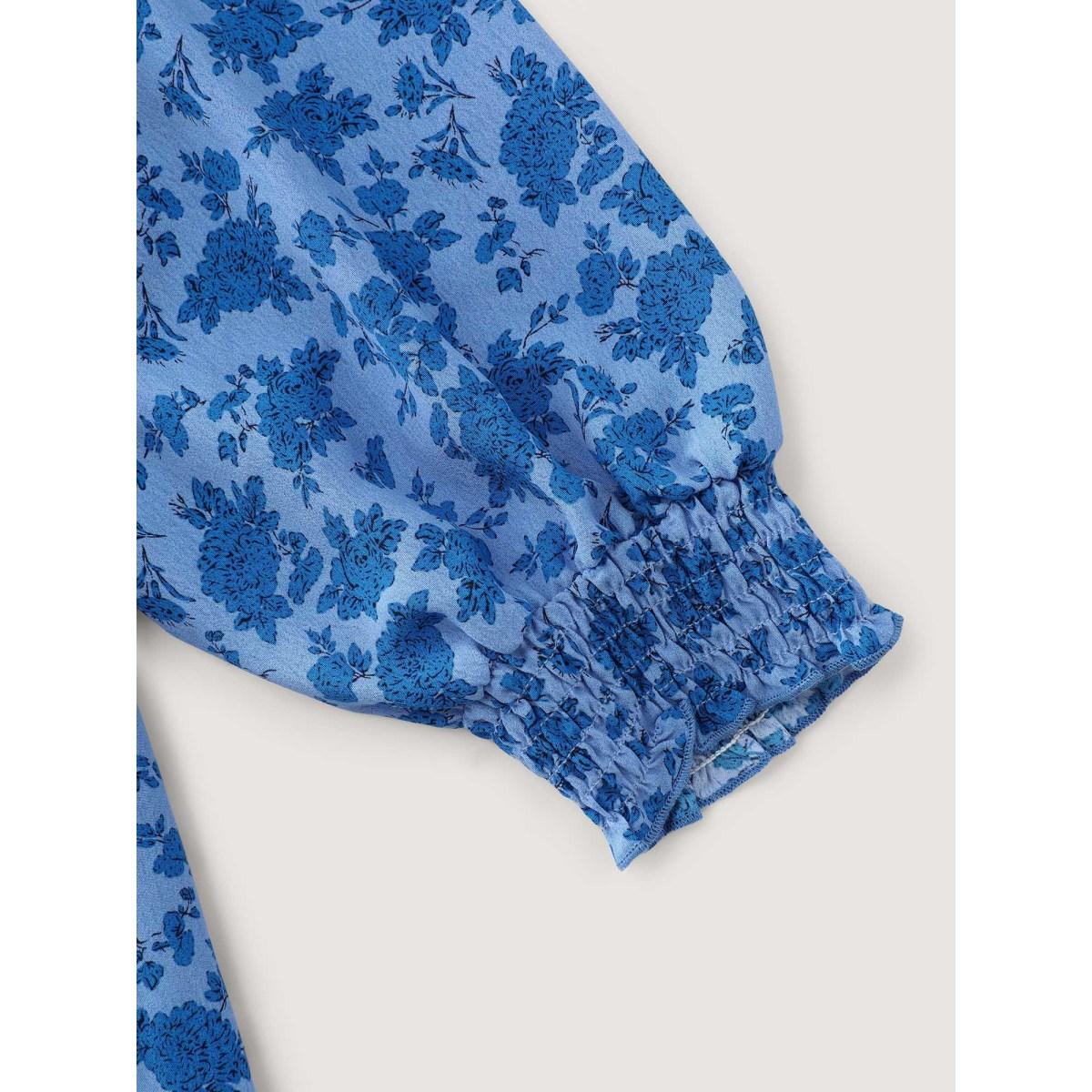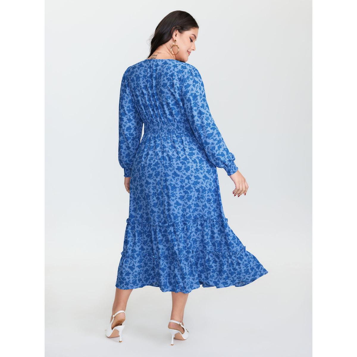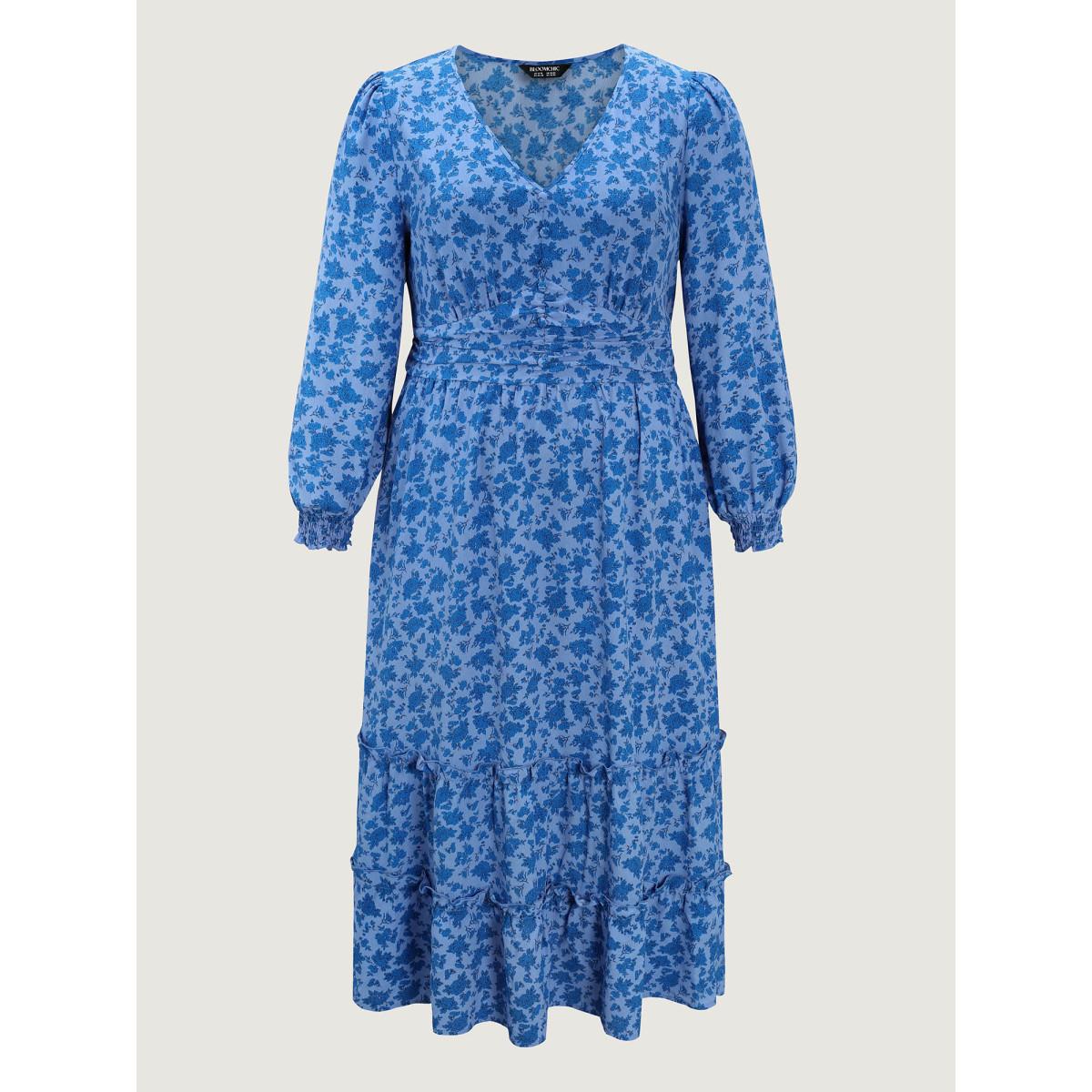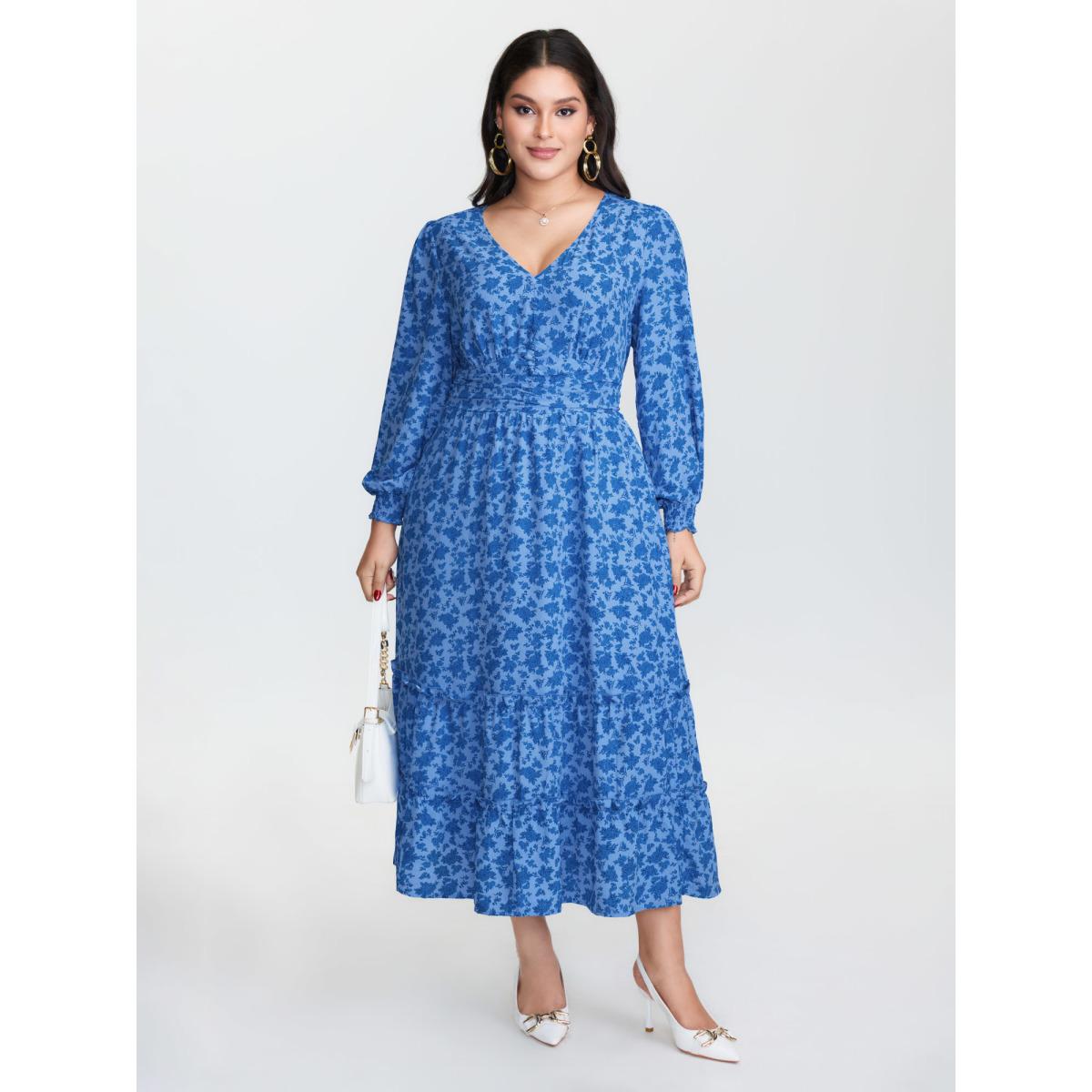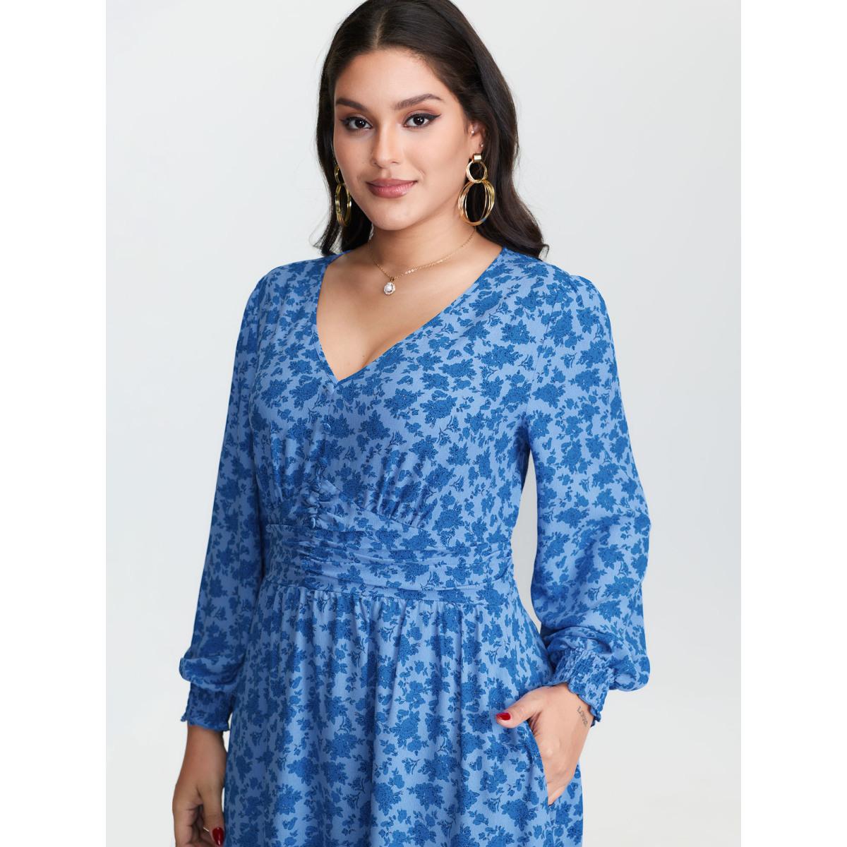 Plus Size Floral Pleated Waist Button Ruffled Midi Dress Skyblue Women Timeless Shirred Deep V-neck Long Sleeve Curvy BloomChic 28/5X