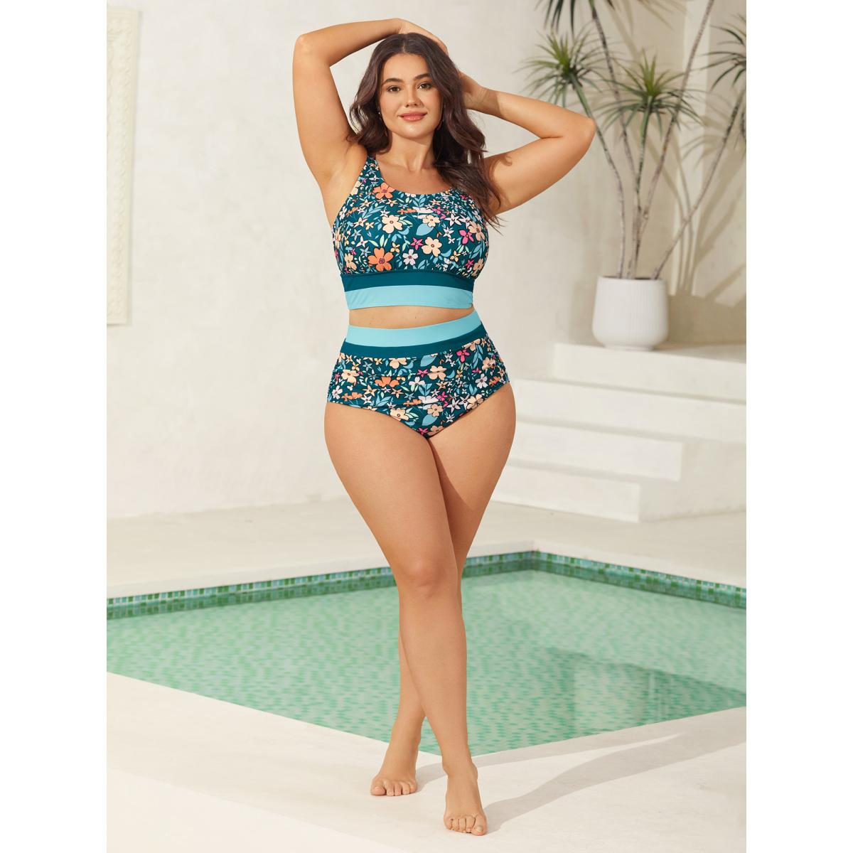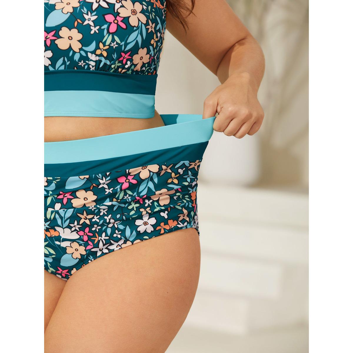 Plus Size Floral Print Color Contrast Swim Bottoms Women's Swimwear Cyan Resort Contrast High stretch Skinny High Rise Curve Swim Bottoms BloomChic 18-20/2X