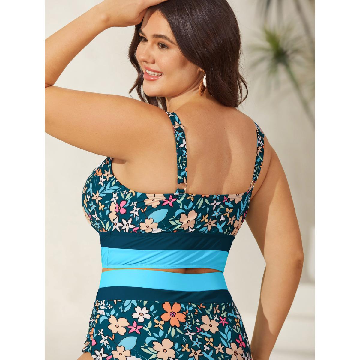 Plus Size Floral Print Color Contrast Swim Top Women's Swimwear Aegean Resort Contrast High stretch Skinny U-neck Curve Swim Tops BloomChic 26/4X