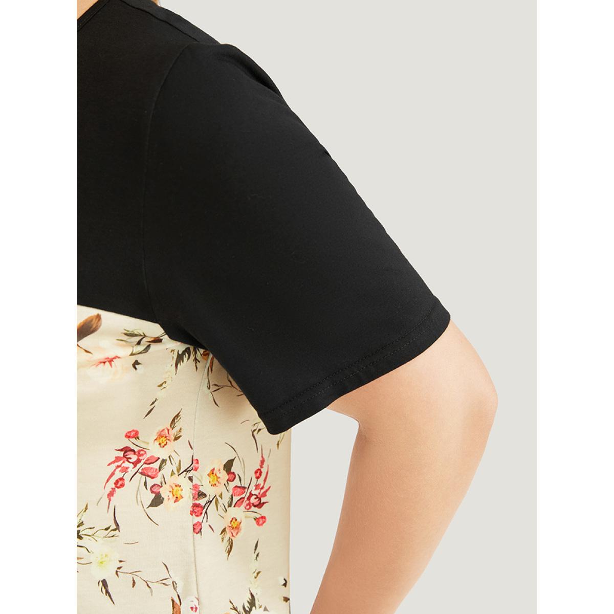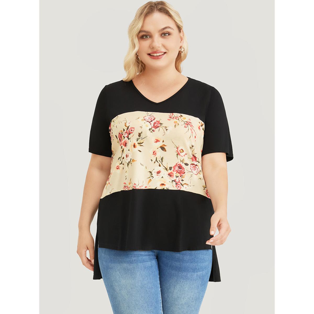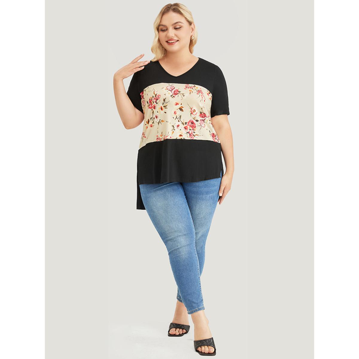 Plus Size Floral Print Colorblock Contrast Split High Low Hem T-shirt Black Women Elegant Floral V-neck Dailywear T-shirts BloomChic 12/L