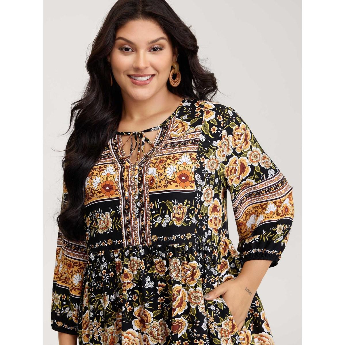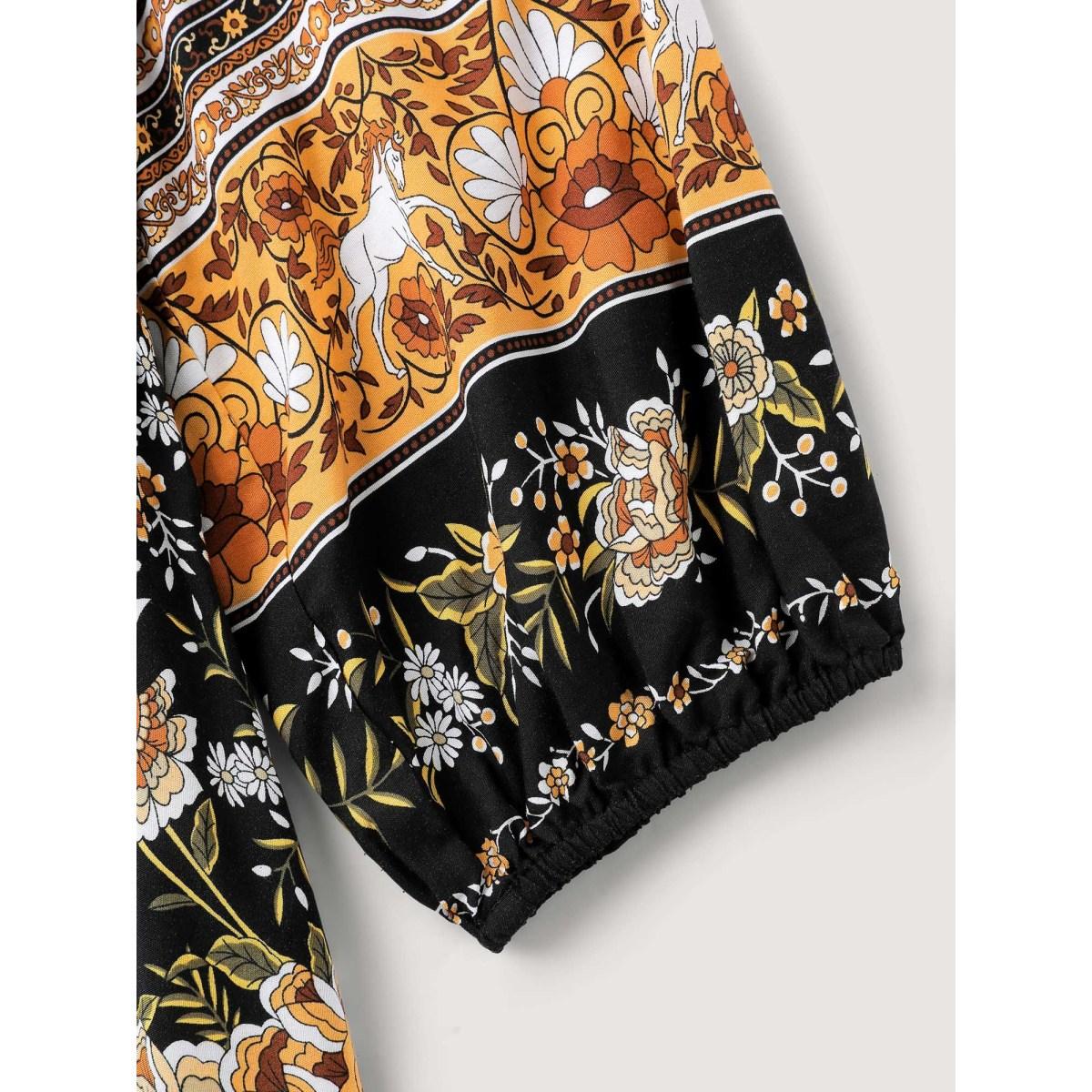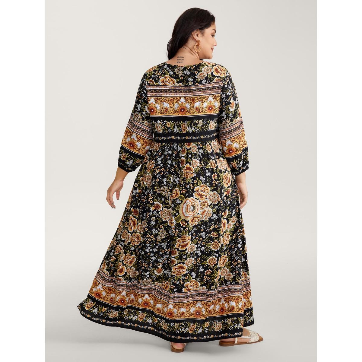Plus Size Floral Print Contrast Puffy Sleeve Maxi Dress BlackFlower Women Boho Printed Flat collar with V-notch Cap Sleeve Curvy BloomChic 28/5X