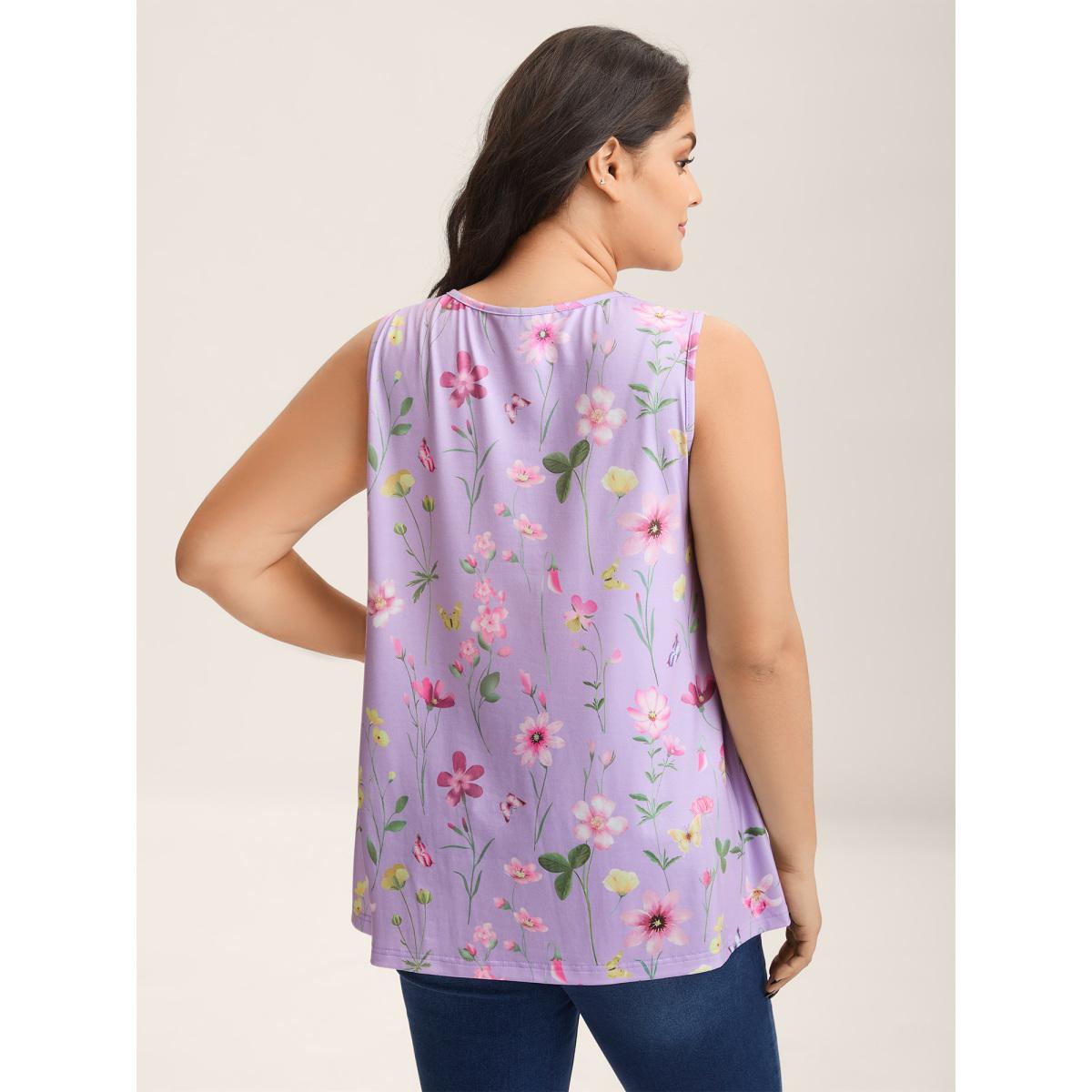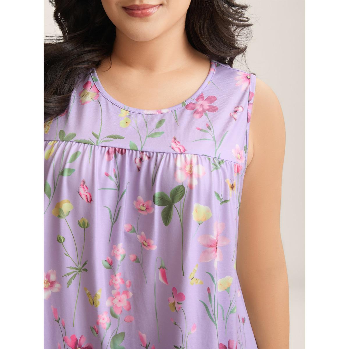 Plus Size Floral Print Flowy Pleated Tank Top Women Lilac Gathered Round Neck Everyday-Casual Tank Tops Camis BloomChic 10/M
