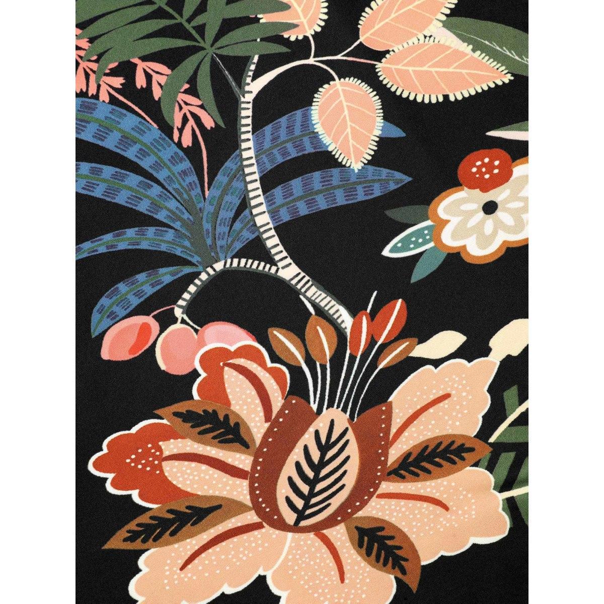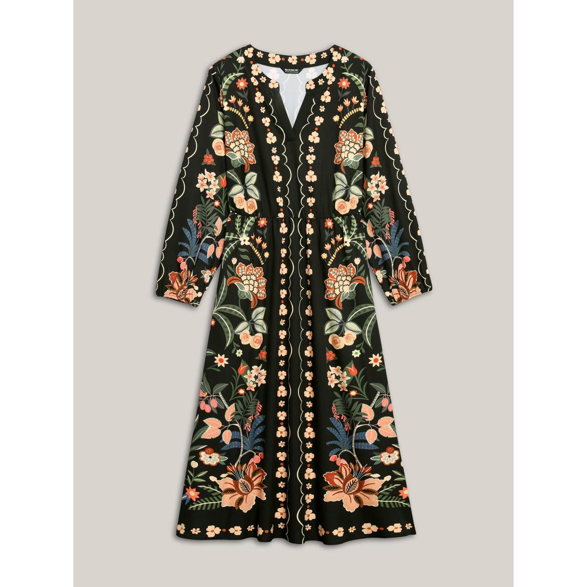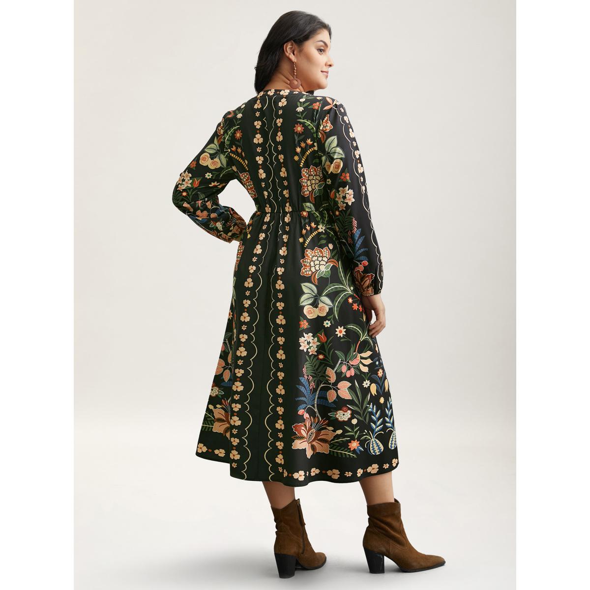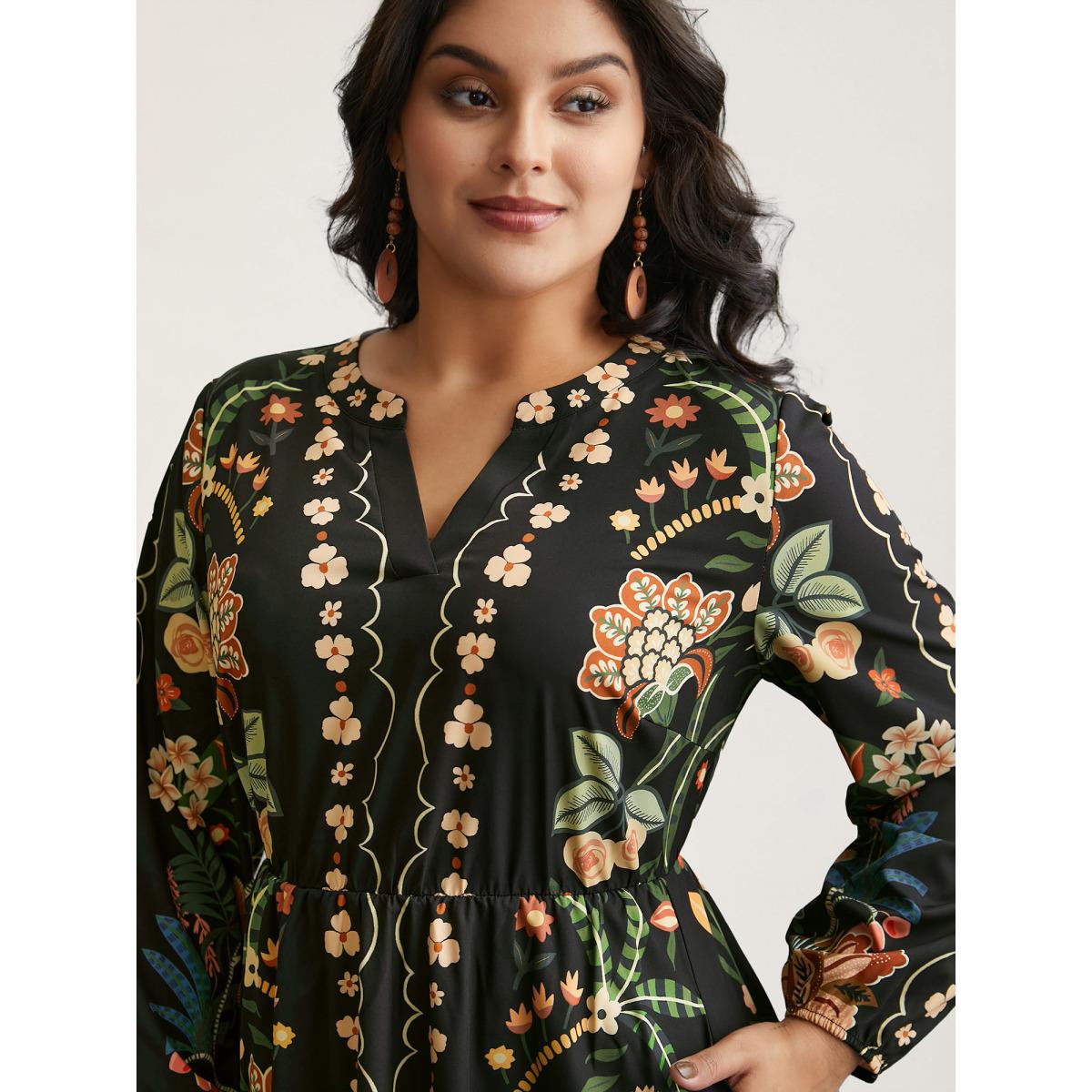 Plus Size Floral Print Notched Collar Elastic Waist Dress Black Women Resort Elastic cuffs Flat collar with V-notch Long Sleeve Curvy BloomChic 10/M