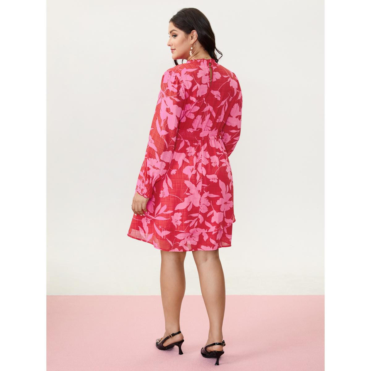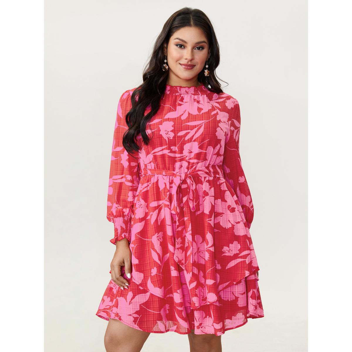 Plus Size Floral Print Pleated Waist Mock Neck Mini Dress Multicolor Women Romantic Tie knot Wrap collar Long Sleeve Curvy BloomChic 12/L