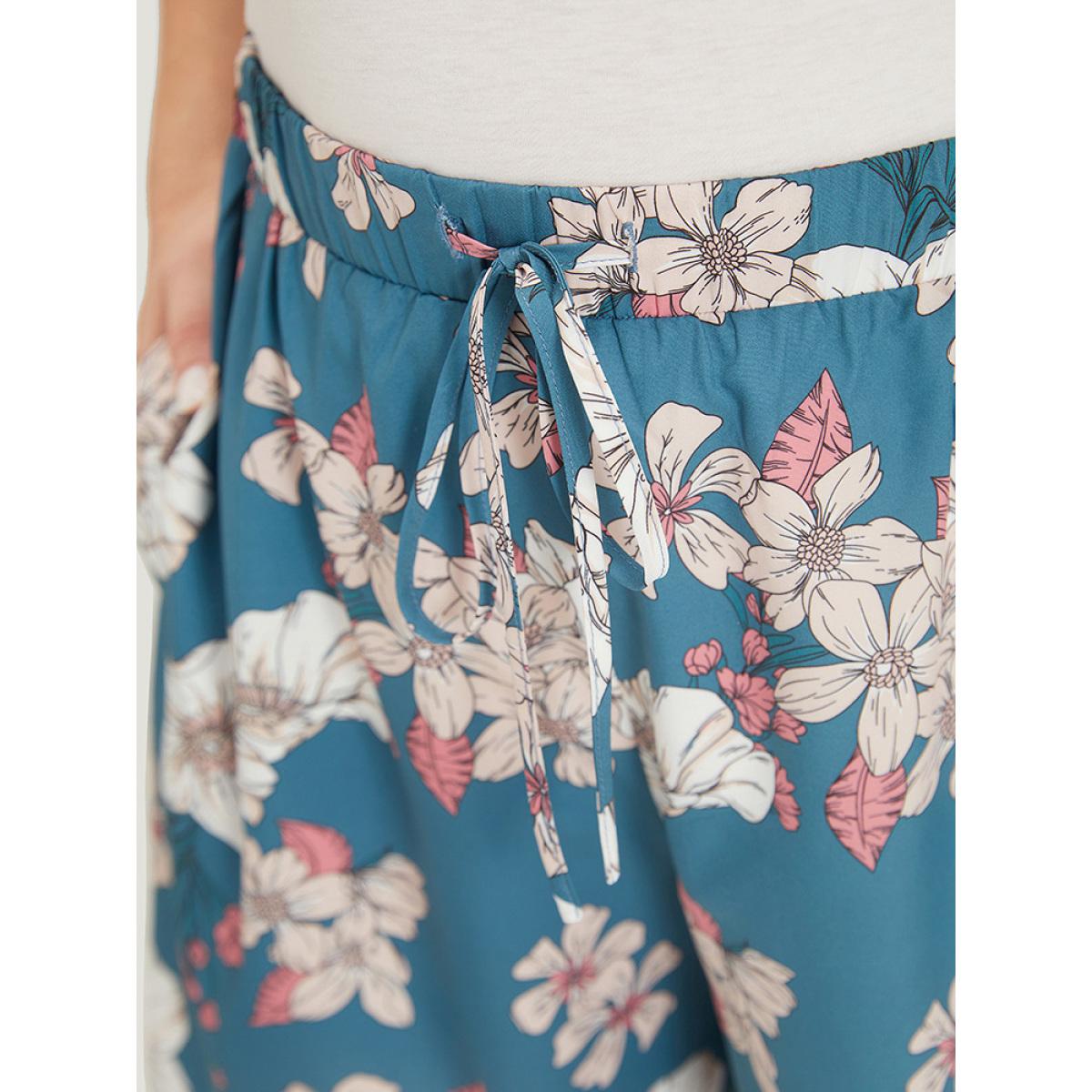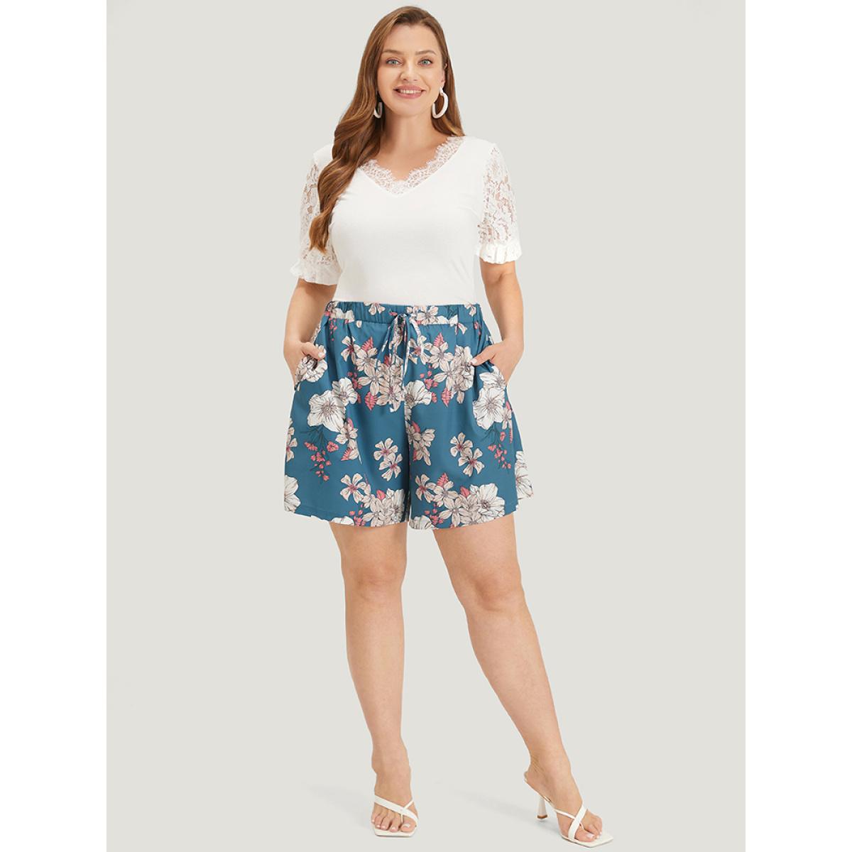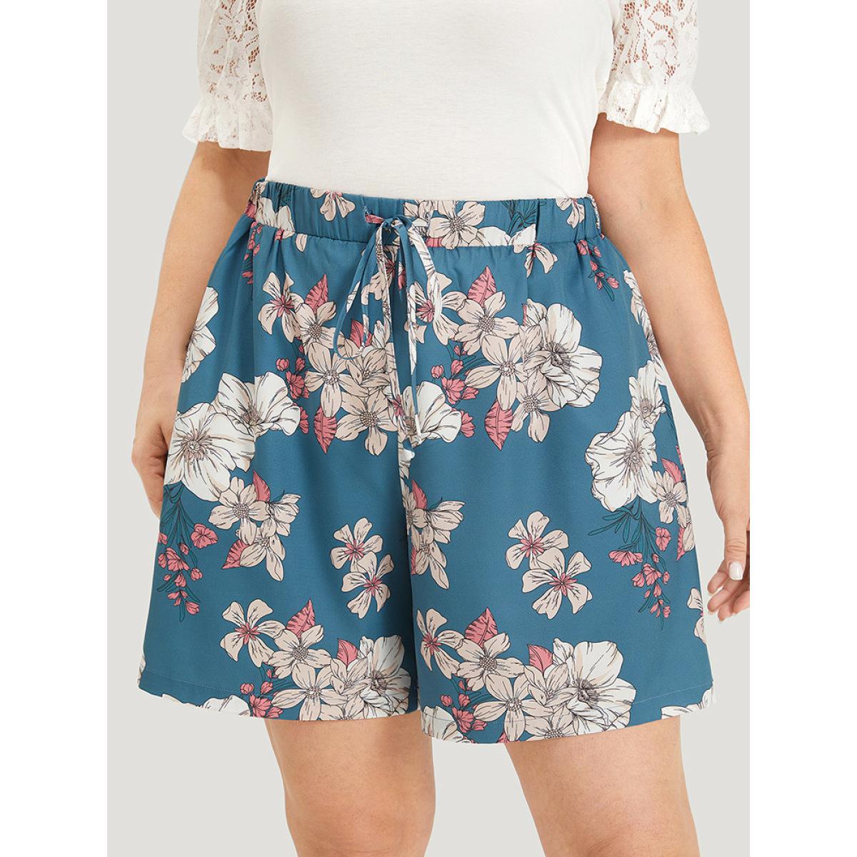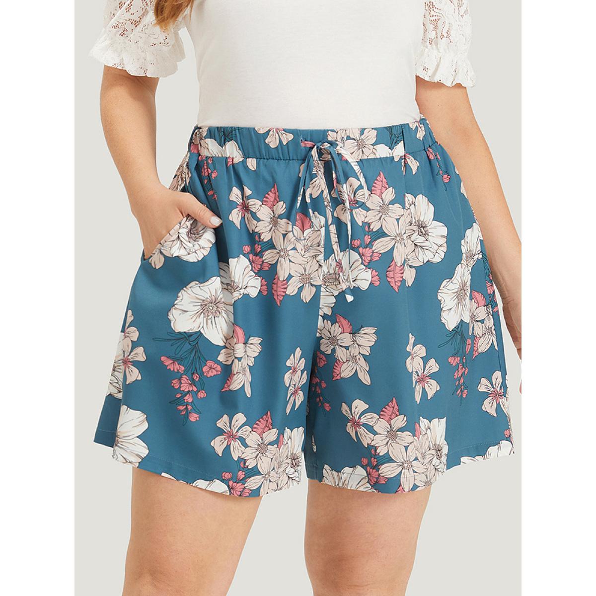 Plus Size Floral Print Pocket Ties Elastic Waist Shorts Women Cerulean Elegant Elastic Waist Dailywear Shorts BloomChic 14-16/1X