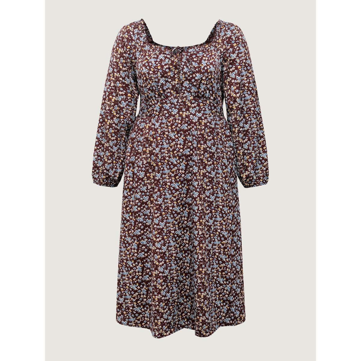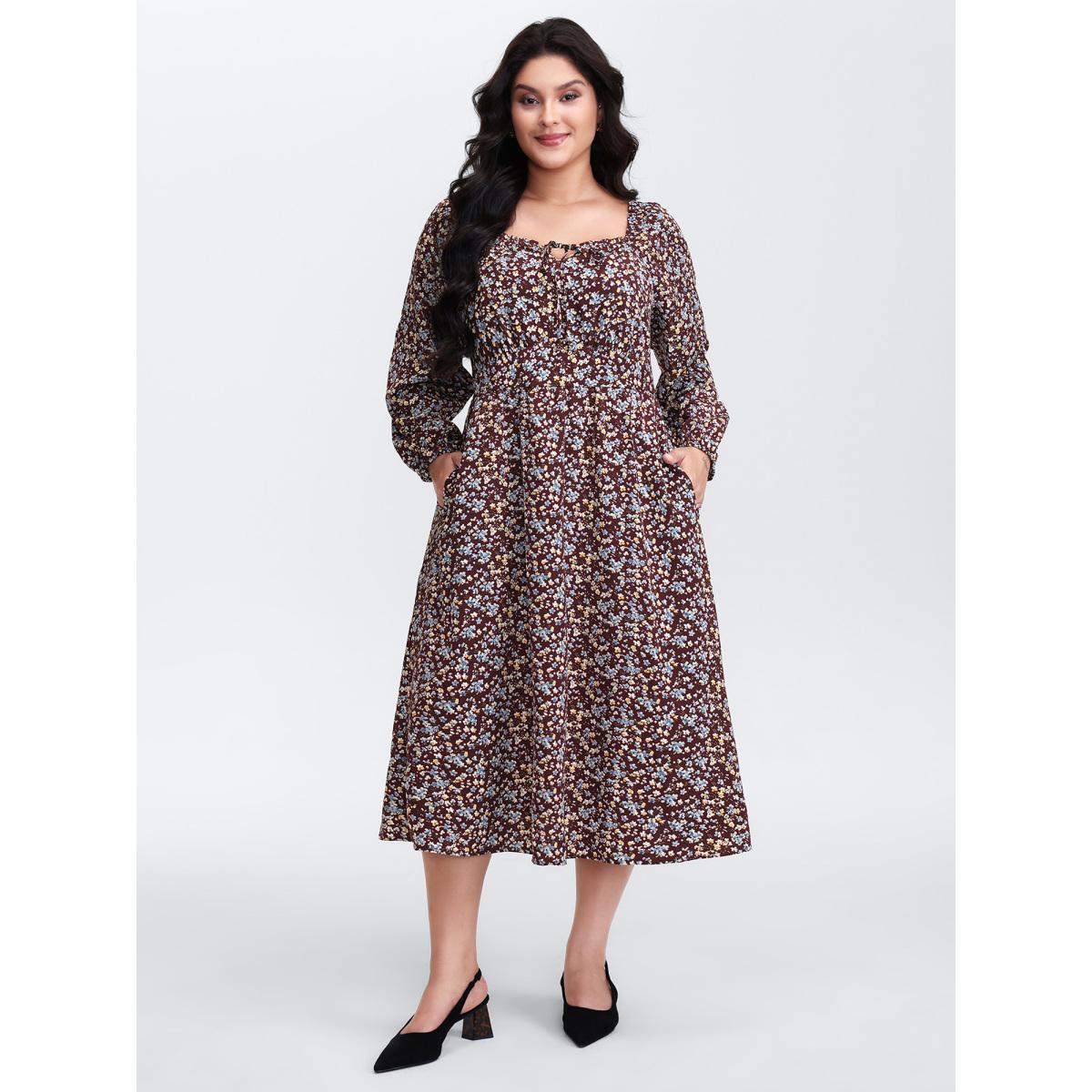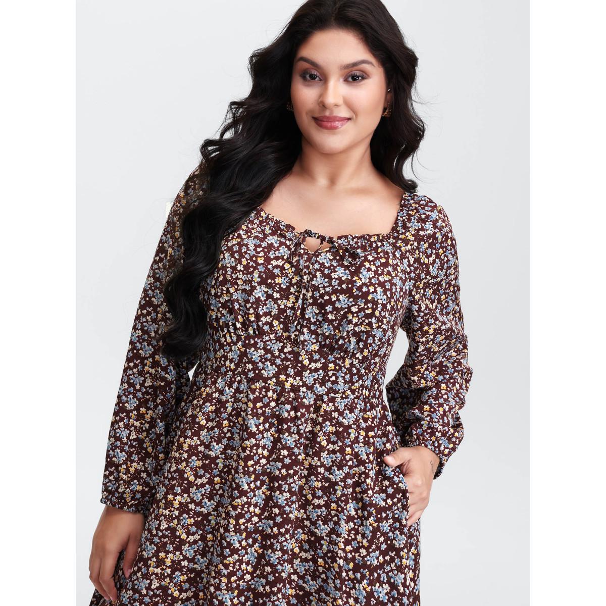 Plus Size Floral Print Pockets Neckline Tie Maxi Dress Burgundy Women Timeless Tie knot Asymmetrical Neck Long Sleeve Curvy BloomChic 22-24/3X