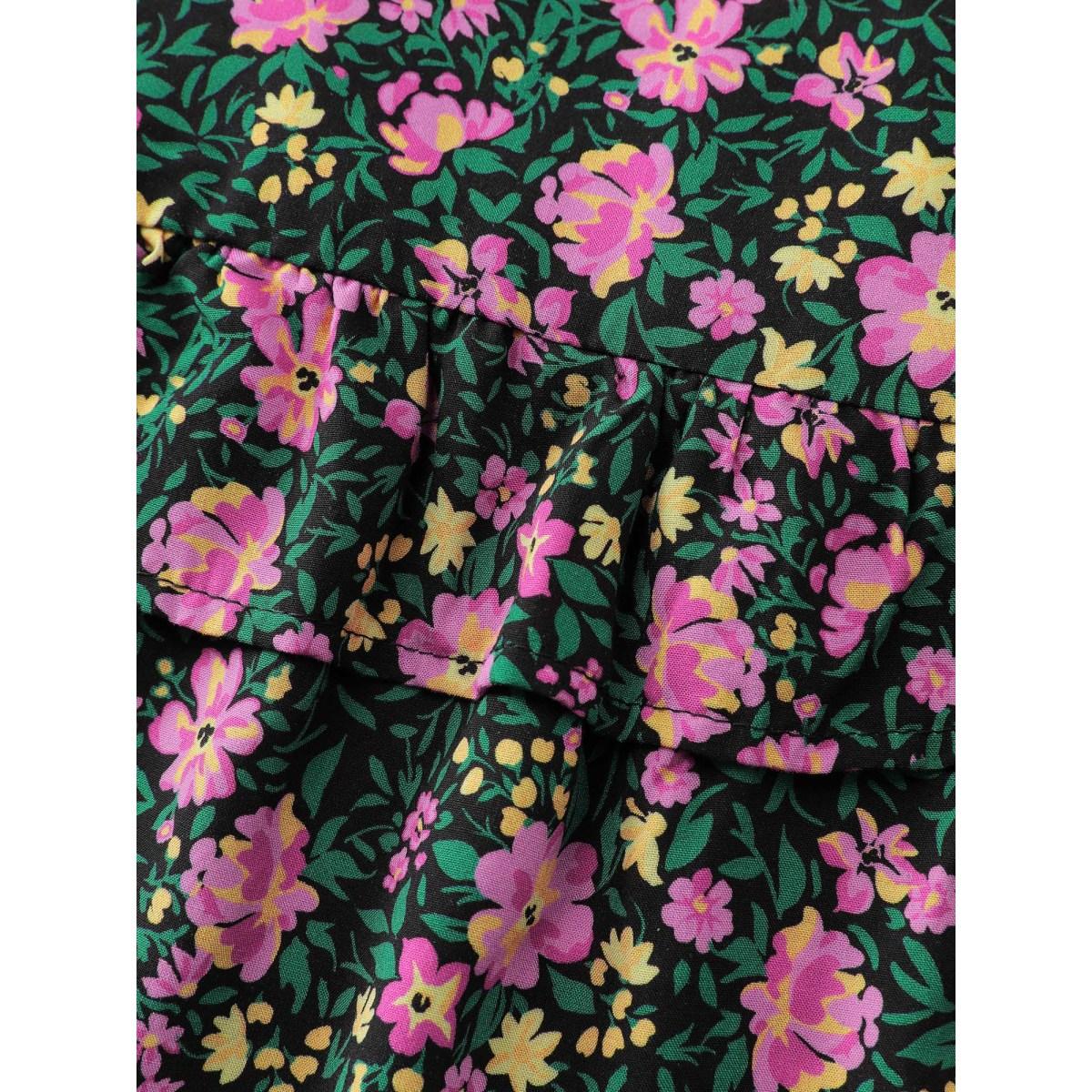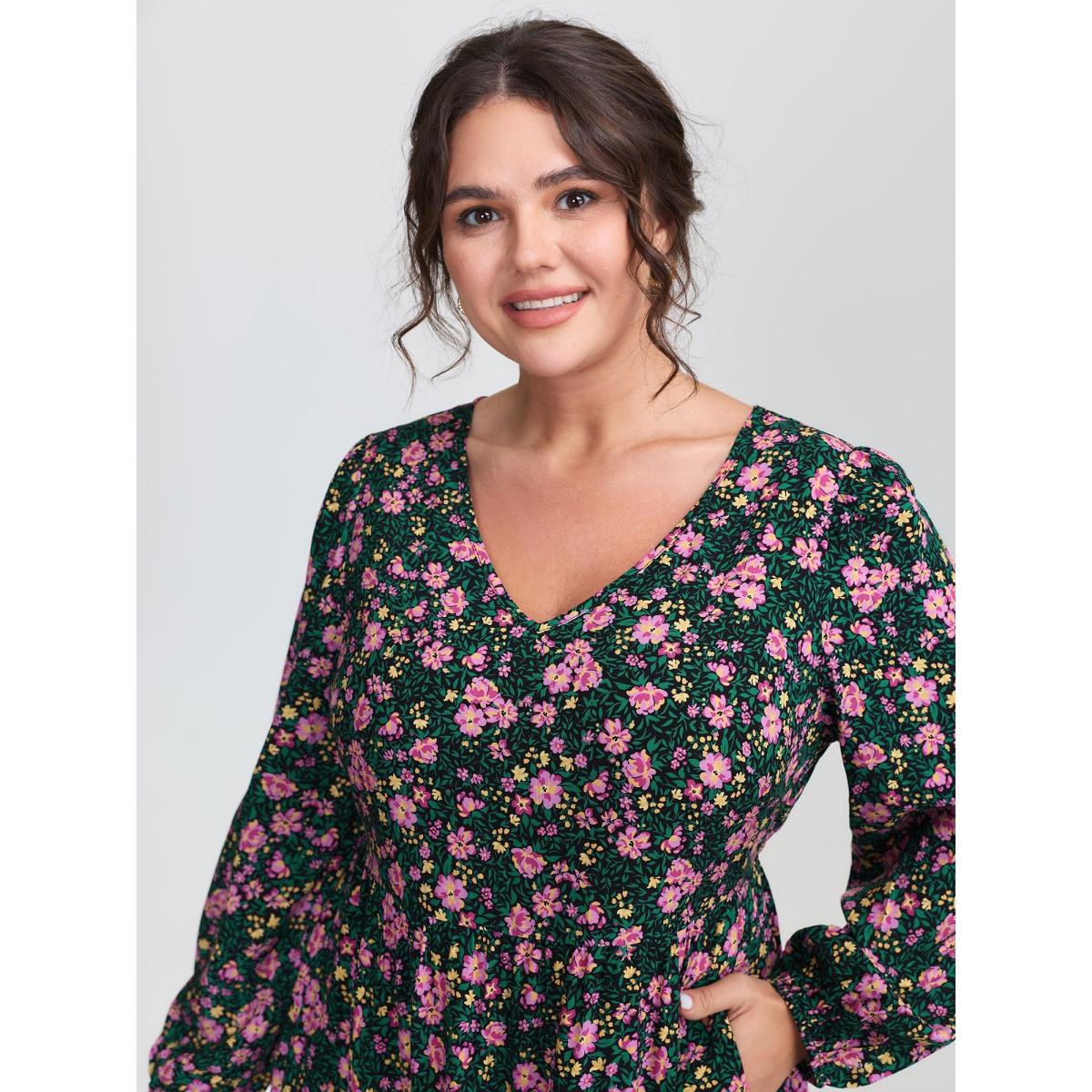 Plus Size Floral Print Contrast V Neck Pocket Gathered Ruffles Dress Green Women Elegant V-neck Short sleeve Curvy Midi Dress BloomChic 30/6X