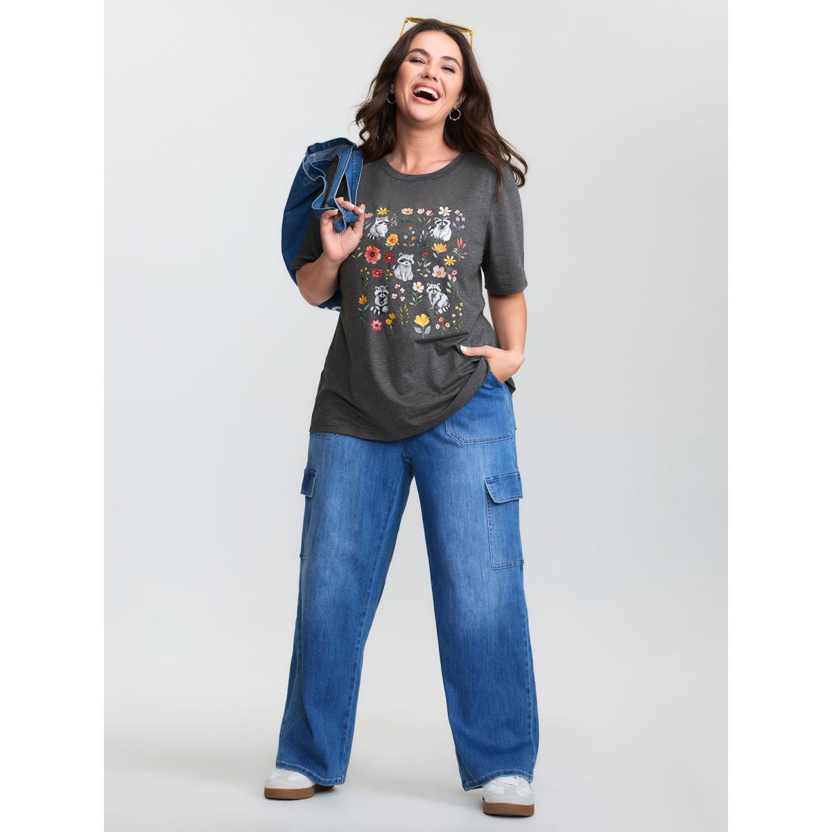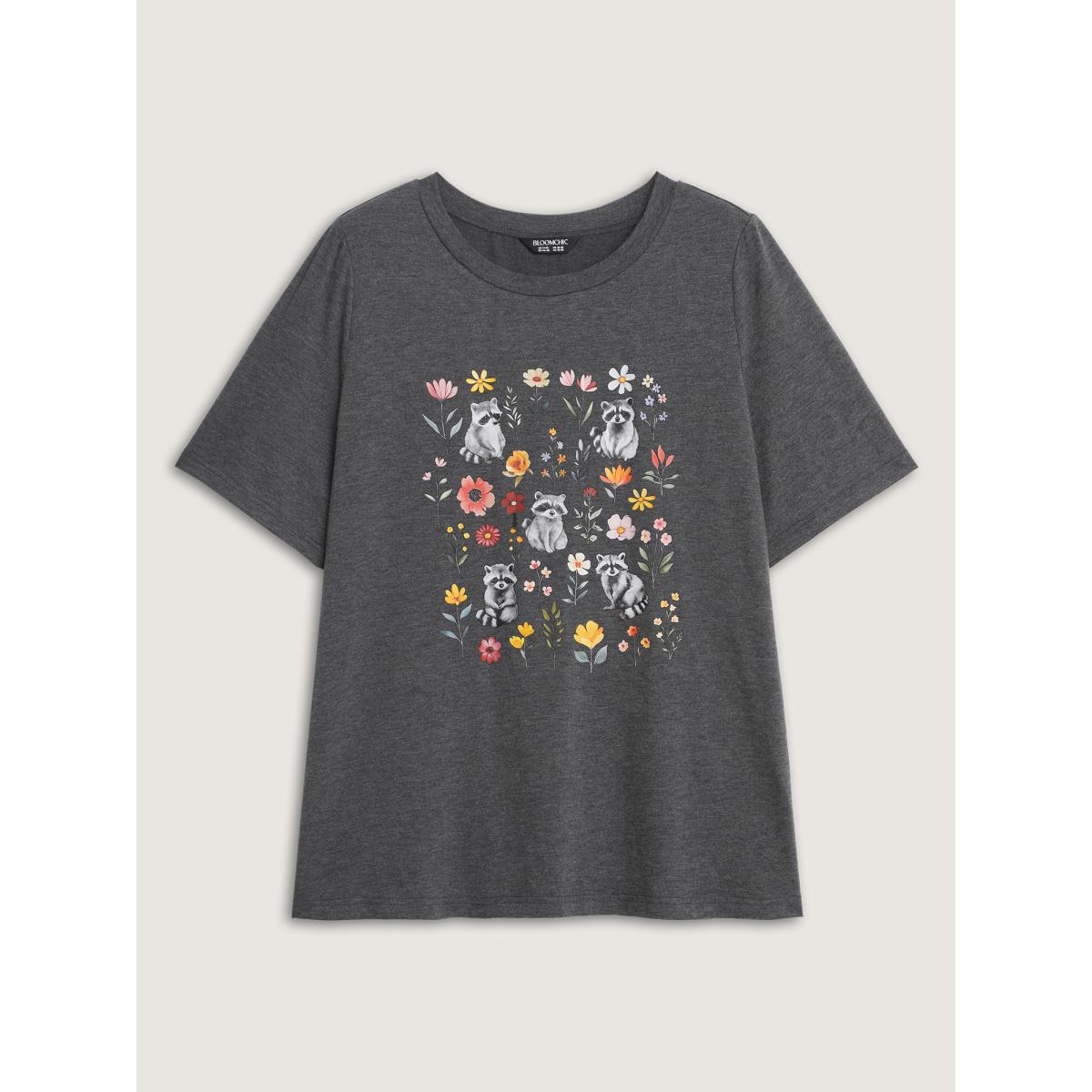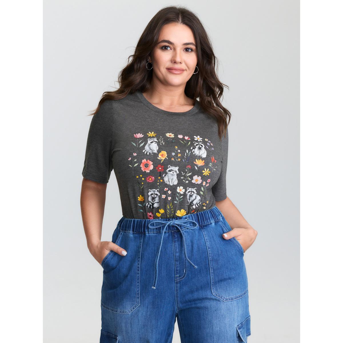 Plus Size Floral Print Stretchy Round Neck T-Shirt DimGray Women Playful Animals Round Neck Casual T-shirts BloomChic 30/6X