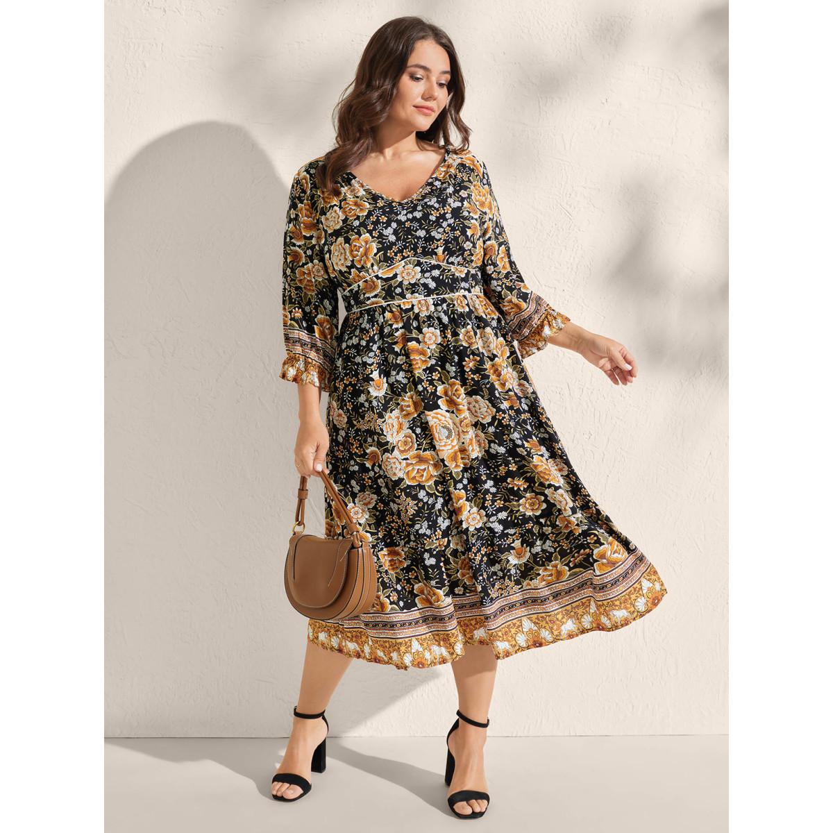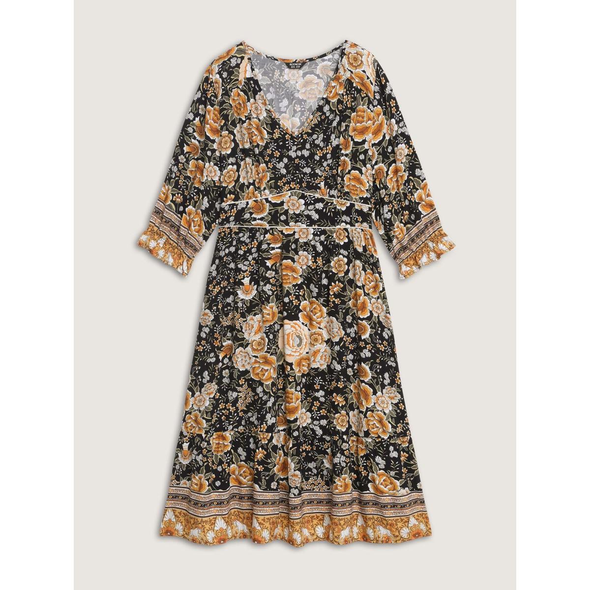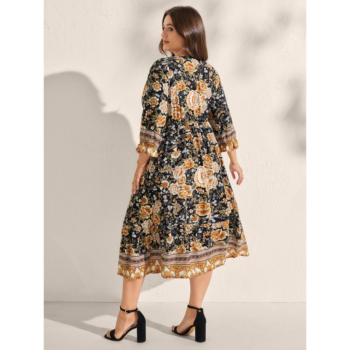 Plus Size Floral Print Waist-Cinched Contrast Midi Dress BlackFlower Women Boho Woven ribbon&lace trim V-neck Three Quarter Length Sleeve Curvy BloomChic 12/L