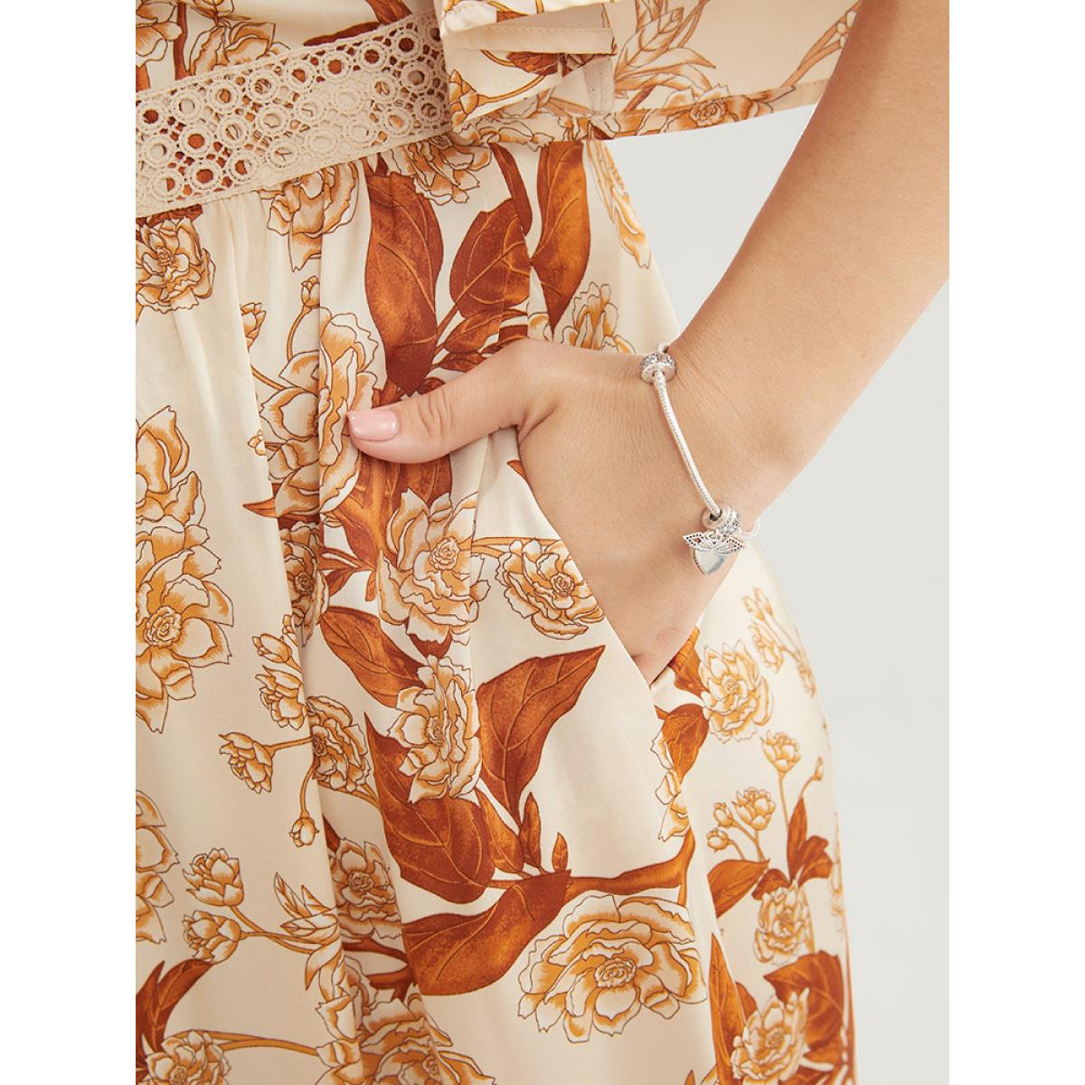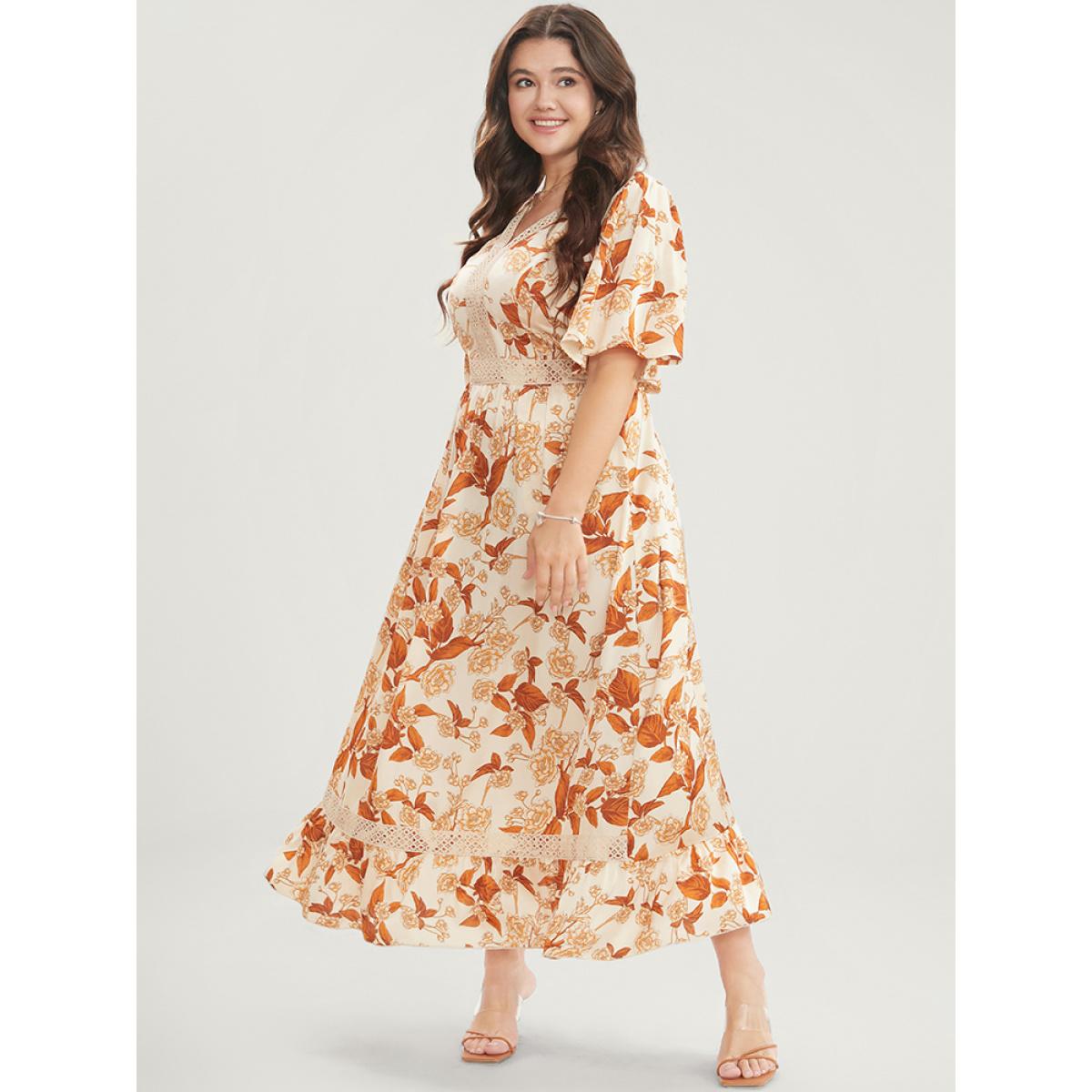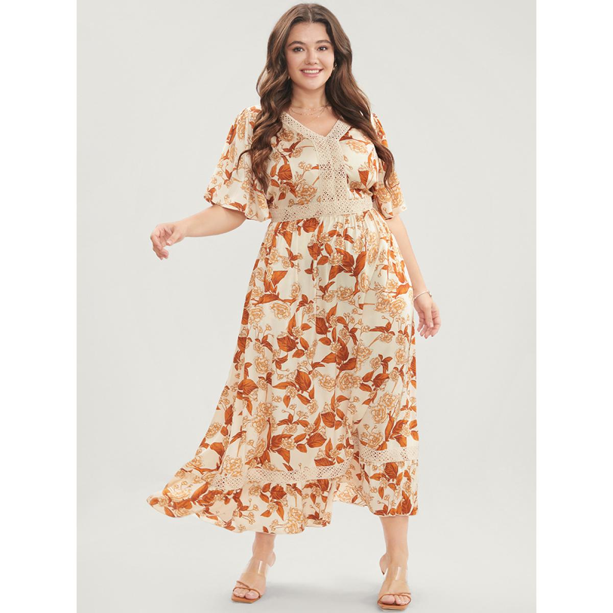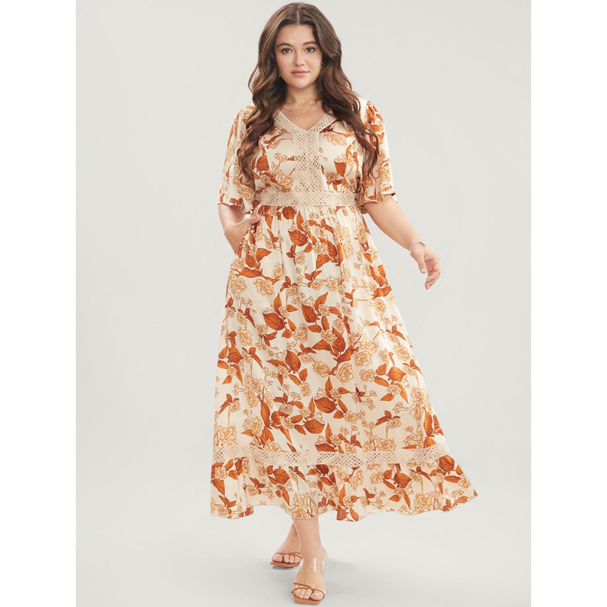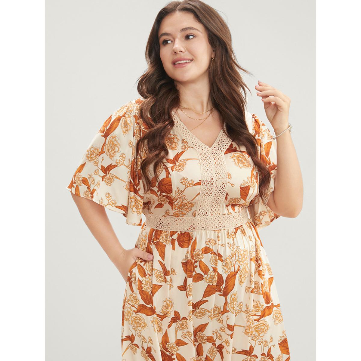 Plus Size Floral Printed Crochet Lace Pocket Flutter Maxi Dress Chocolate Women Elegant Gathered V-neck Half Sleeve Curvy Long Dress BloomChic 30/6X