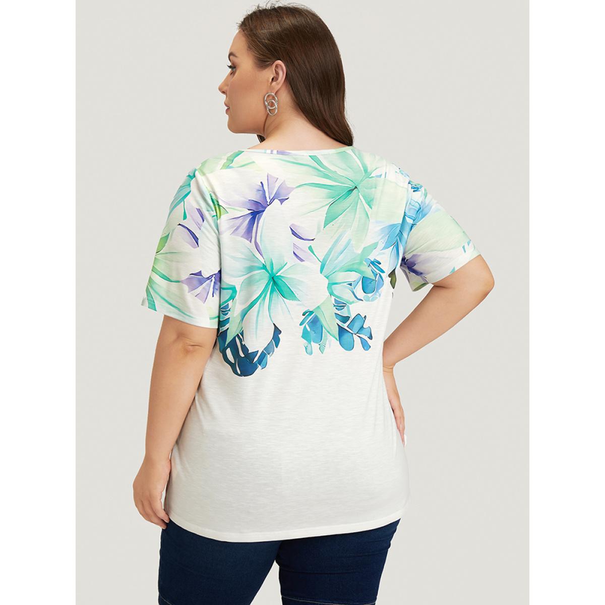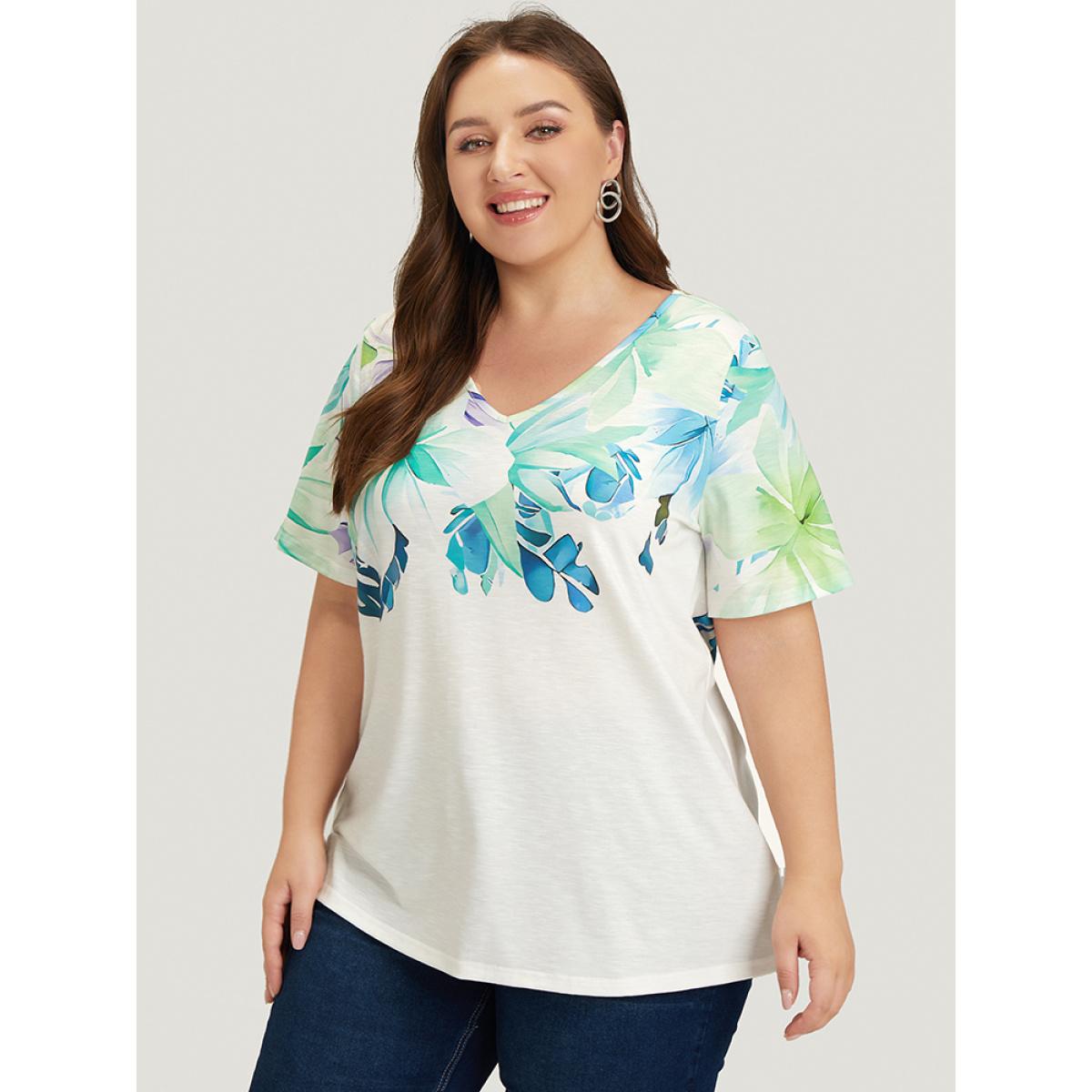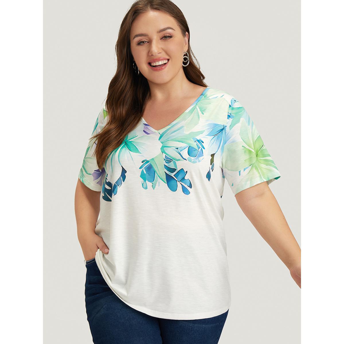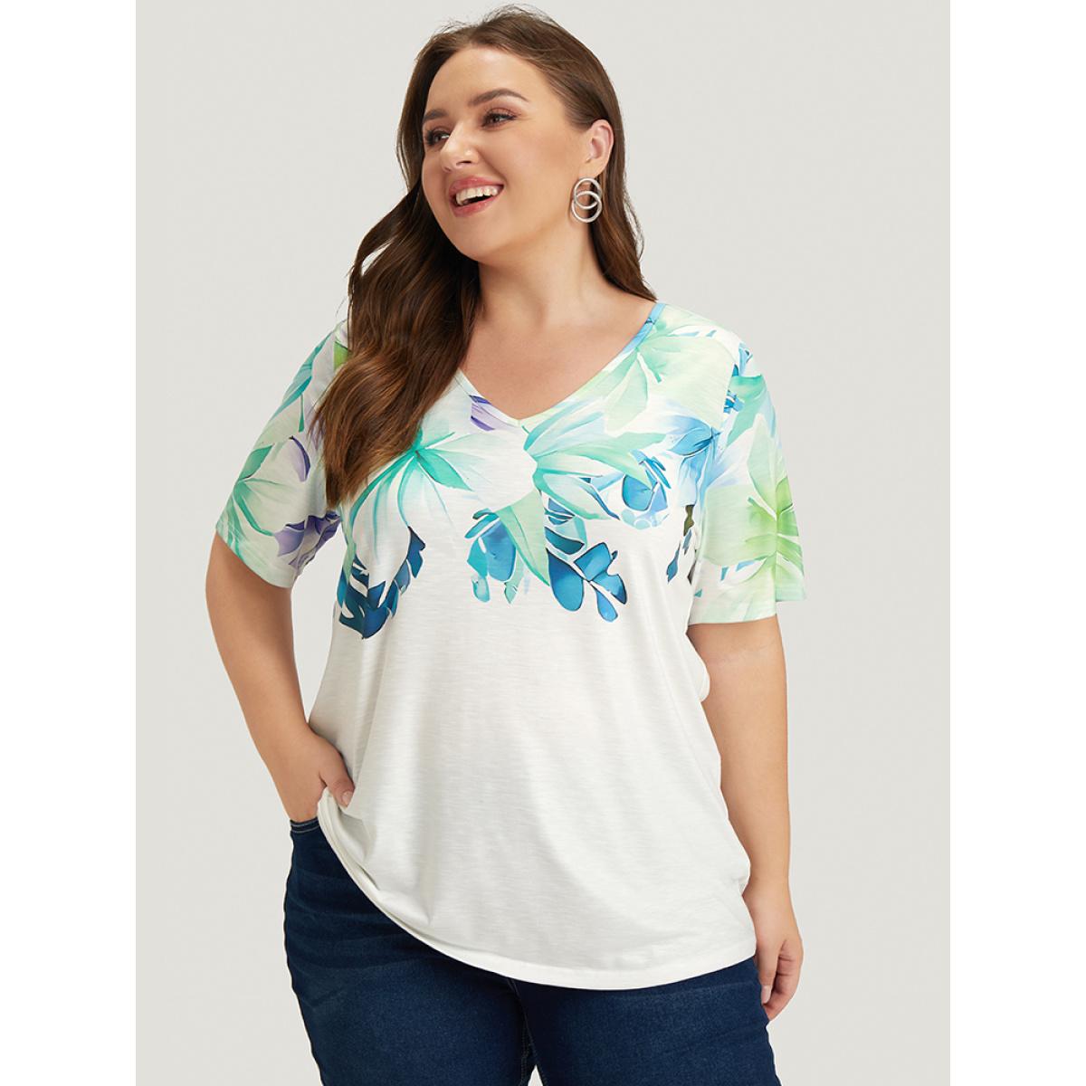 Plus Size Floral Crisscross V Neck T-shirt Multicolor Women Elegant Floral V-neck Everyday T-shirts BloomChic 10/M