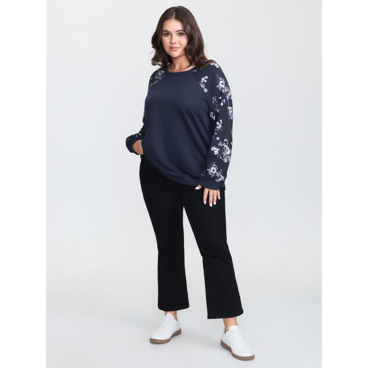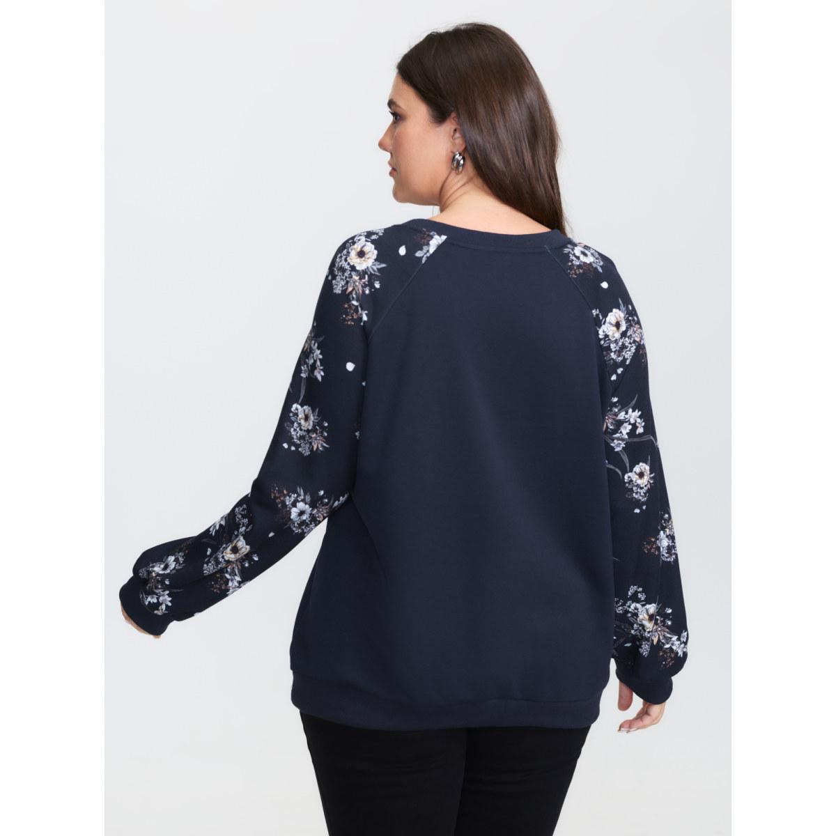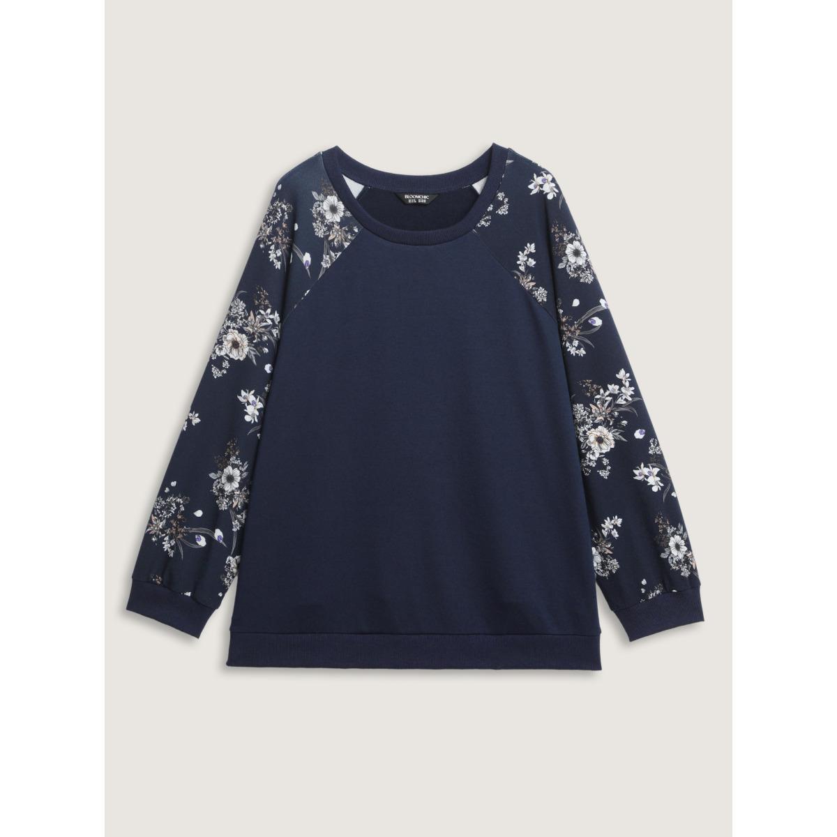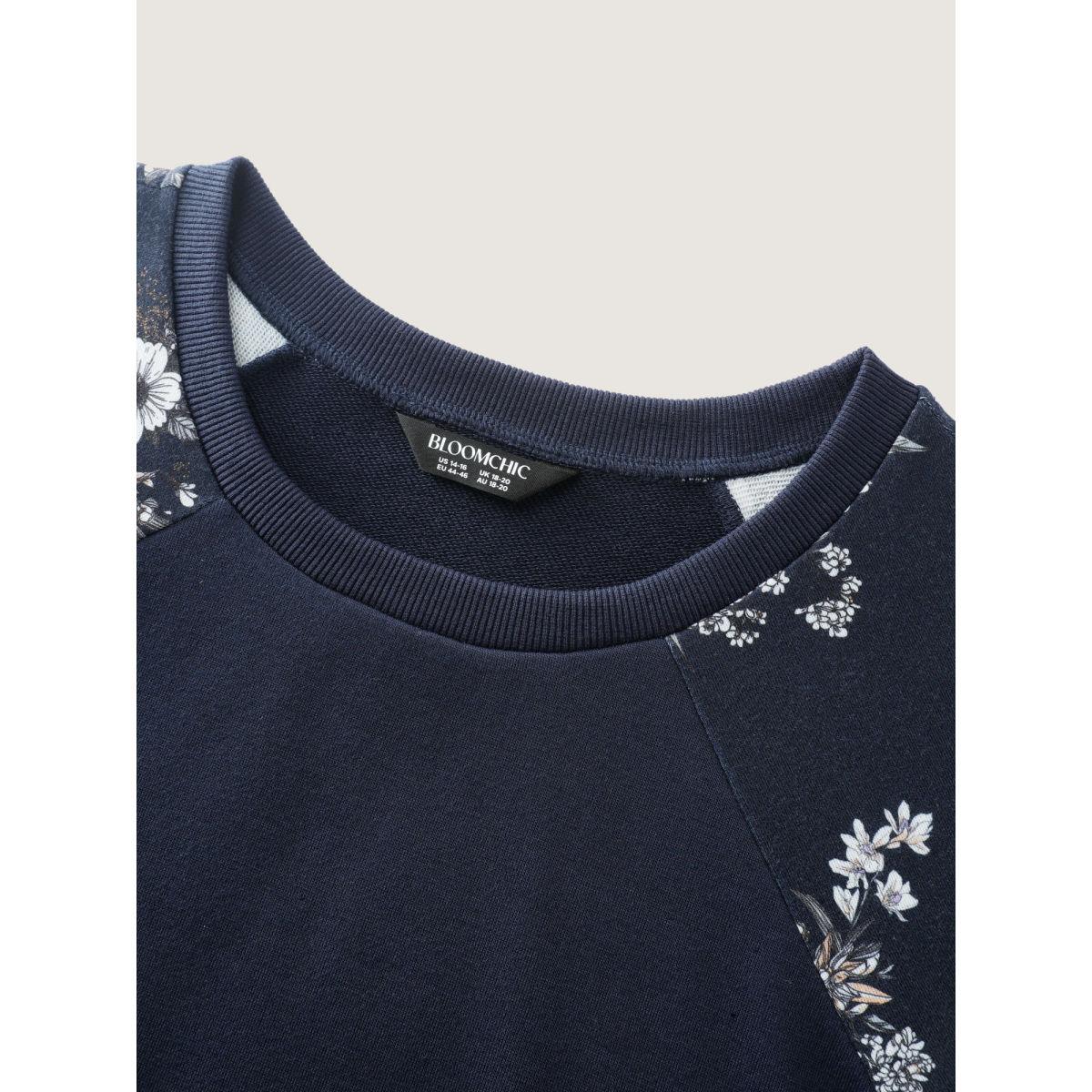 Plus Size Floral Print Raglan Sleeve Patchwork Sweatshirt Women DarkBlue Elegant Printed Round Neck Everyday Sweatshirts BloomChic 10/M