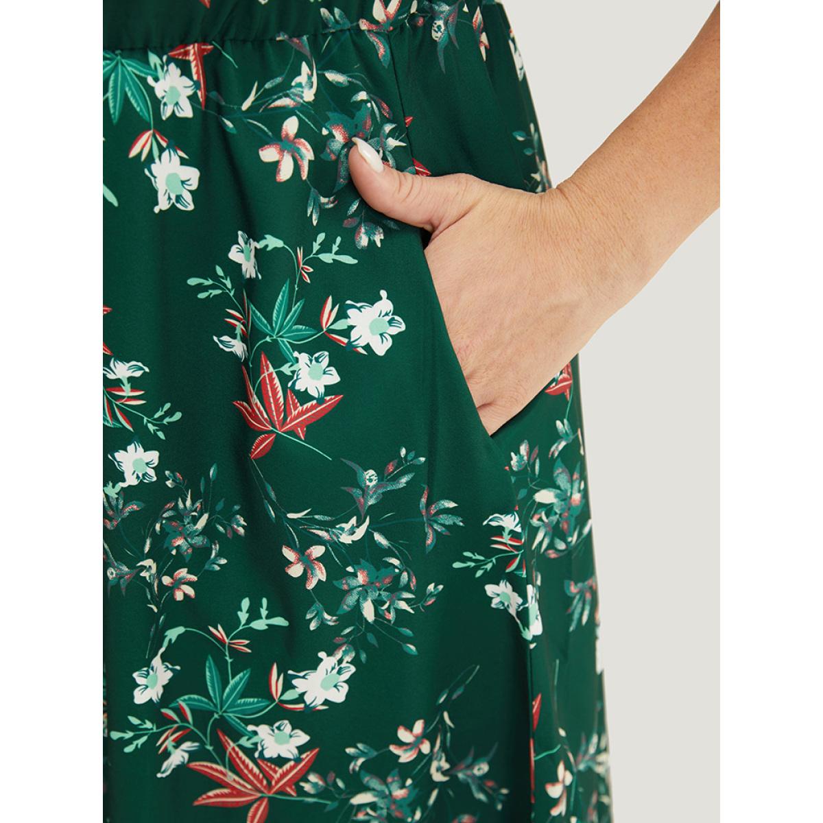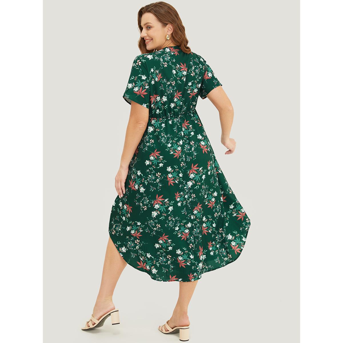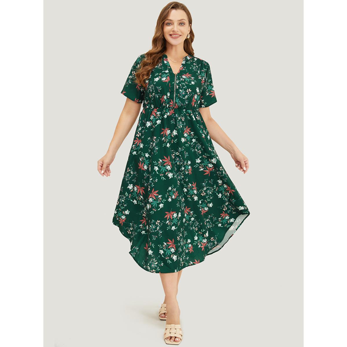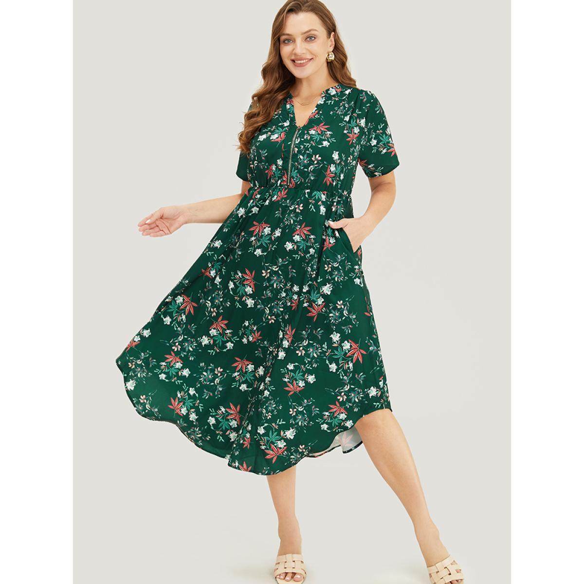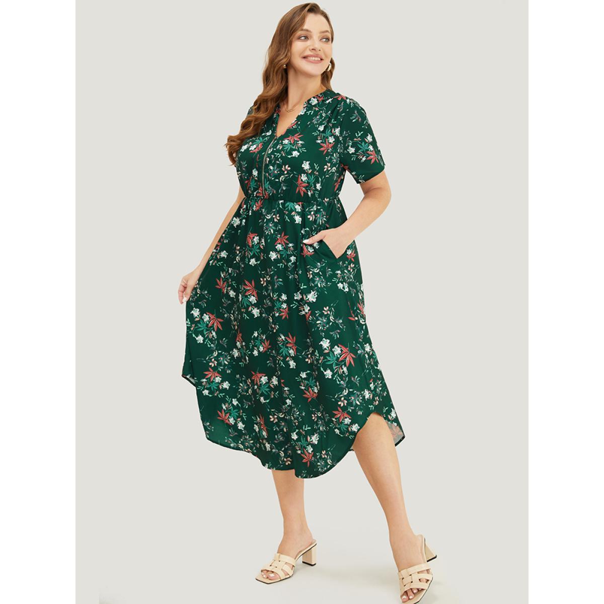 Plus Size Floral Ruffles Half Zipper Pocket Arc Hem Dress DarkGreen Women Elegant Zipper V-neck Short sleeve Curvy Midi Dress BloomChic 28/5X