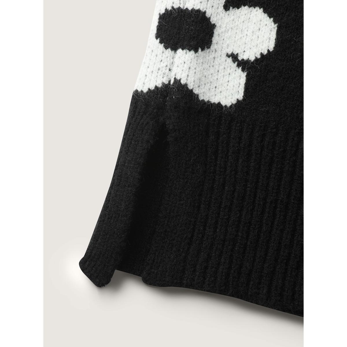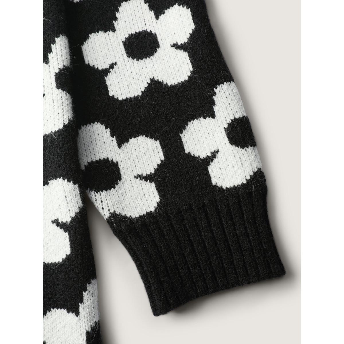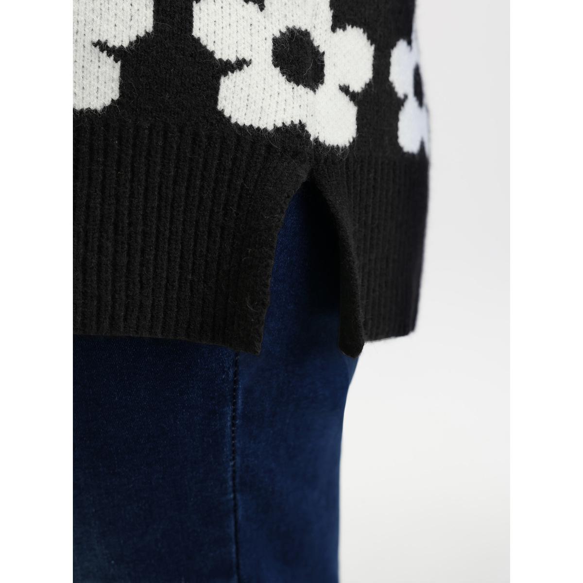 Plus Size Floral Split Hem Color Contrast Pullover Black Women Playful Loose Long Sleeve Round Neck Casual Pullovers BloomChic 10/M