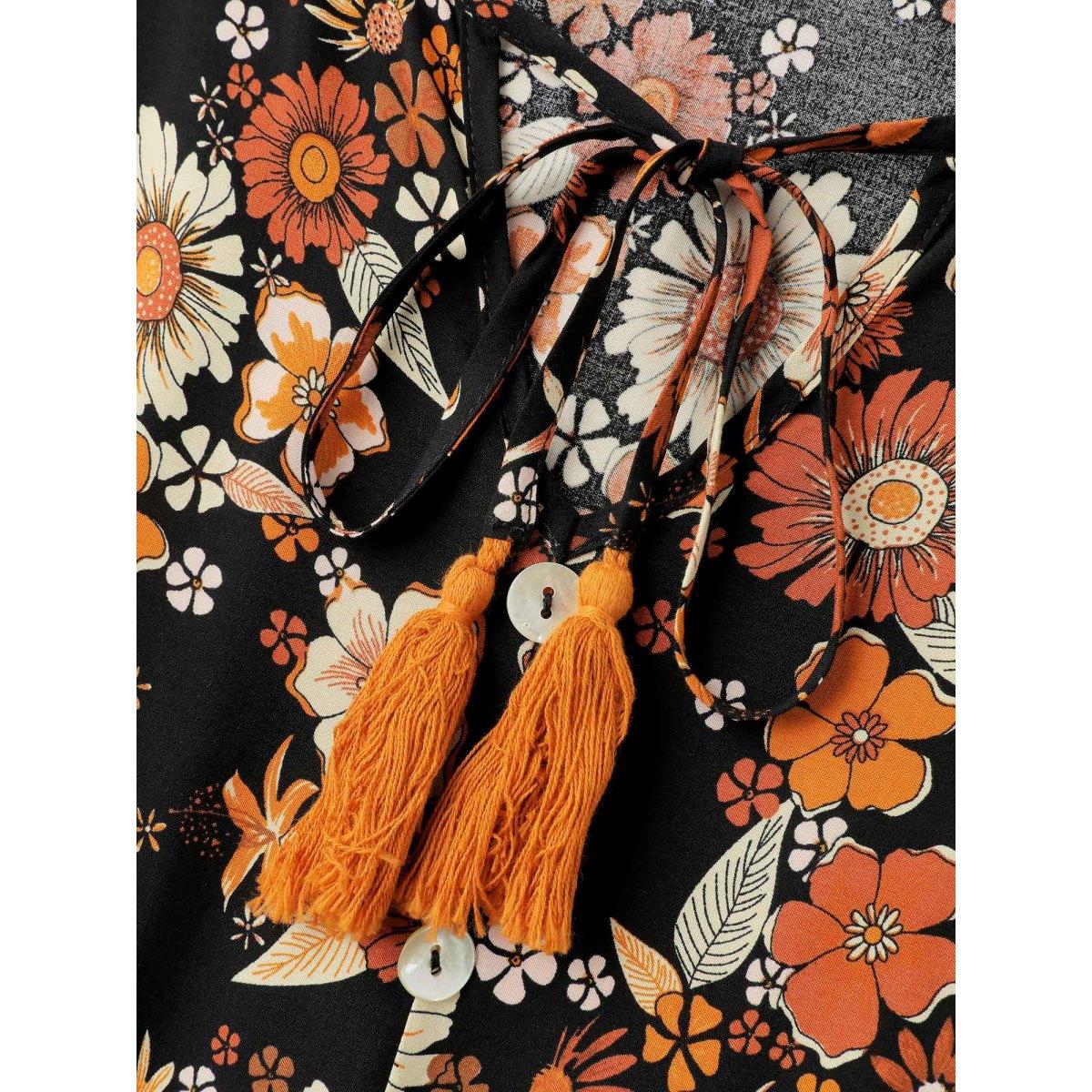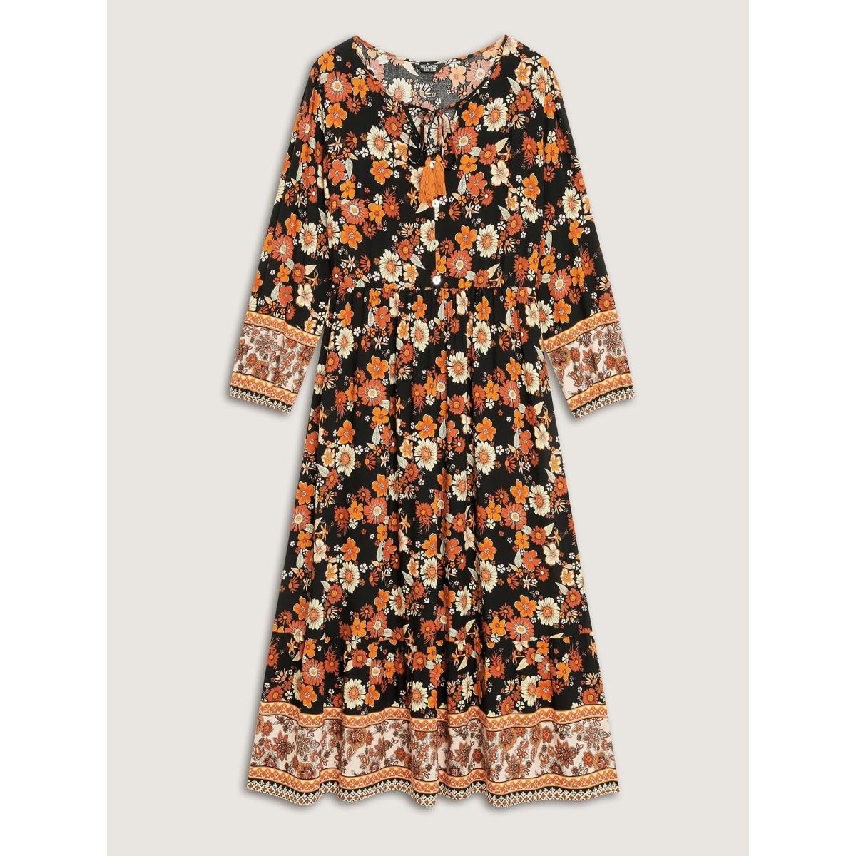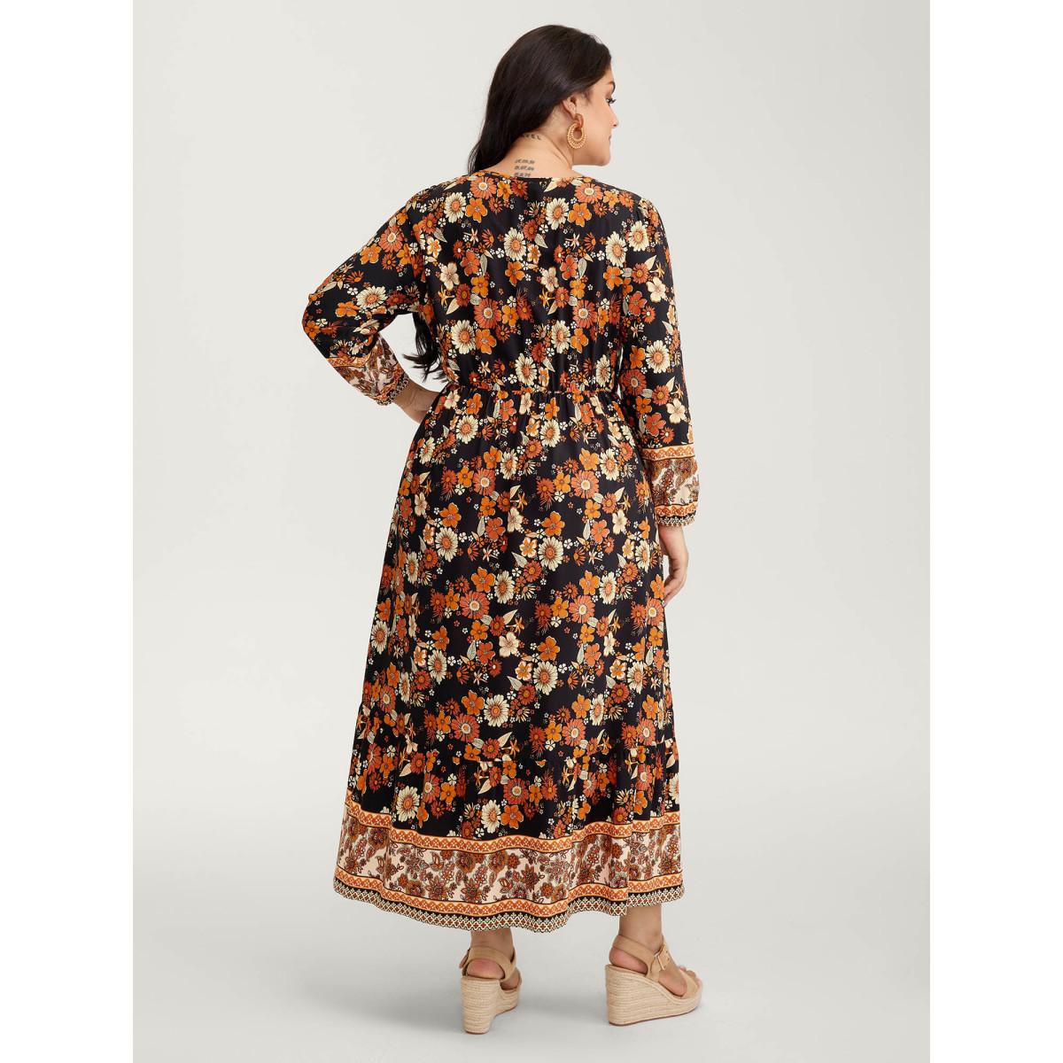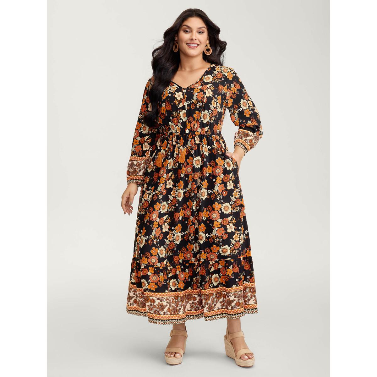 Plus Size Floral Stretchy Waist Neck-Tie Maxi Dress BlackFlower Women Boho Non Flat collar with V-notch Long Sleeve Curvy BloomChic 28/5X
