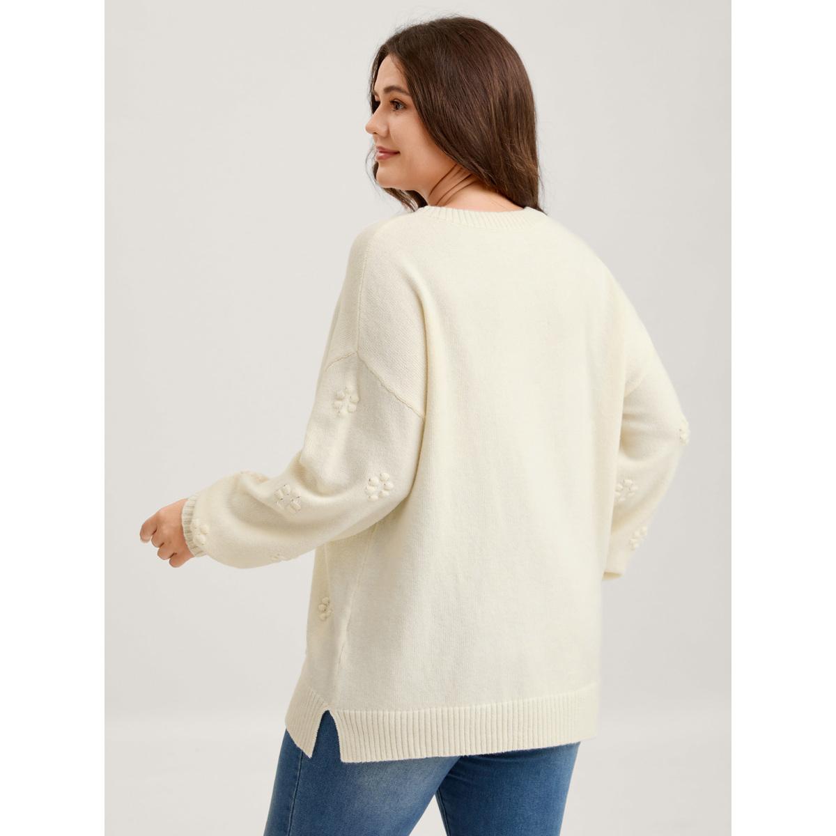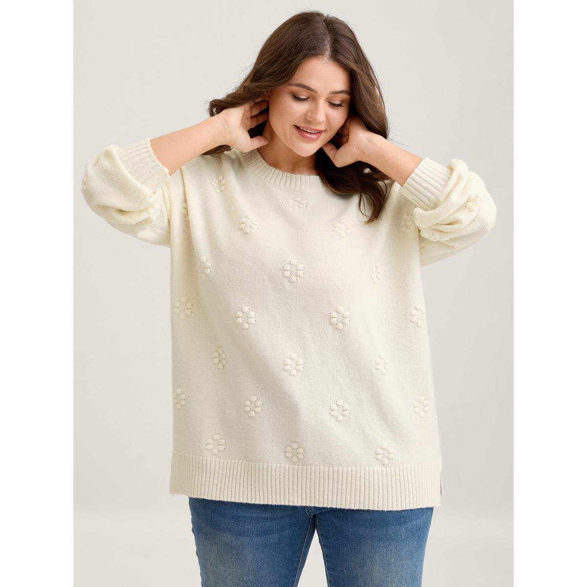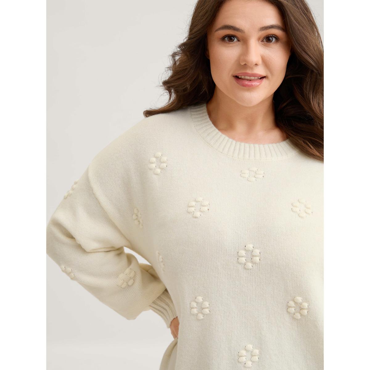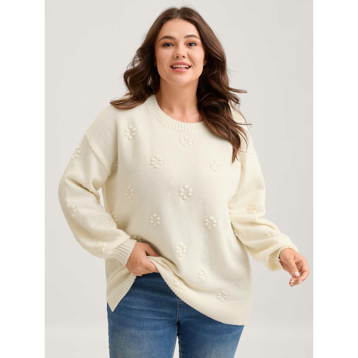 Plus Size Floral Textured Ribbed Hem Pullover Beige Women Playful Loose Long Sleeve Round Neck Casual Pullovers BloomChic 12/L
