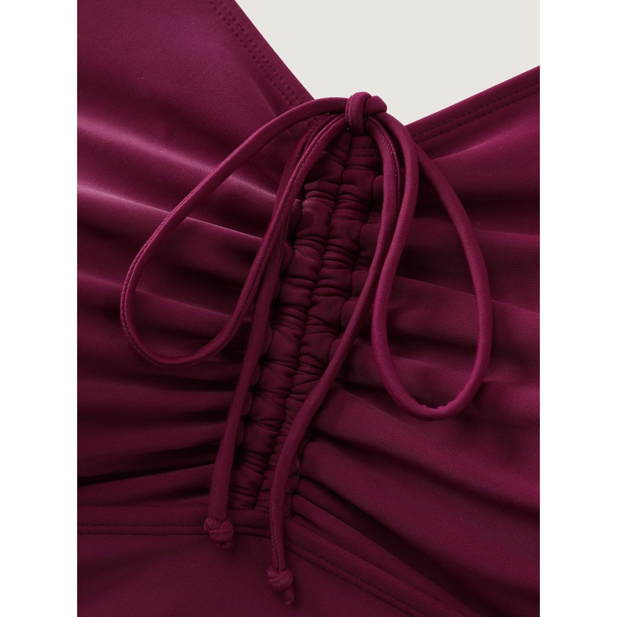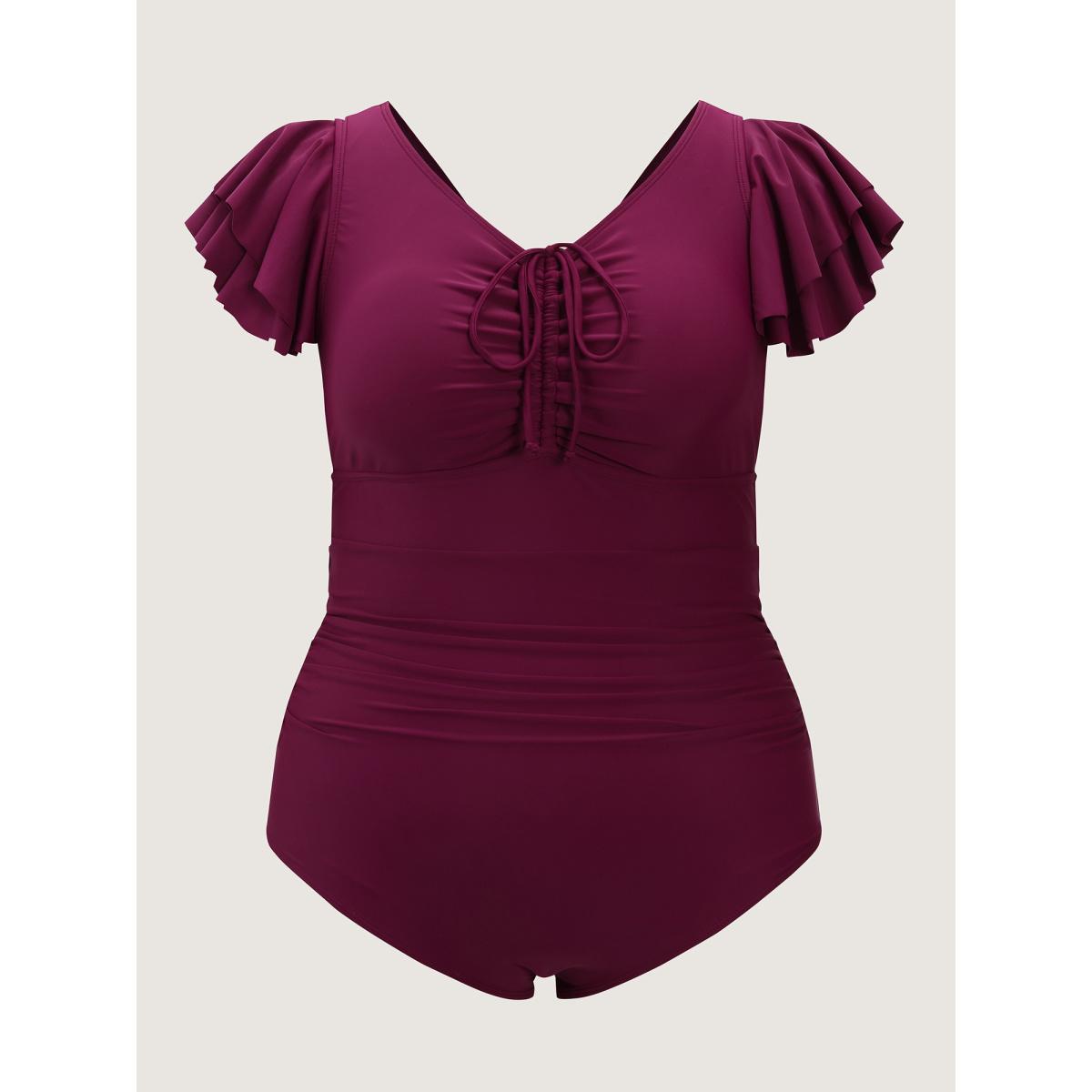 Plus Size Flutter Sleeve Adjustable Drawstring One Piece Swimsuit Women's Swimwear Burgundy Resort Tie knot Curve Bathing Suits High stretch One Pieces BloomChic 30/6X