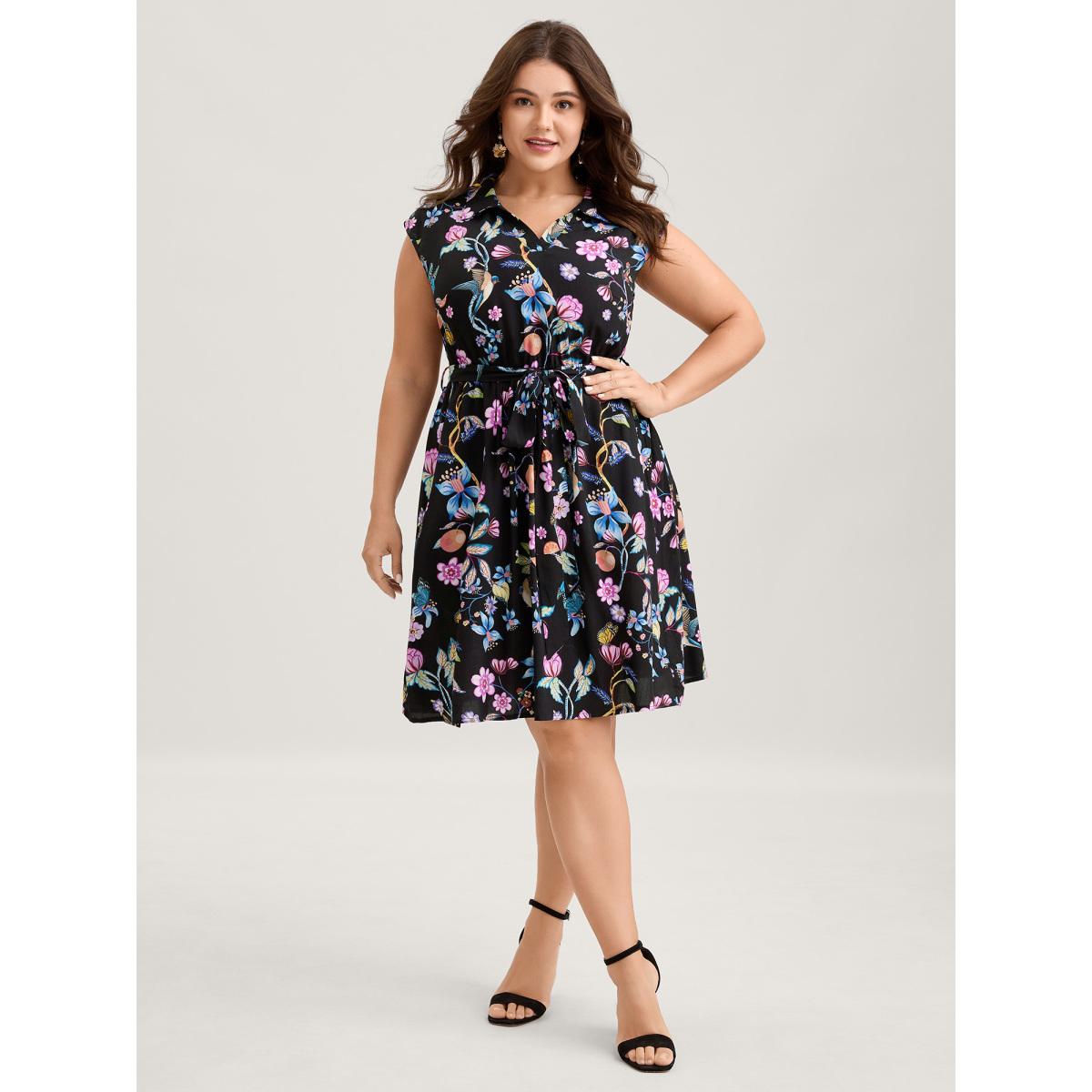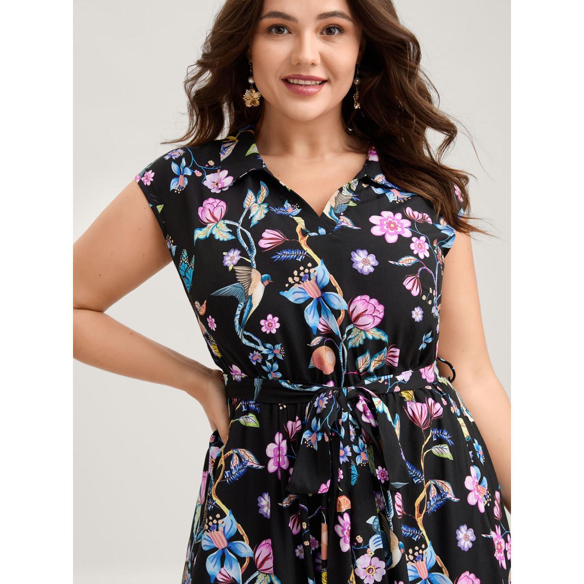 Plus Size Floral Print Surplice Neck Belted Tank Dress Black Women Vacation Belted V-neck Sleeveless Curvy Midi Dress BloomChic 30/6X