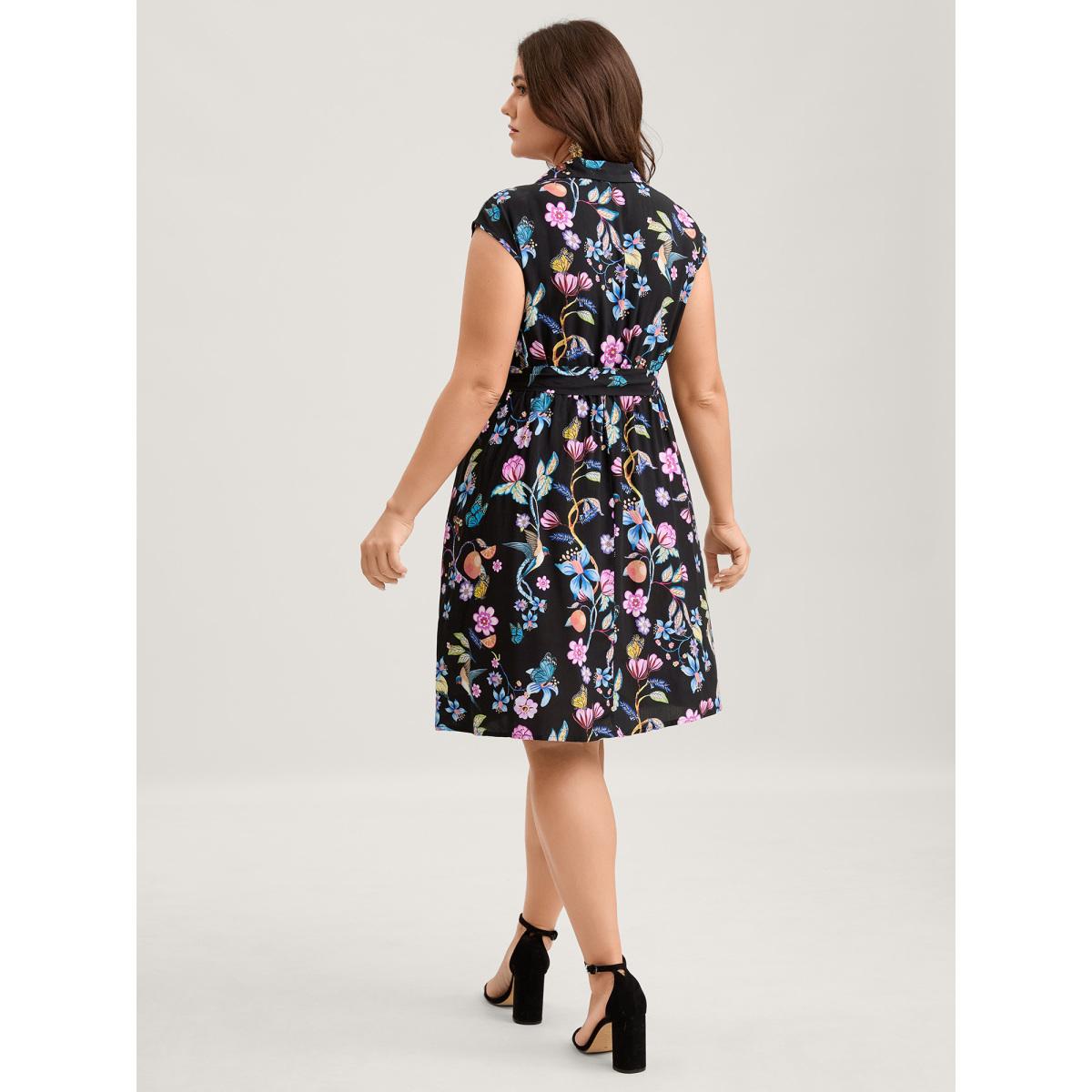 Plus Size Floral Print Waist-Tie Midi Dress Black Women Playful Printed V-neck Cap Sleeve Curvy BloomChic 26/4X