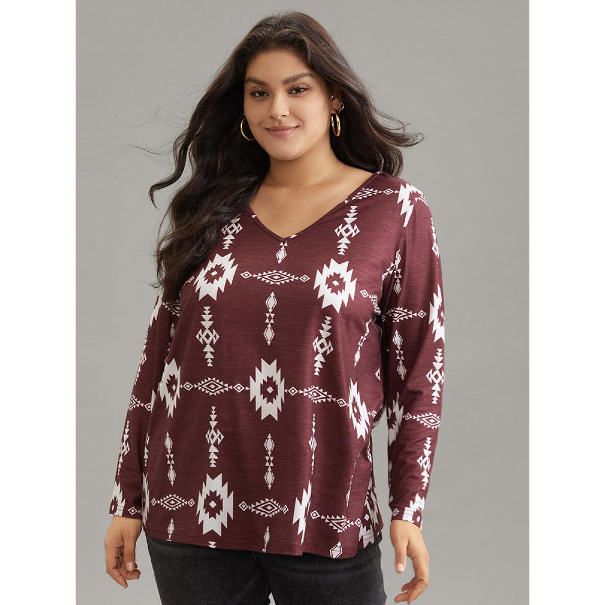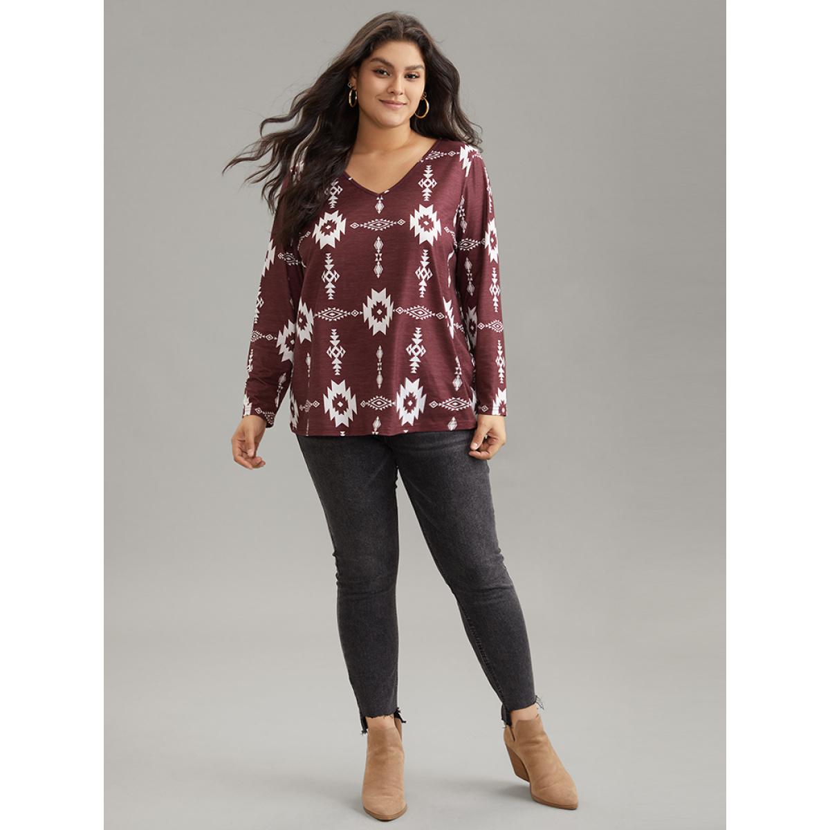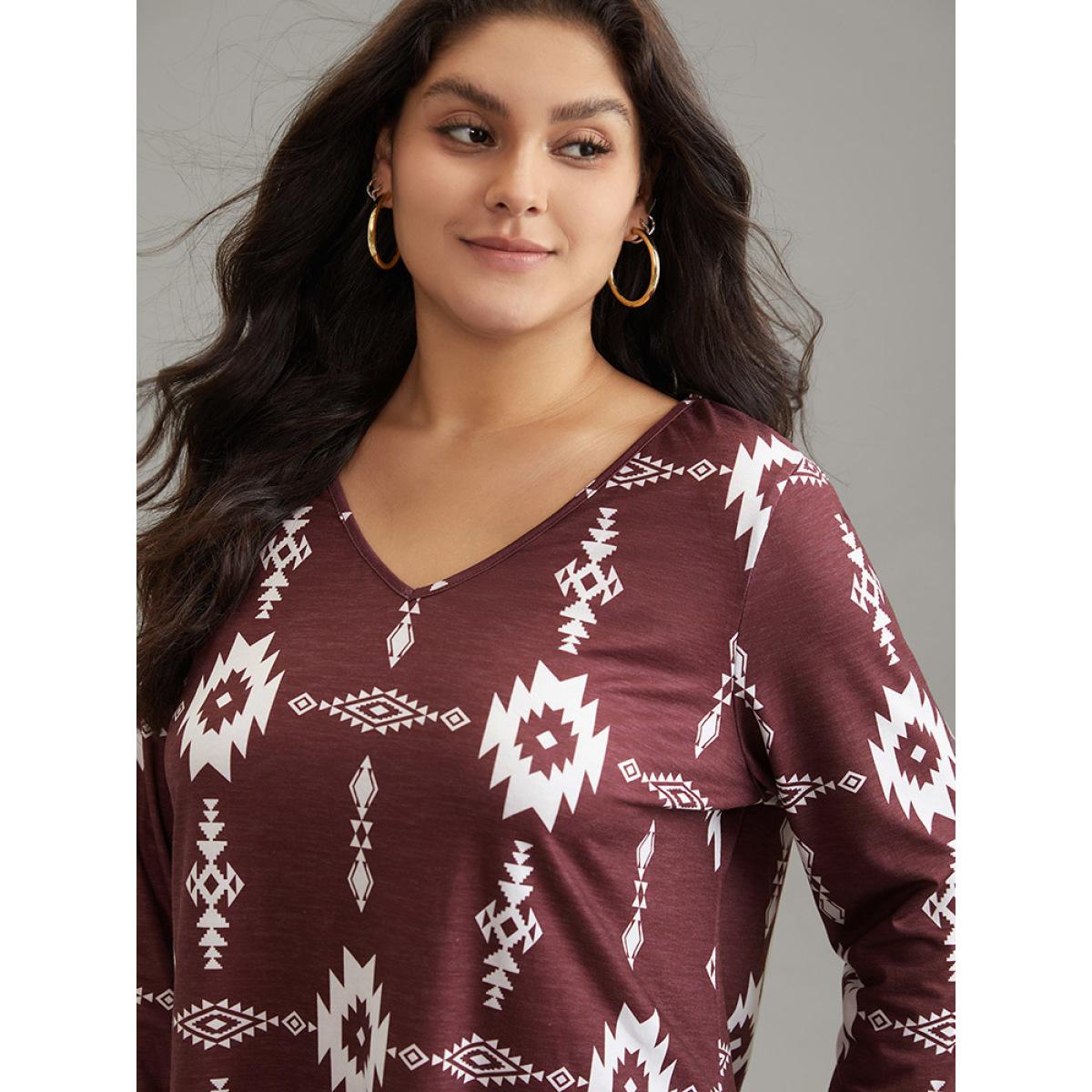 Plus Size Geo & Bandana Print V Neck T-shirt Burgundy Women Casual Printed Bohemian Print V-neck Dailywear T-shirts BloomChic 28/5X