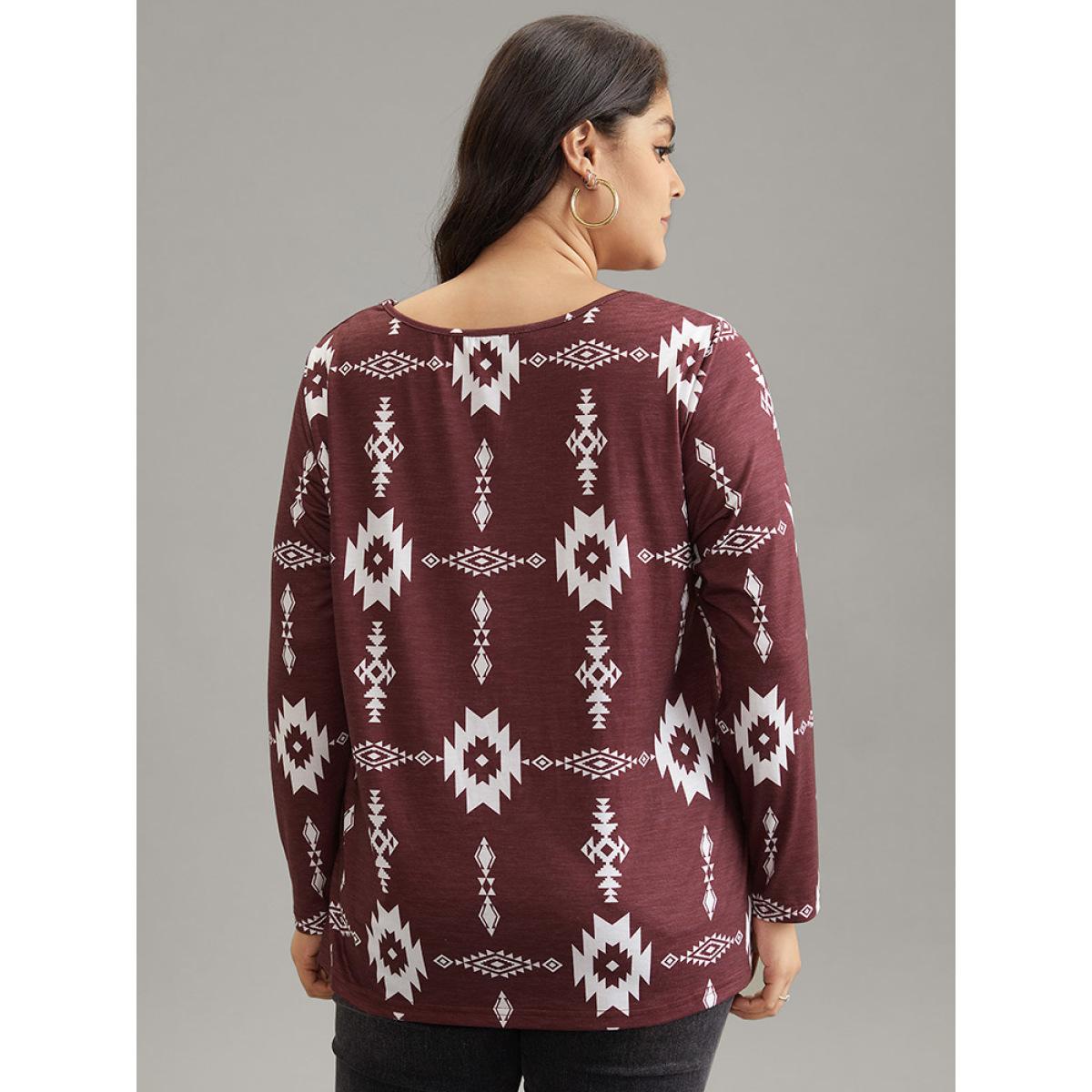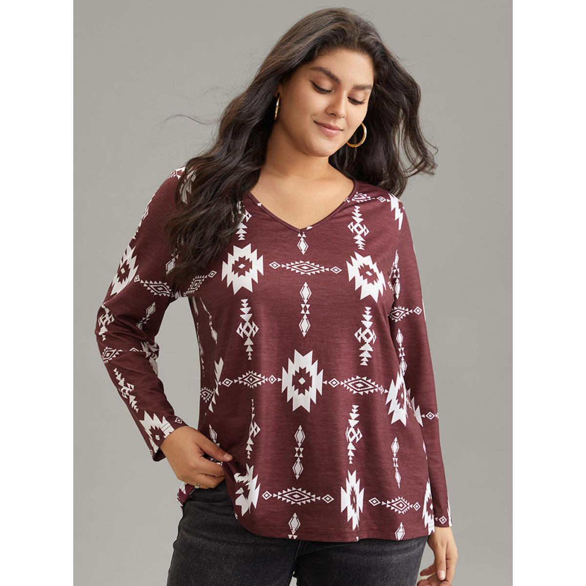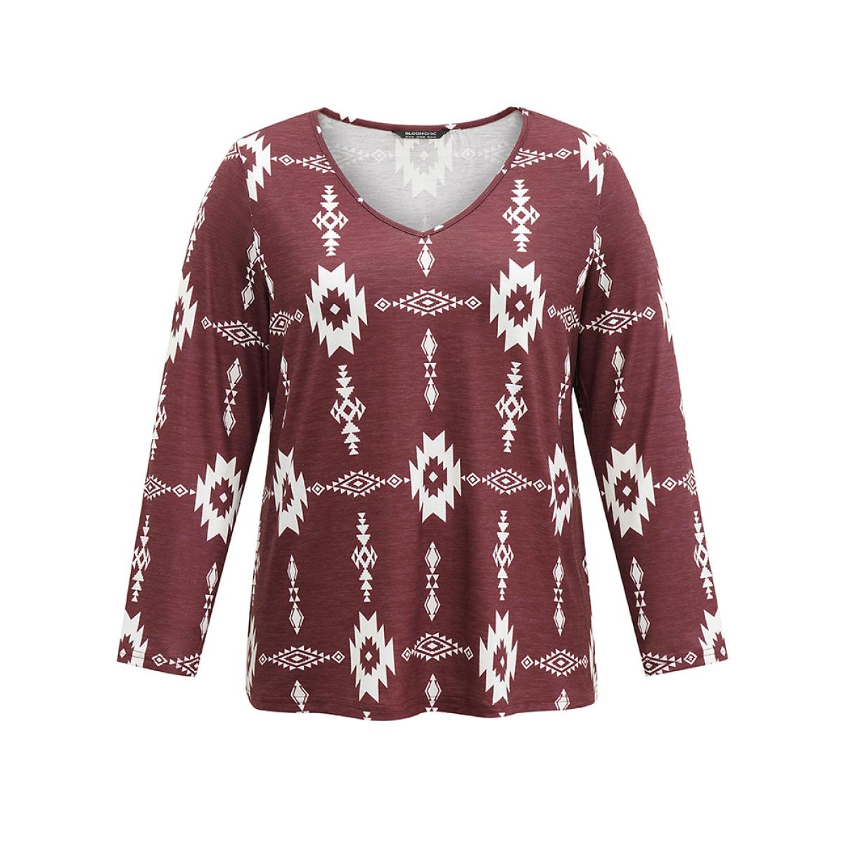 Plus Size Geo & Bandana Print V Neck T-shirt Burgundy Women Casual Printed Bohemian Print V-neck Dailywear T-shirts BloomChic 28/5X