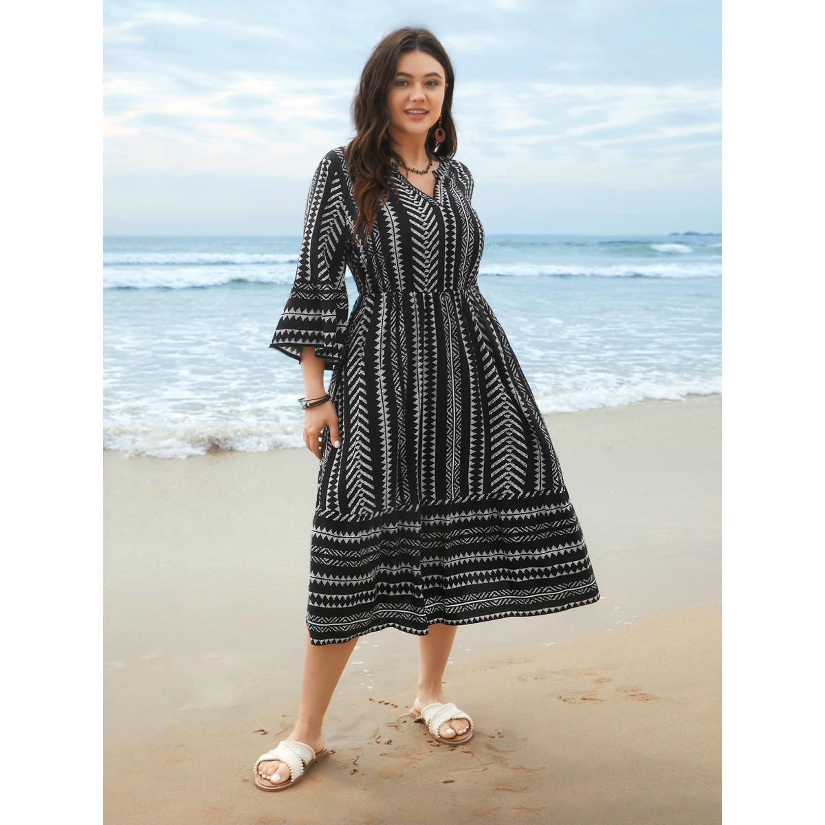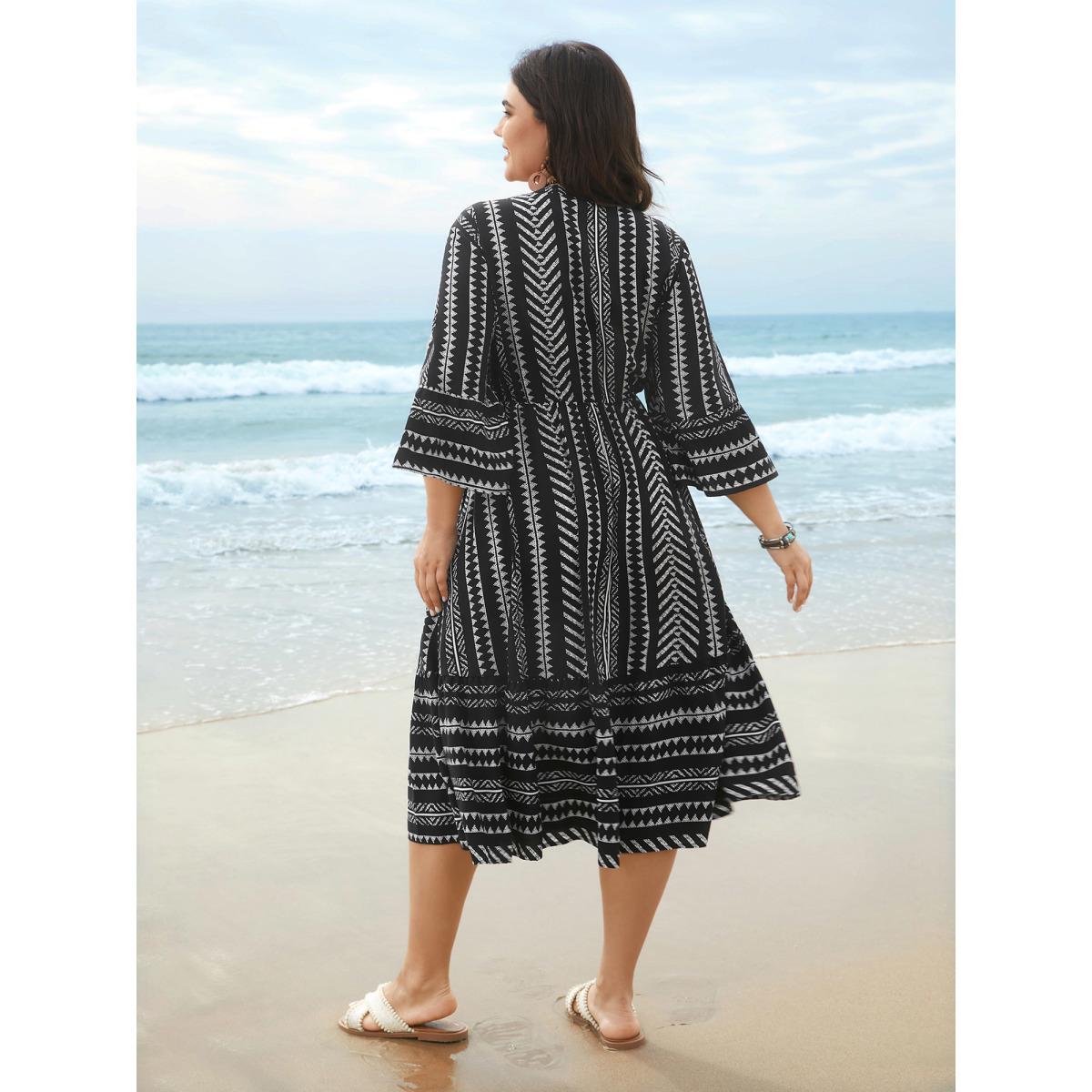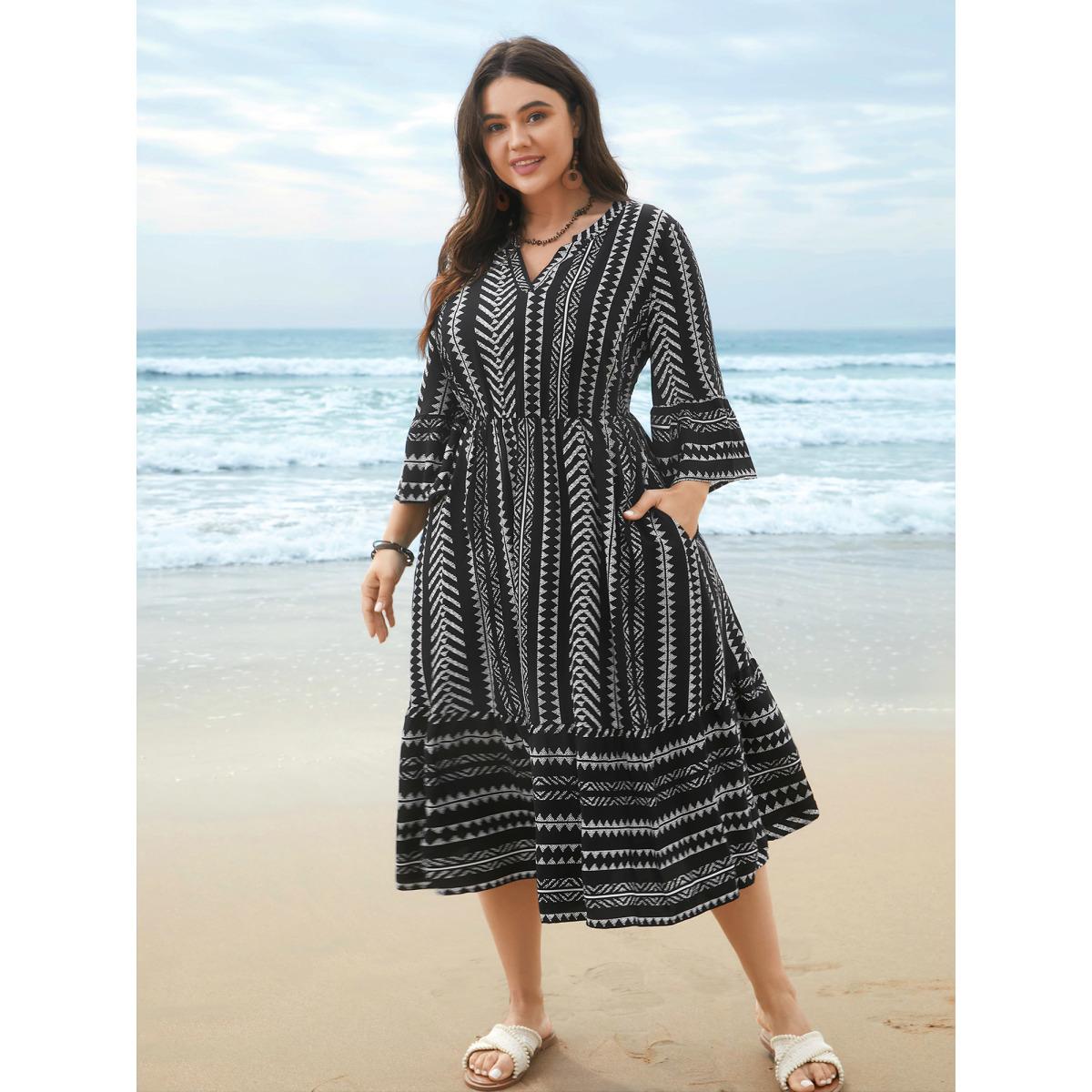 Plus Size Geo Print Stretchy-Waist Tiered Skirt Midi Dress BlackFlower Women Resort Non Flat collar with V-notch Elbow-length sleeve Curvy BloomChic 30/6X