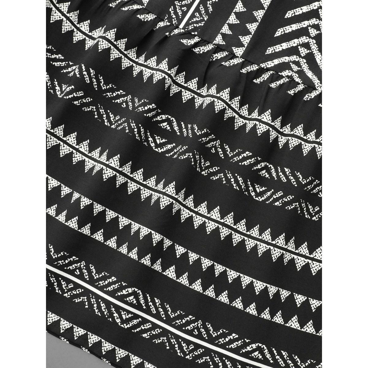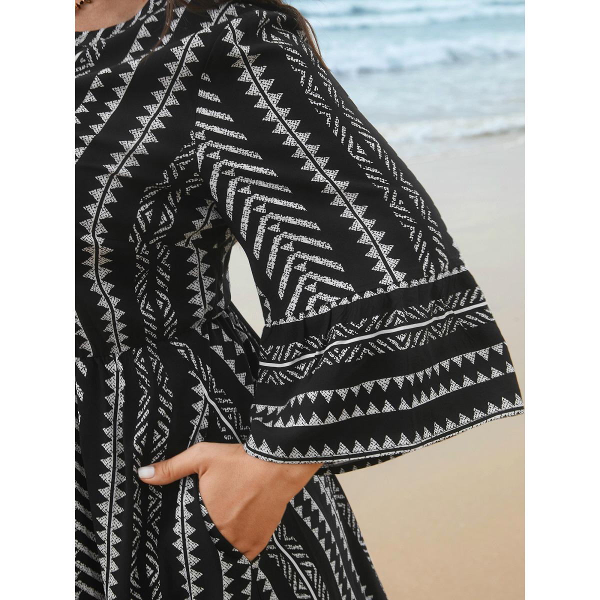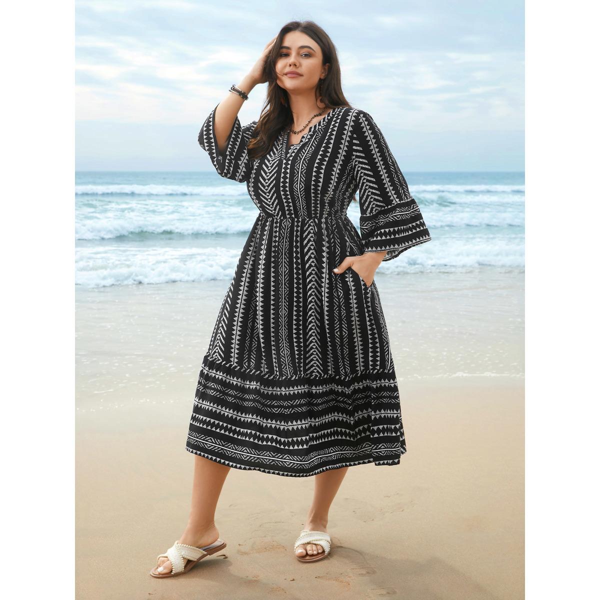 Plus Size Geo Print Stretchy-Waist Tiered Skirt Midi Dress BlackFlower Women Resort Non Flat collar with V-notch Elbow-length sleeve Curvy BloomChic 30/6X