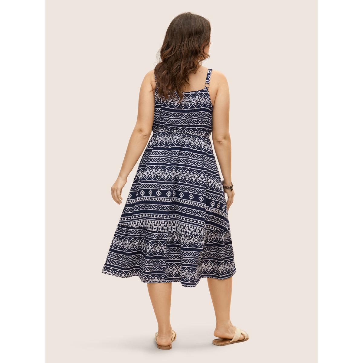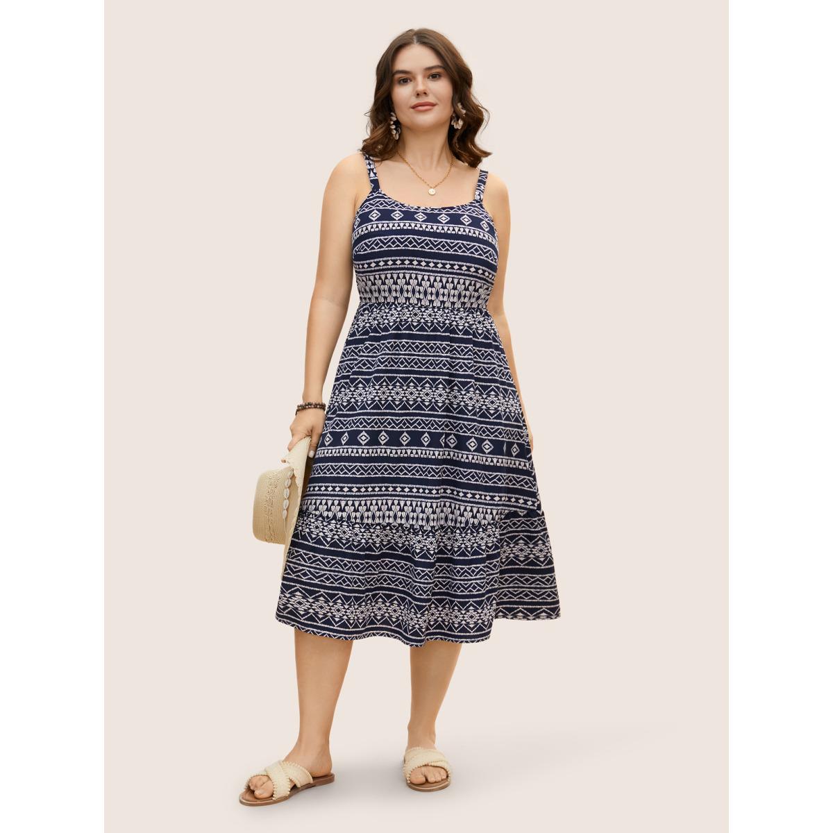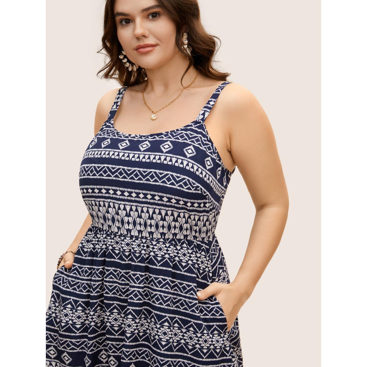 Plus Size Geometric Bandana Print Elastic Waist Midi Dress DarkBlue Women Resort Non Round Neck Sleeveless Curvy BloomChic 22-24/3X