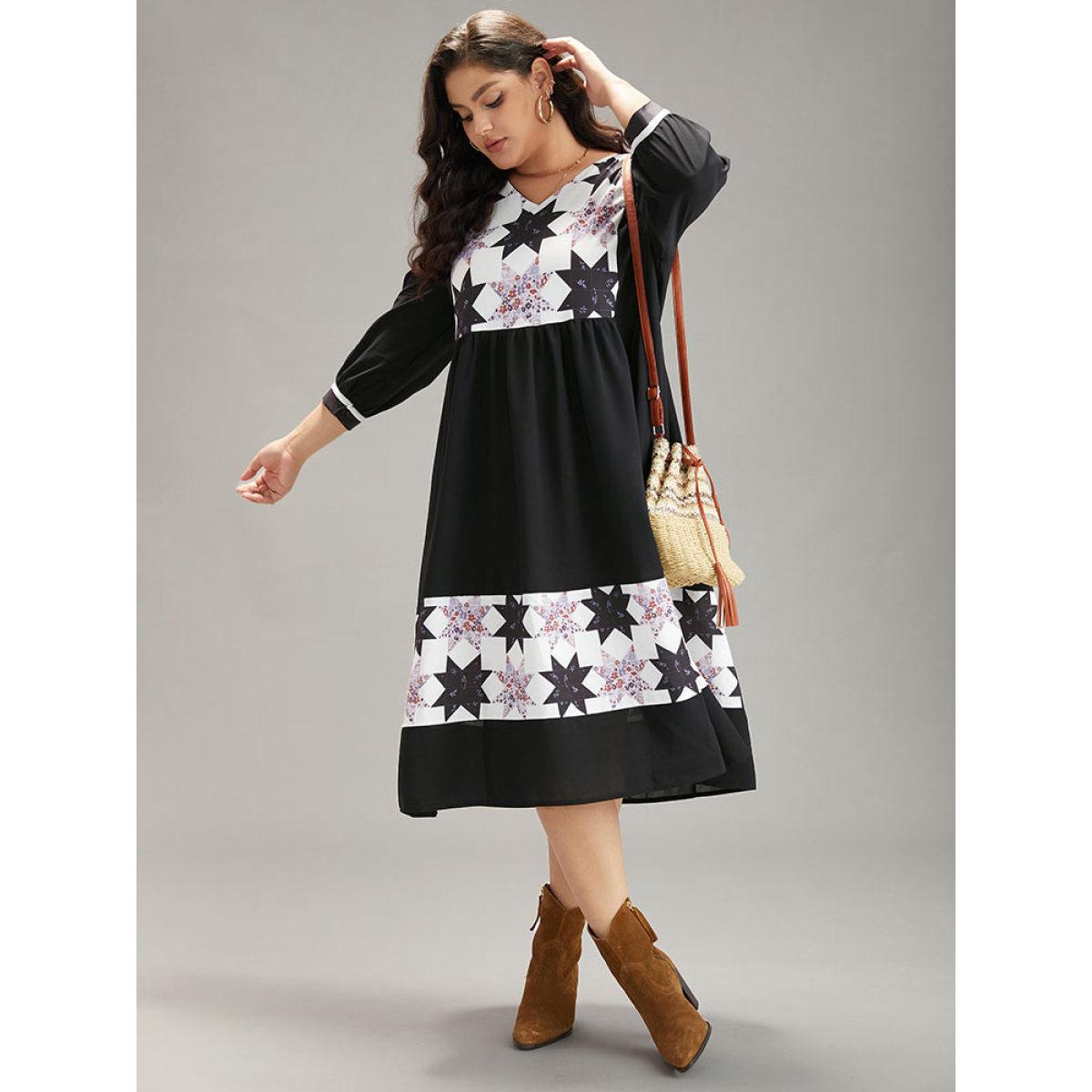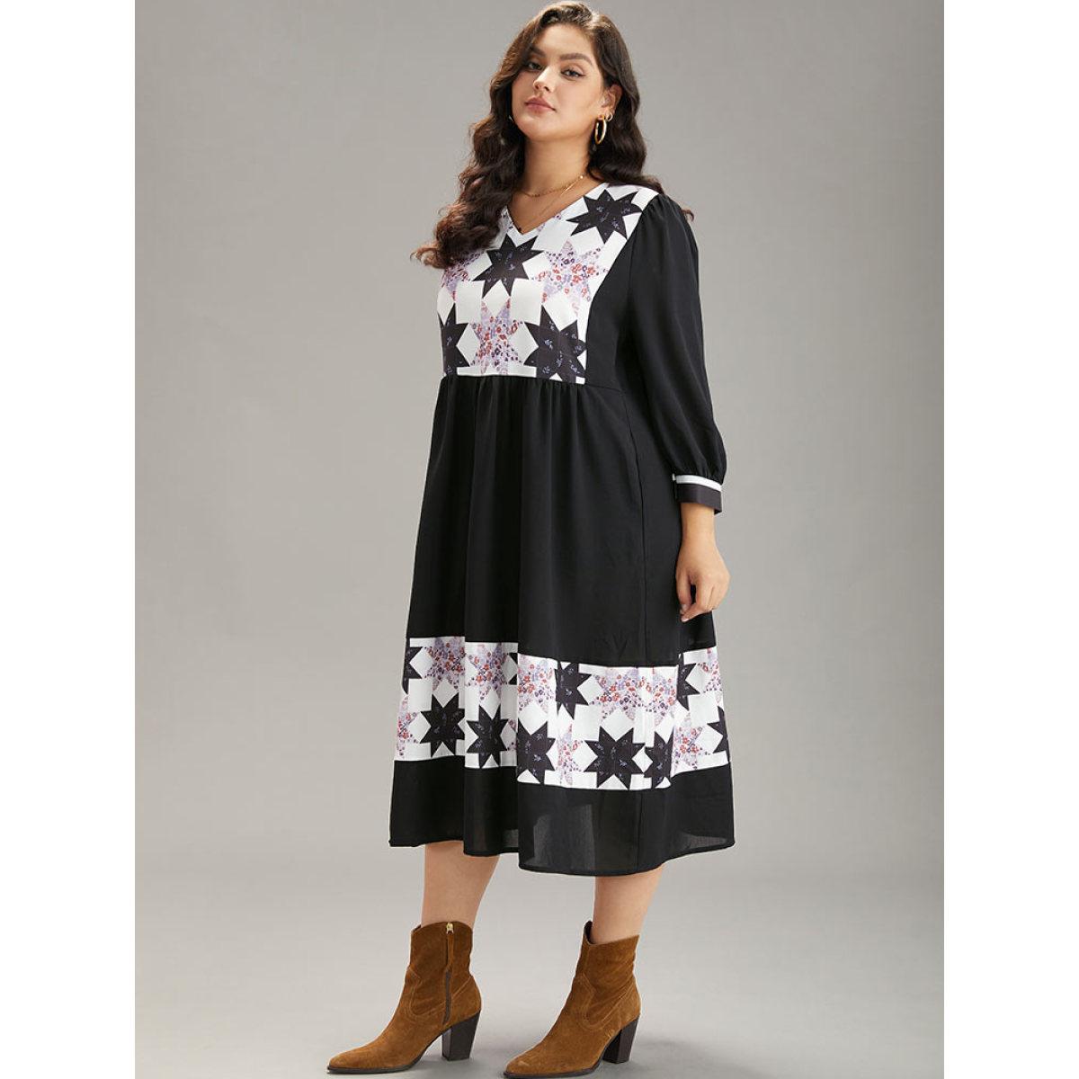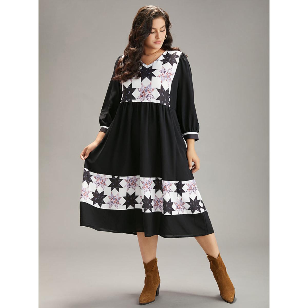 Plus Size Geometric Colorblock Pocket Gathered Dress Black Women Vacation Printed V-neck Elbow-length sleeve Curvy Midi Dress BloomChic 26/4X