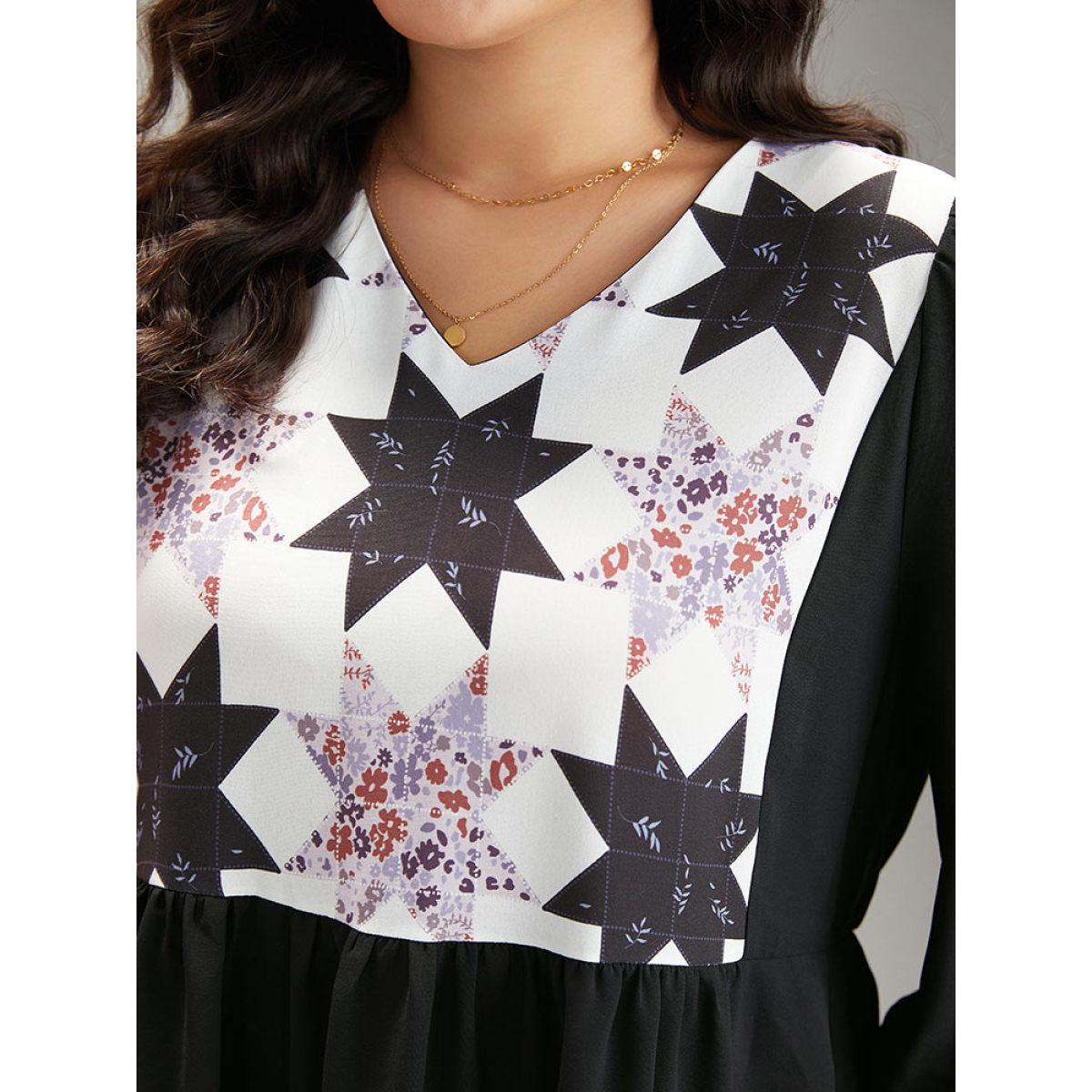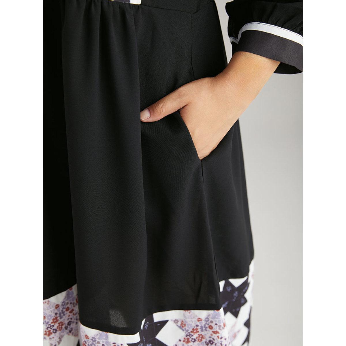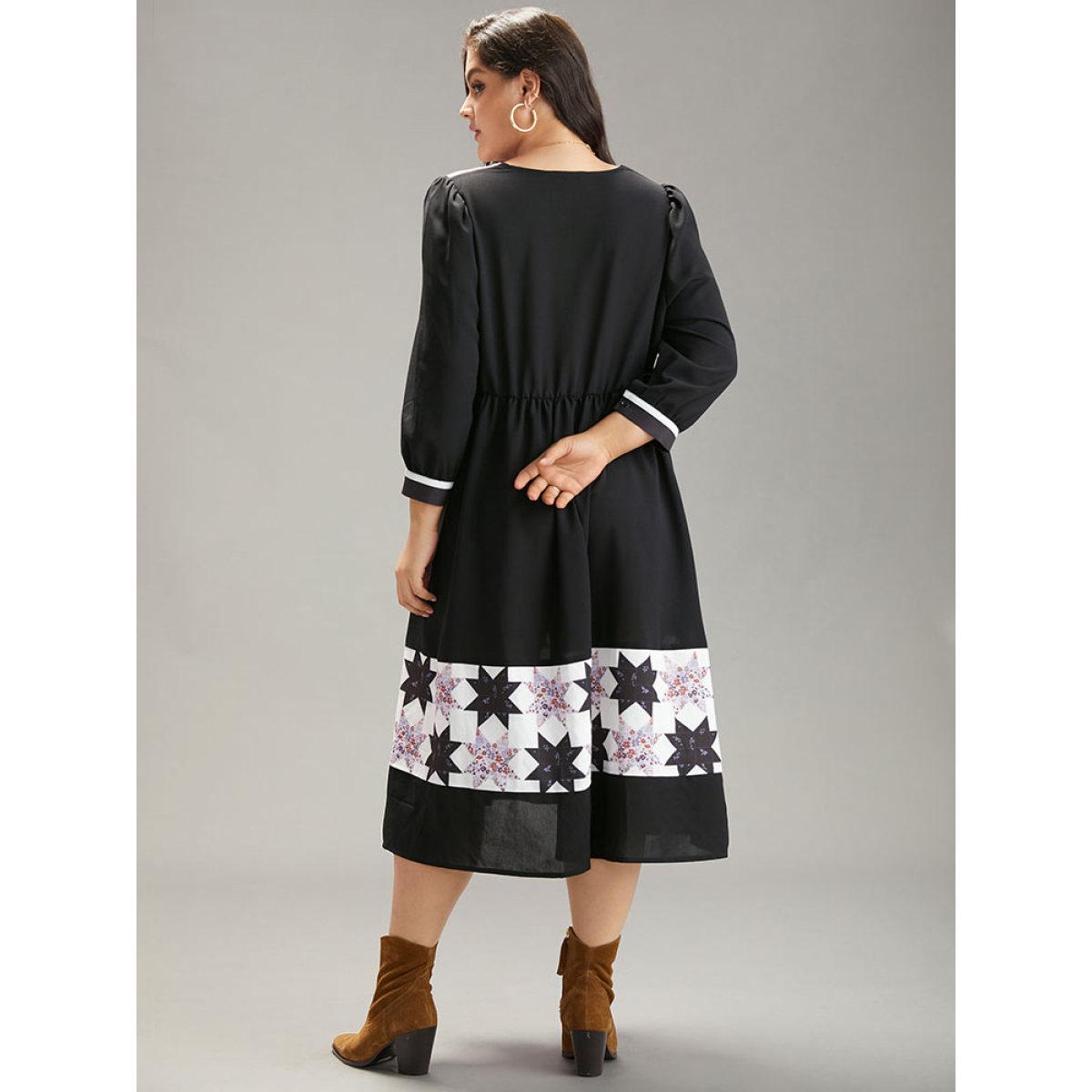 Plus Size Geometric Colorblock Pocket Gathered Dress Black Women Vacation Printed V-neck Elbow-length sleeve Curvy Midi Dress BloomChic 26/4X