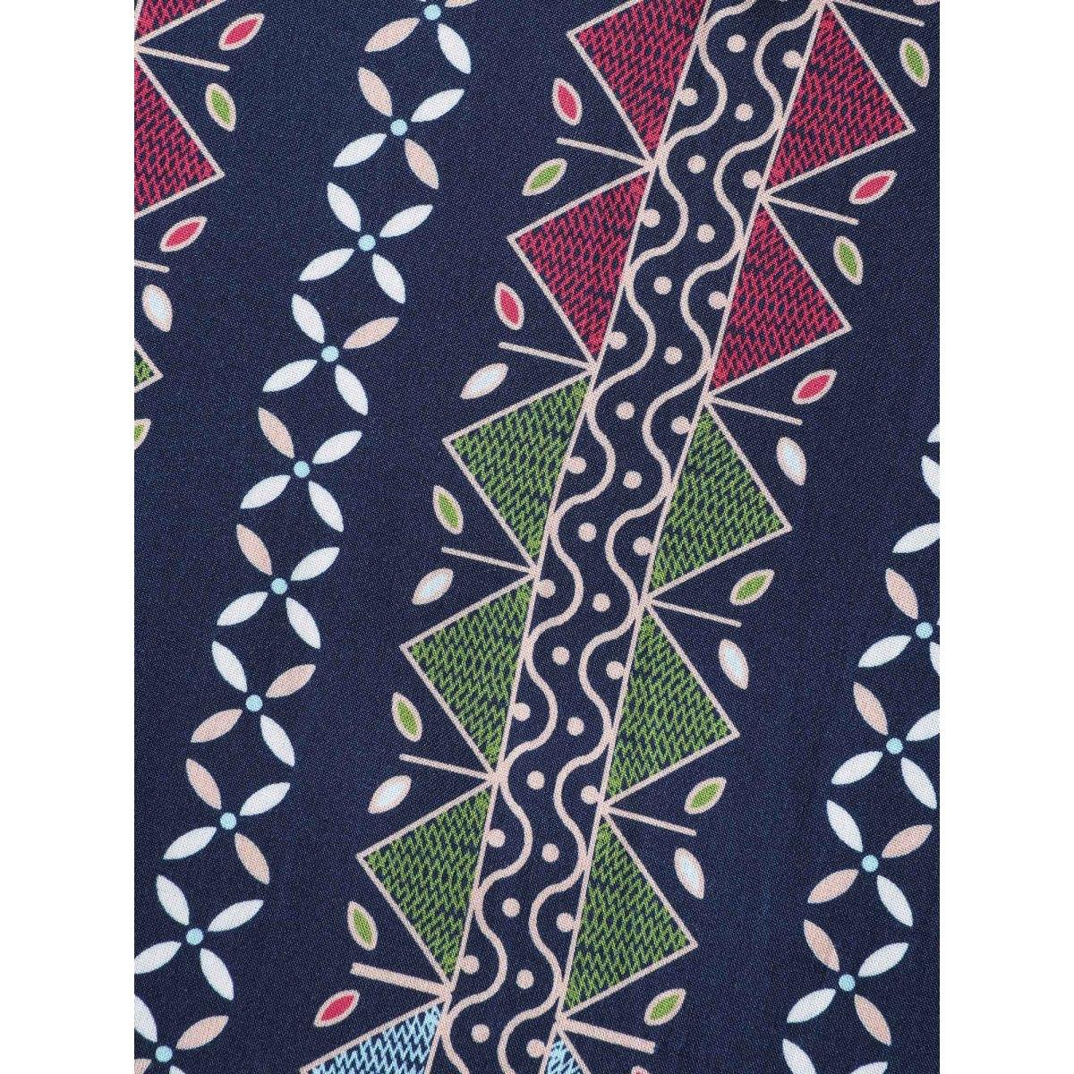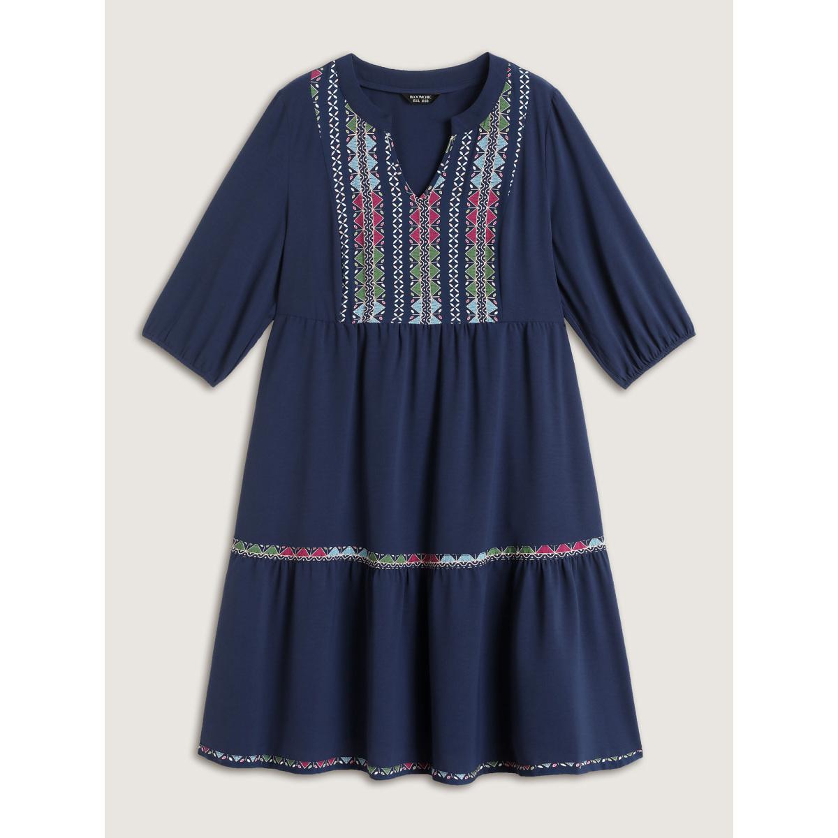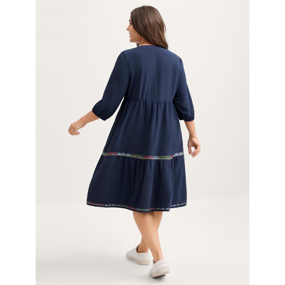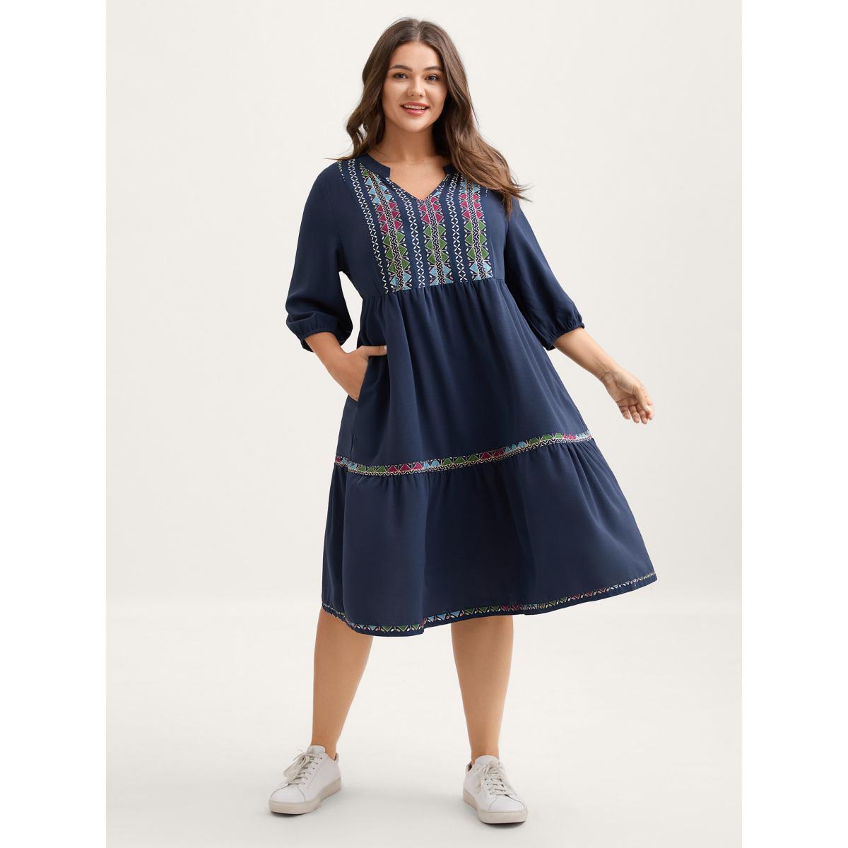Plus Size Geometric Colorful Trim Flowy Midi Dress Indigo Women Leisure Gathered Flat collar with V-notch Extra Long Sleeve Curvy BloomChic 18-20/2X